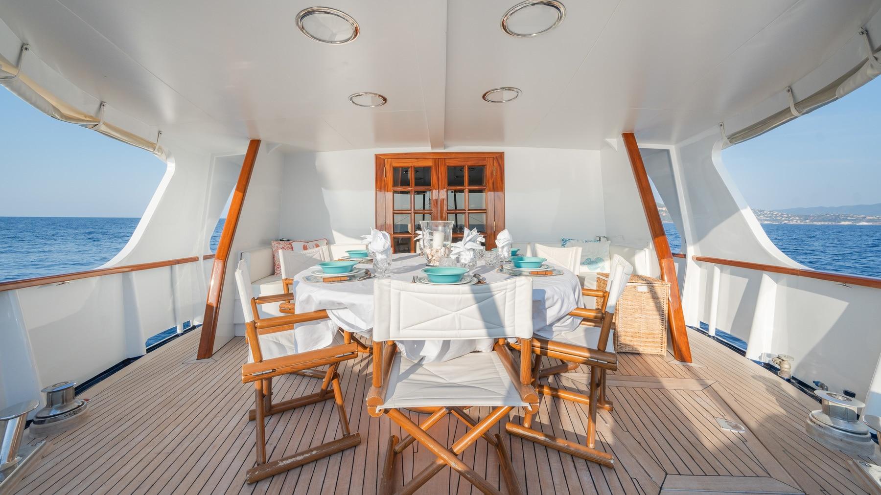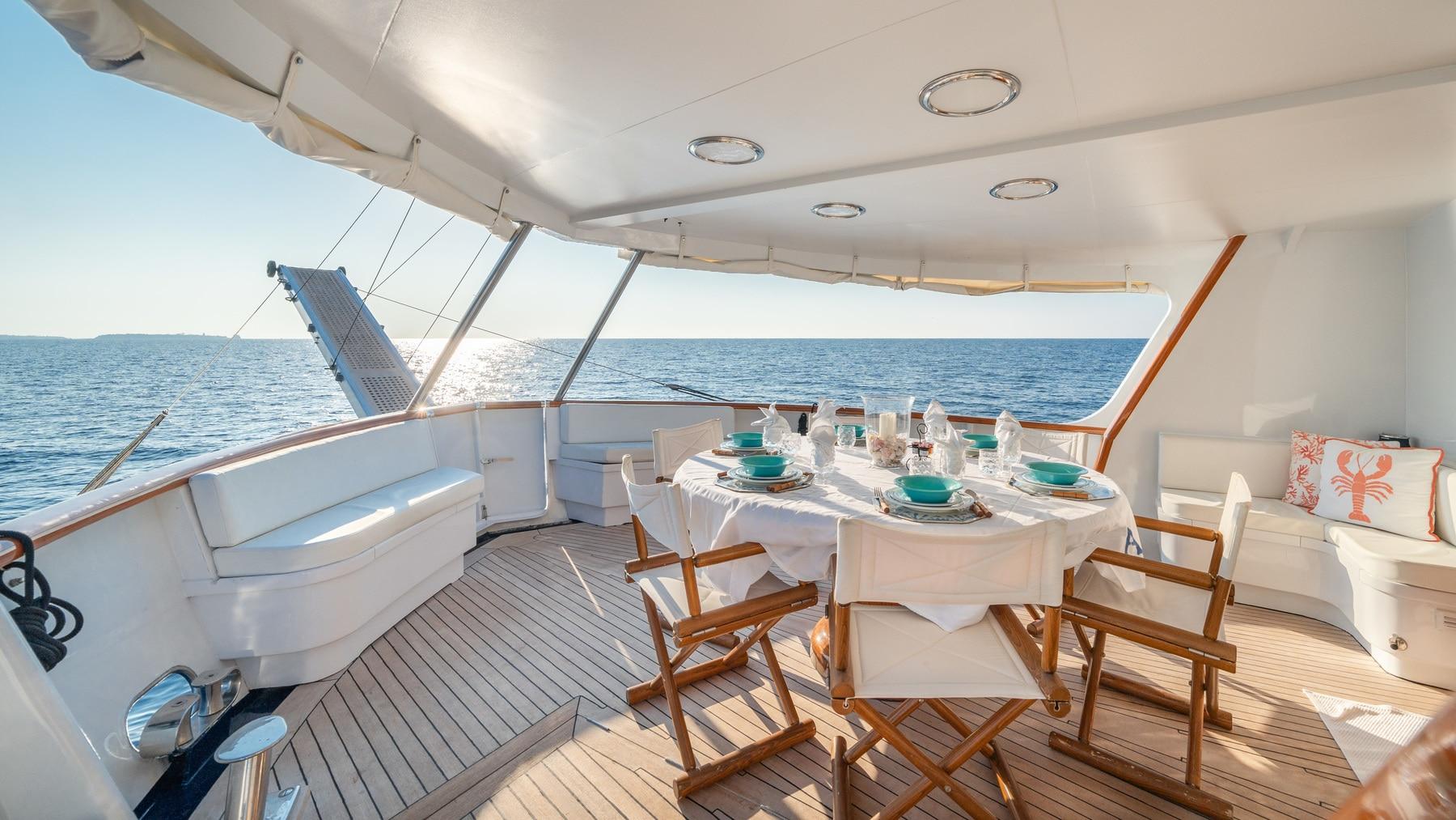 One of the yacht's standout features is its expansive flybridge. In 2022, a thoughtful modification moved the stack forward, further enhancing the deck space. This update created room for four deck chairs and a spacious aft dining area, comfortably seating up to 10 guests.