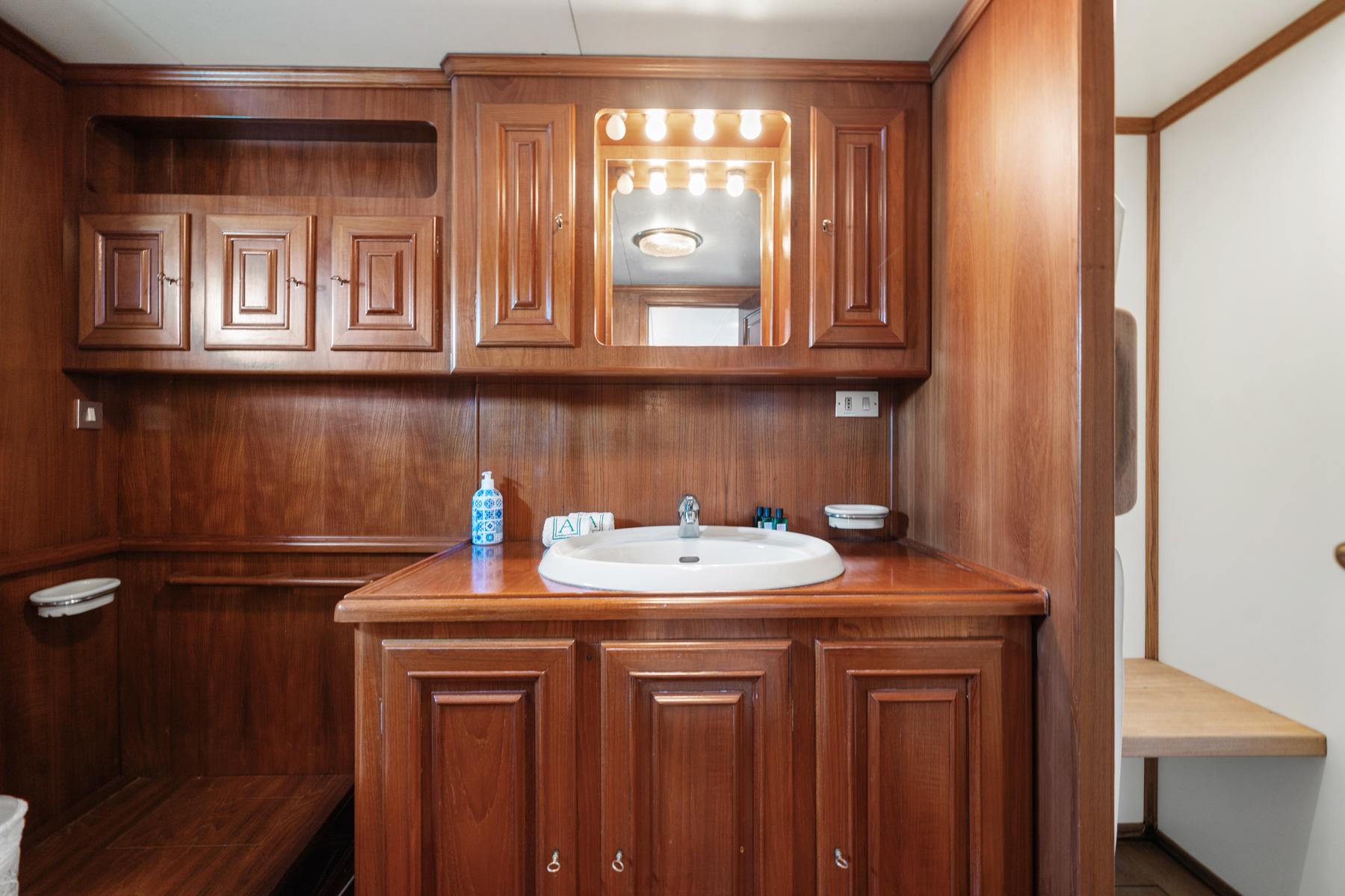 The separate guest accommodations are located forward of the main salon, accessible via their own private staircase. This area includes a luxurious double VIP cabin, complete with its own en suite bathroom, as well as two twin cabins, each featuring en suite facilities.
