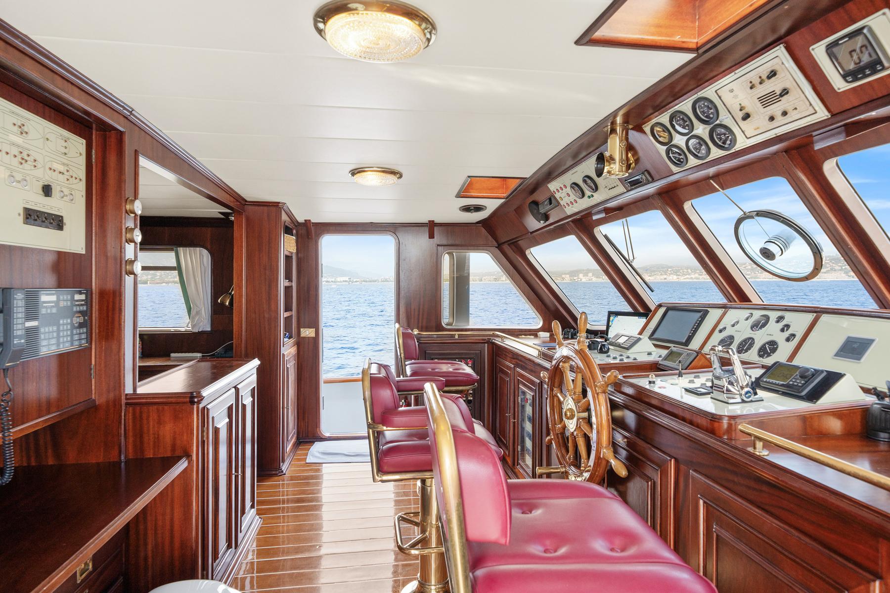 The classic wheelhouse is equipped with three bronze navigation seats, each upholstered in rich burgundy leather. The design stays true to the vessel's classic style while incorporating modern features, including upgraded Furuno navigation systems. To the port side, there is a spacious captain's office with easy access to both the port and starboard wing stations.