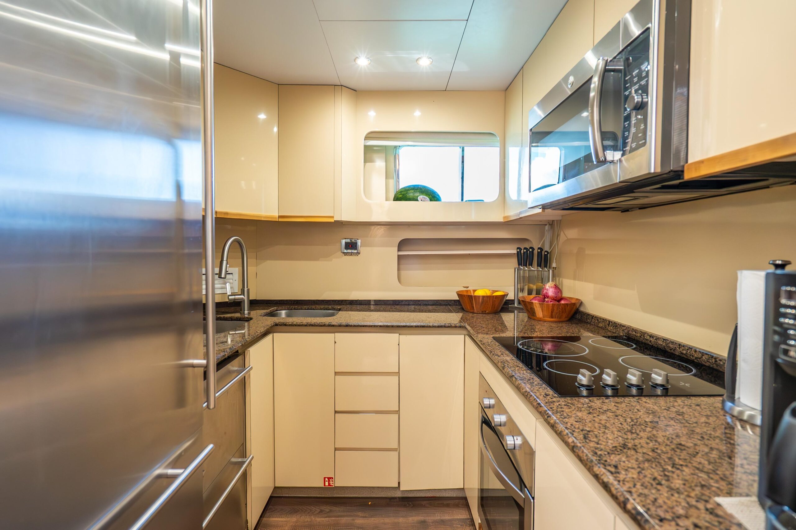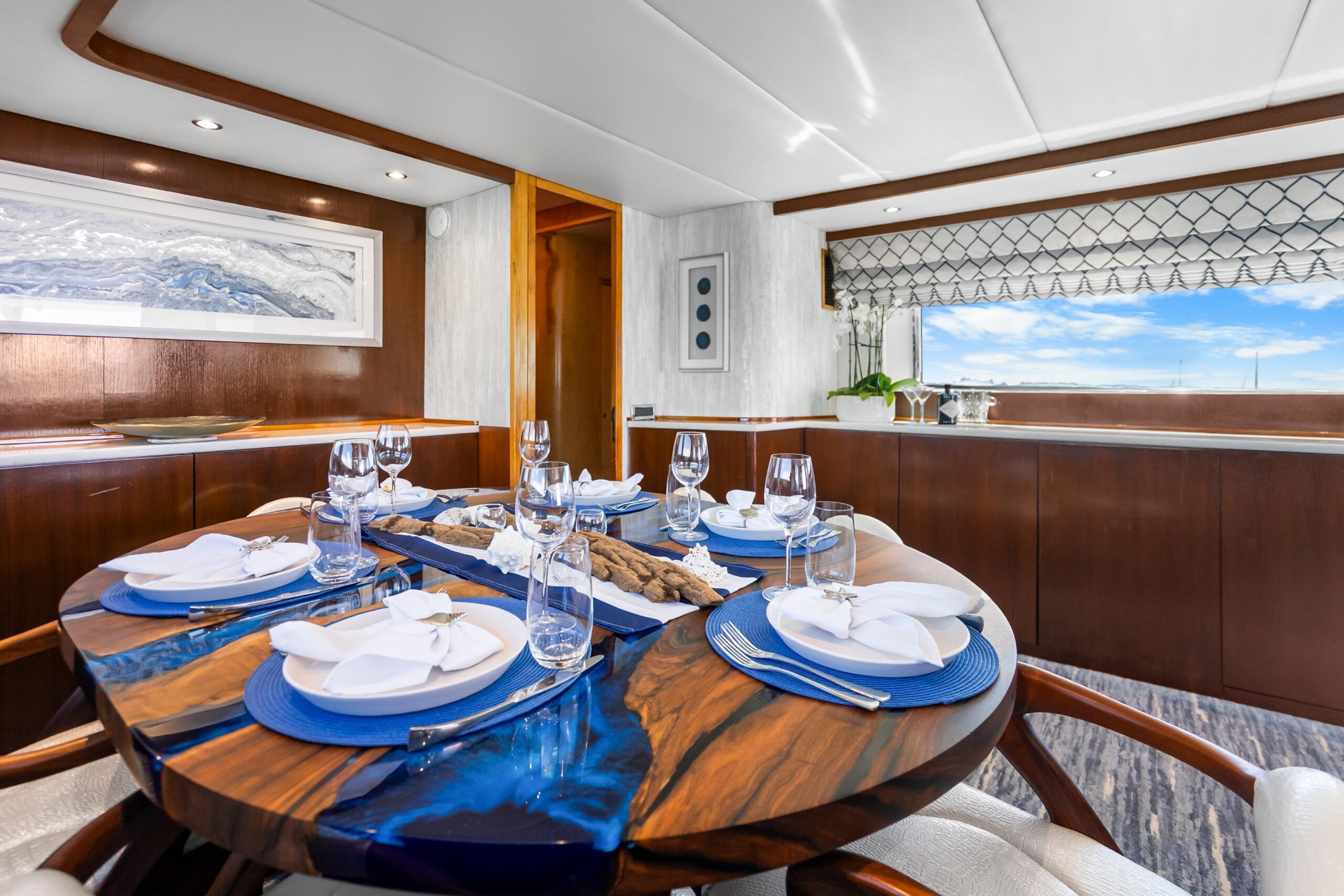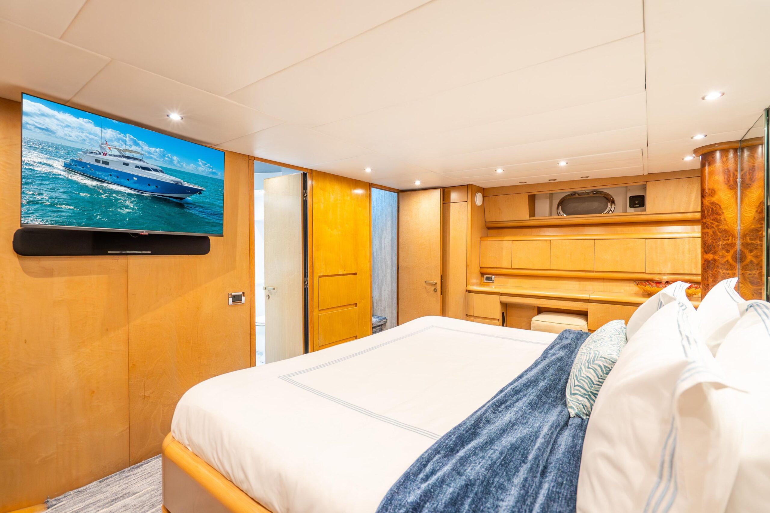 The yacht accommodates up to eight guests in the owner's party across four well-appointed staterooms, plus crew accommodations for two in one cabin. The Master cabin features a king-size bed, ensuite and Apple TV. The VIP stateroom includes a queen bed, ensuite and Apple TV. On the starboard side, there is a twin cabin with an ensuite and Apple TV, mirrored by another twin cabin on the port side offering the same amenities. The crew quarters provide comfortable accommodations for two, complete with an ensuite and Apple TV.