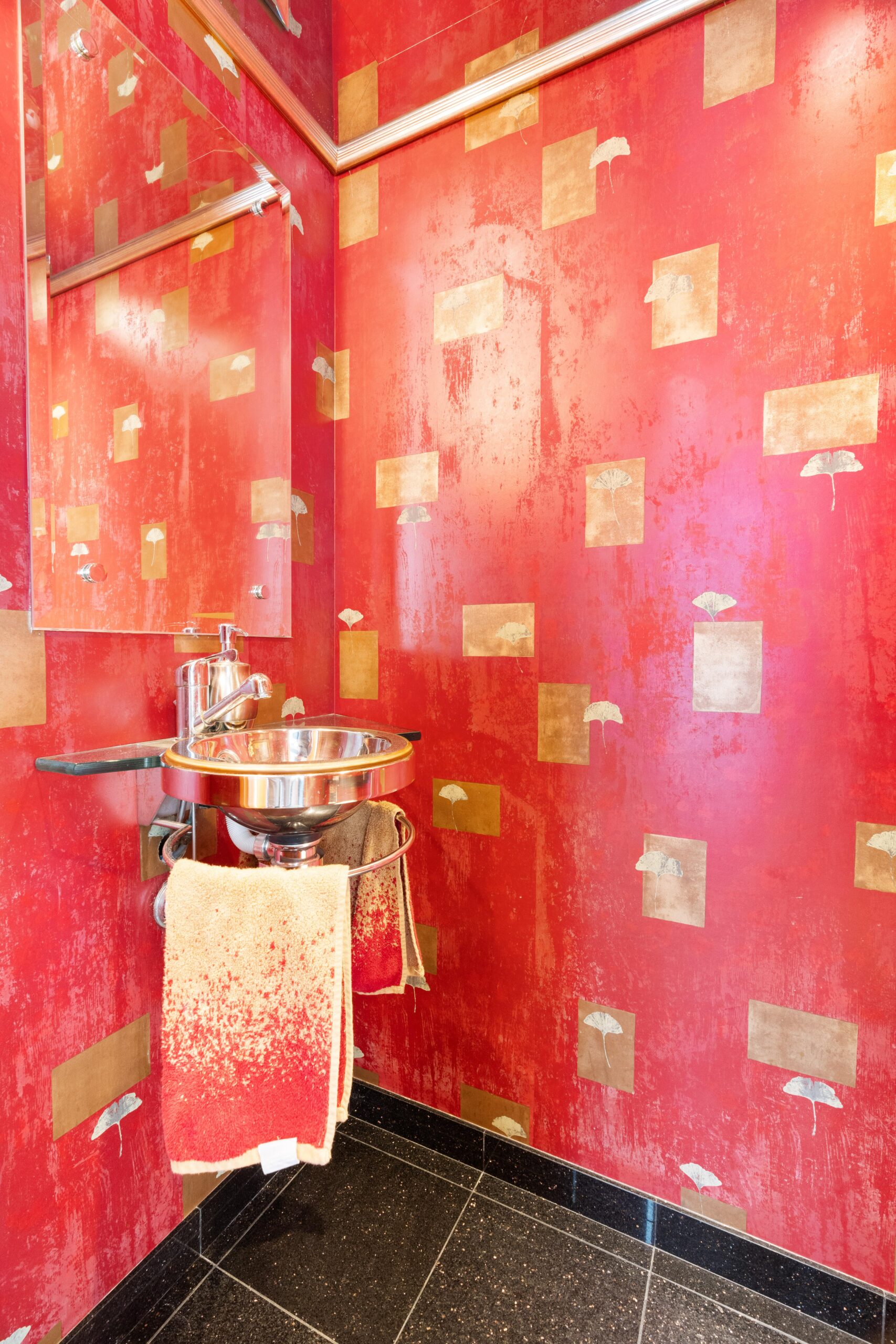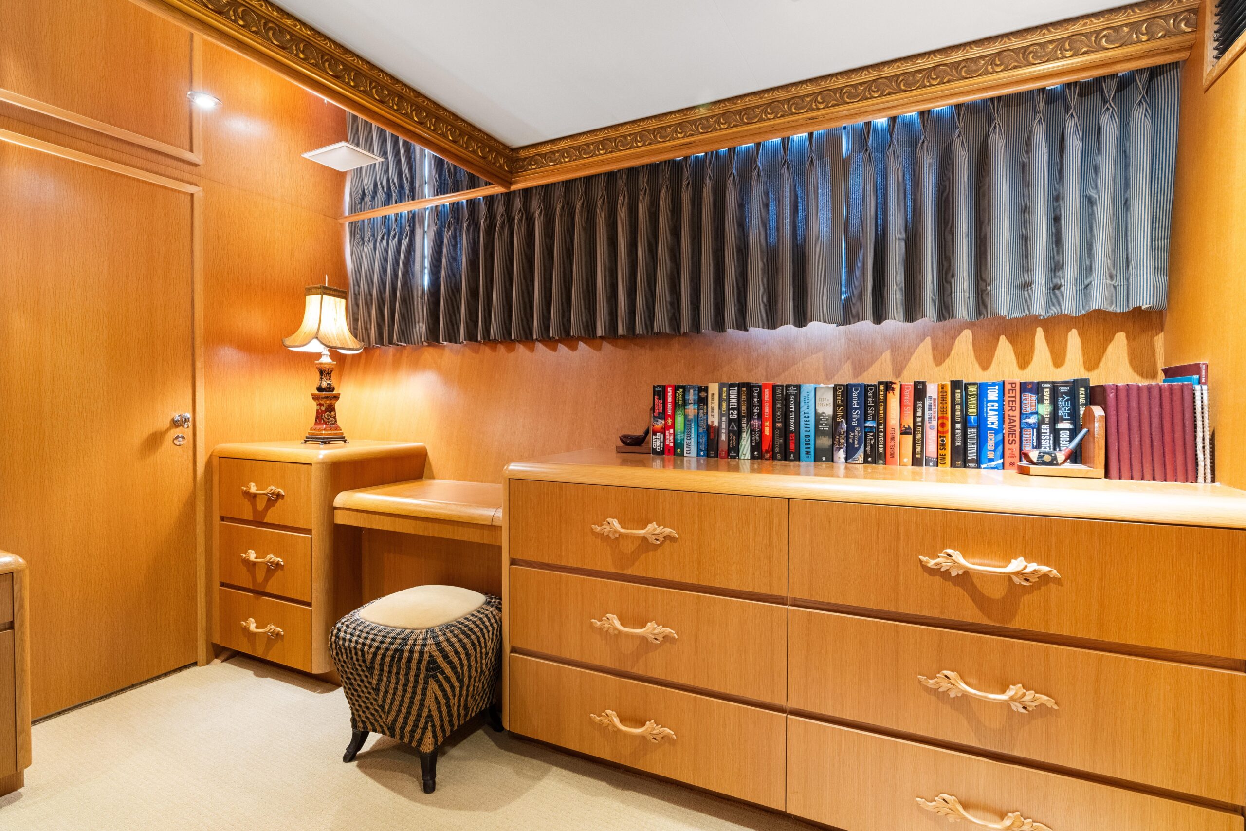You descend to the family cabin area via a gracious carpeted curved stairway with step lights and a varnished teak handrail. It leads to an inviting carpeted foyer off which are the wooden doors for the two guest cabins, a cedar-lined linen closet, a laundry closet with new (2023) washer and dryer, a utility closet, and elegant double doors to the master cabin.