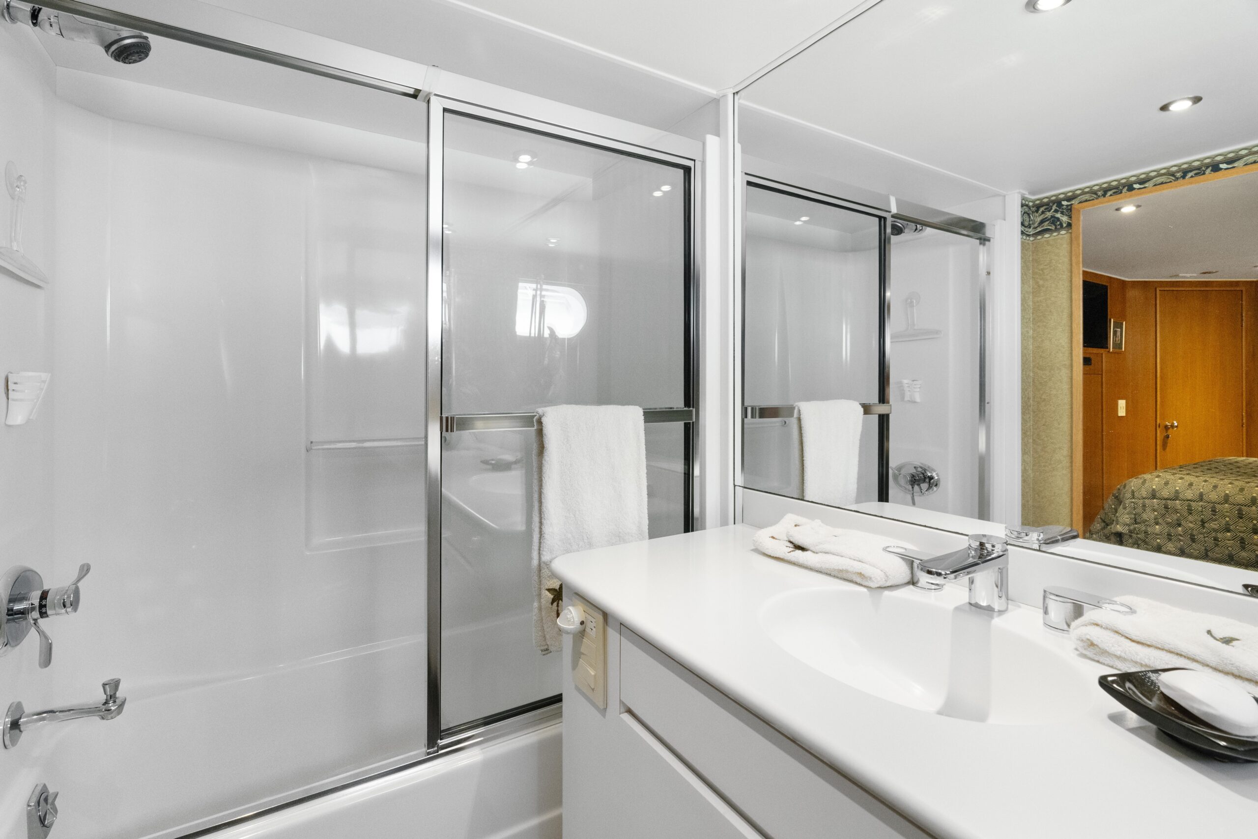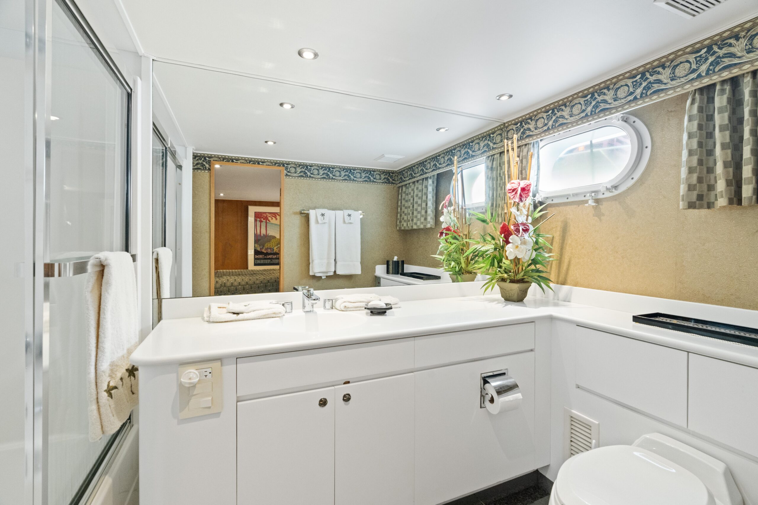 The VIP guest cabin is designed for comfort and elegance, featuring a queen berth with ample drawers and storage beneath, complemented by carpet flooring and vinyl-upholstered overhead panels. Amenities include a 32" Samsung flat-screen TV, DirecTV receiver, stereo,  A/C, cedar-lined wardrobes with hanging rails and courtesy lights, and dressers with drawer storage, offering a luxurious and functional retreat for guests.