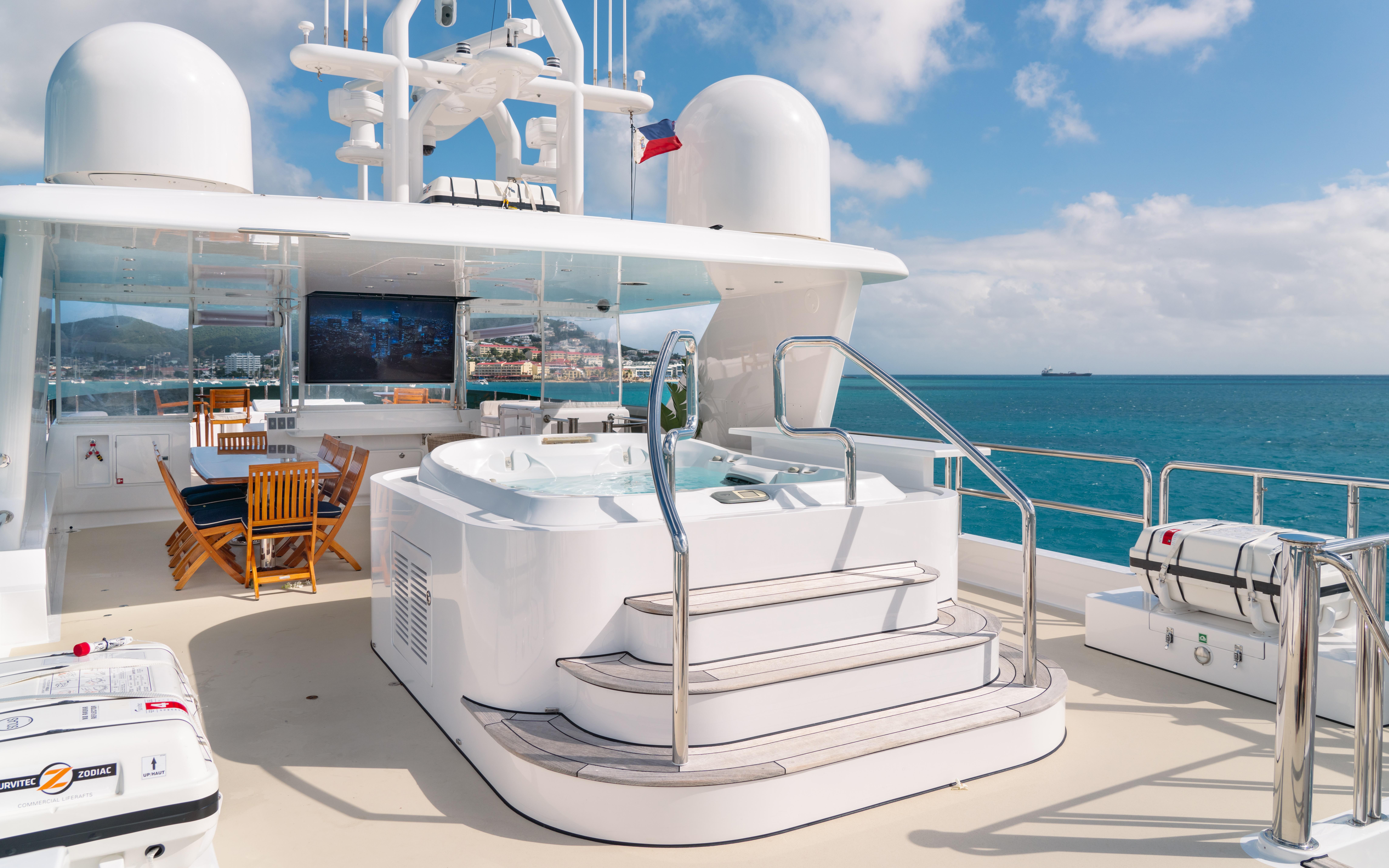 She is today one of the most successful charter yachts in the global fleet. Her established charter history is a result of her fantastic range of on board features for large groups. Her expansive sundeck is complete with shade sails, a four person sun bed, loungers, comfortable helm seats, a BBQ and a Jacuzzi. The bright skylounge and bar has exceptionally large windows while her upper aft deck is complete with wet bar and wrap around teak decks.