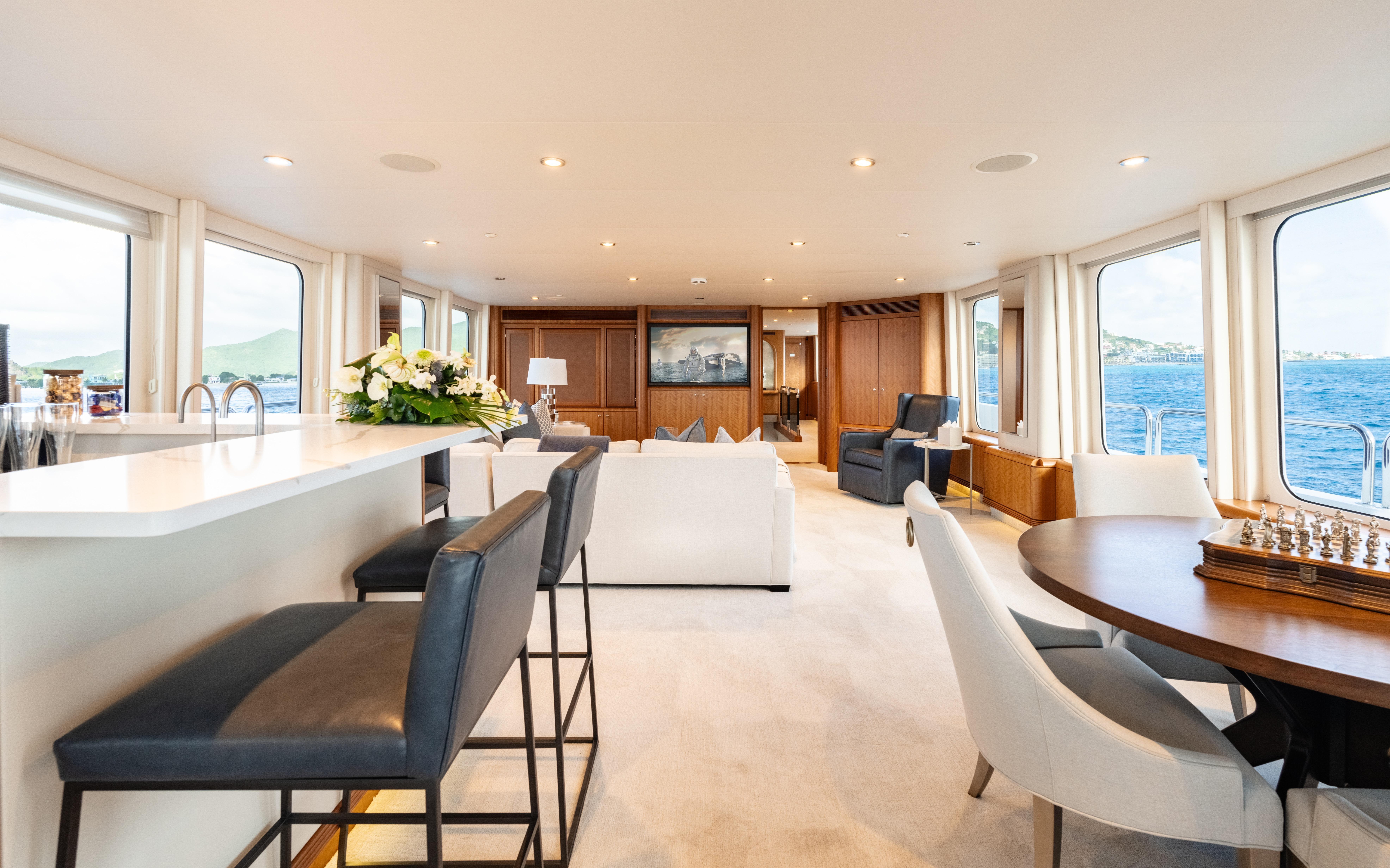 • Bright Sky lounge and bar with large windows and socially designed upper aft deck complete with wet bar and wrap around teak decks