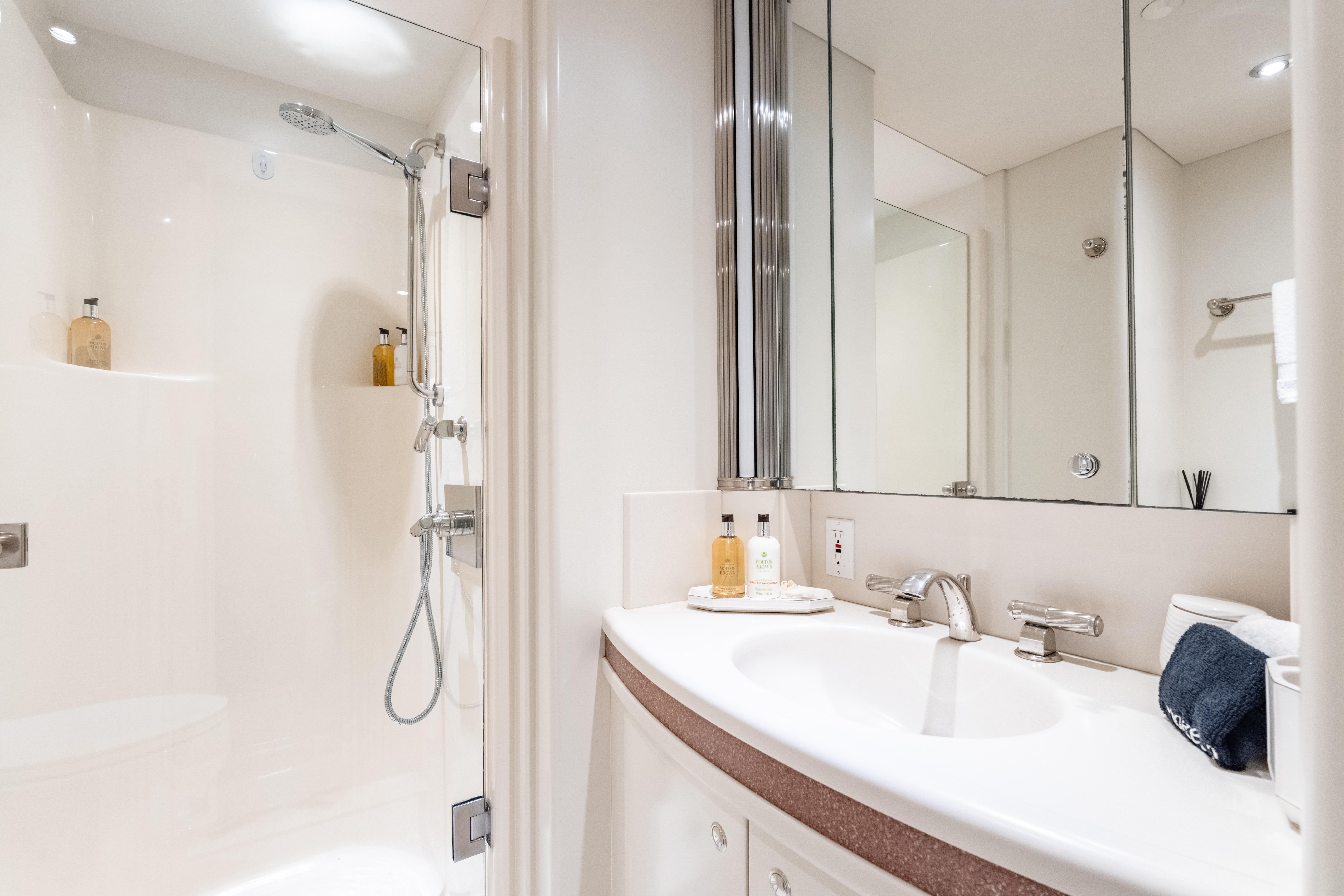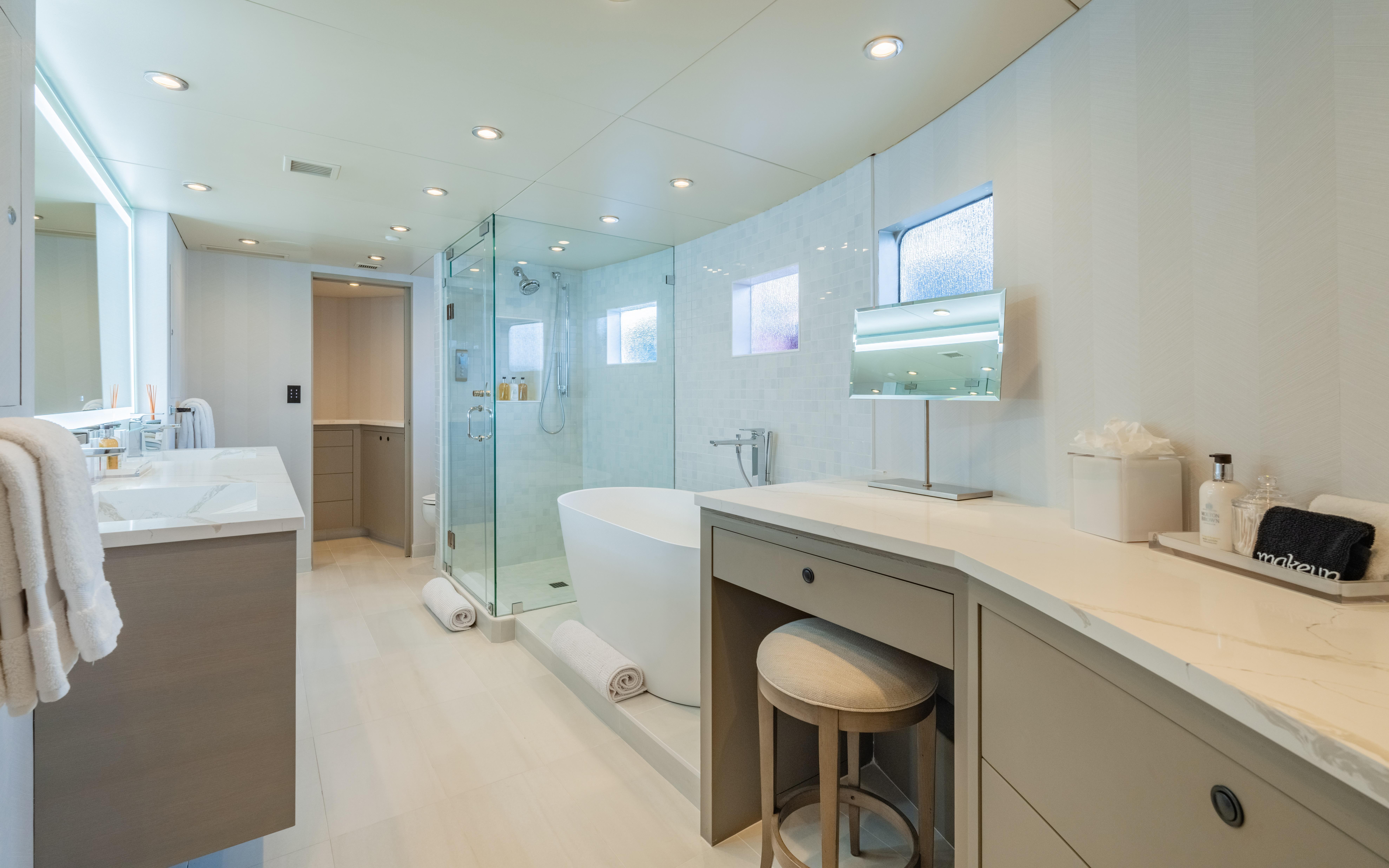 • Large on deck full beam master suite with his and hers ensuite and full-size soaking tub. Additional bonus cabin on main deck perfectly suited for caregiver or children.
