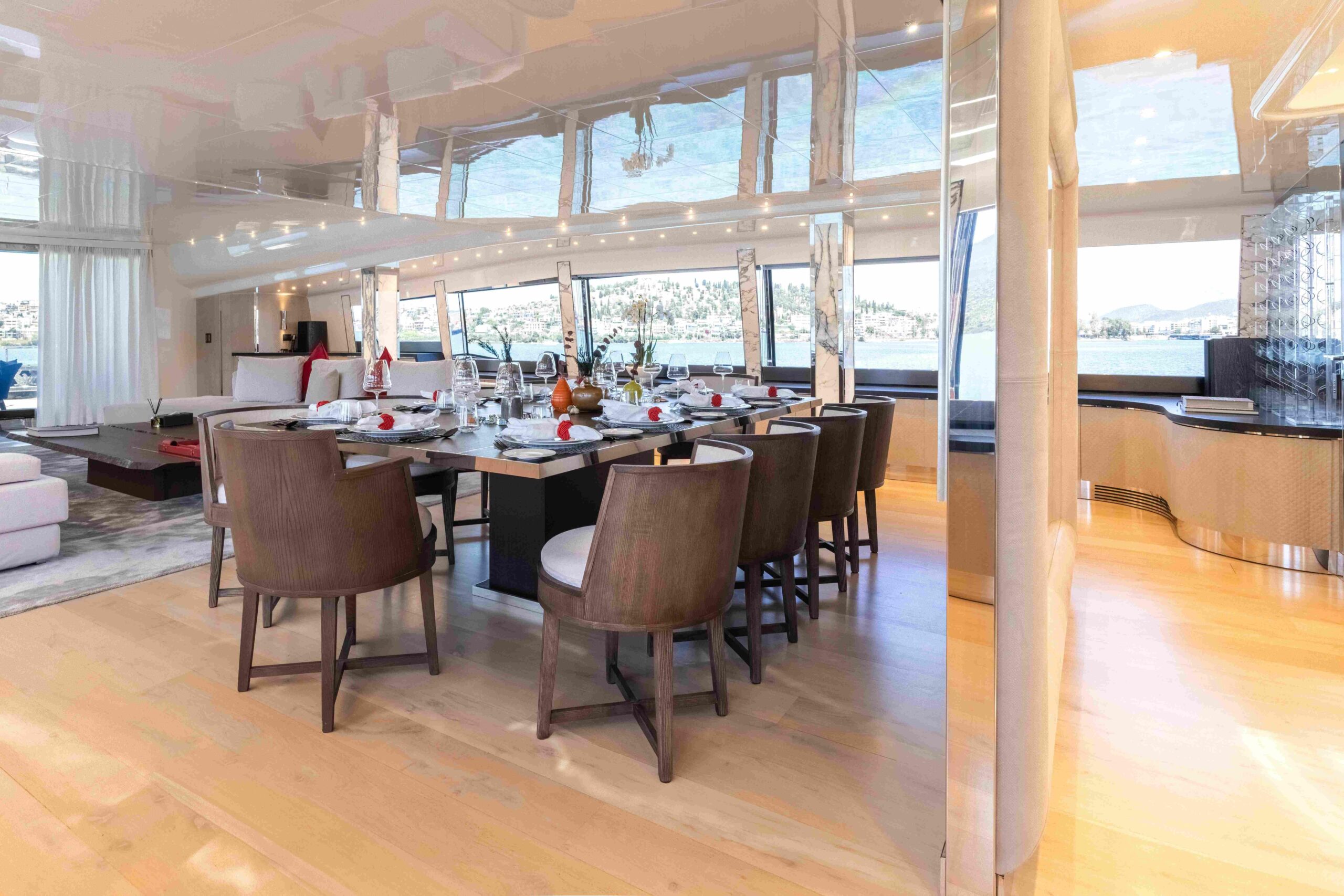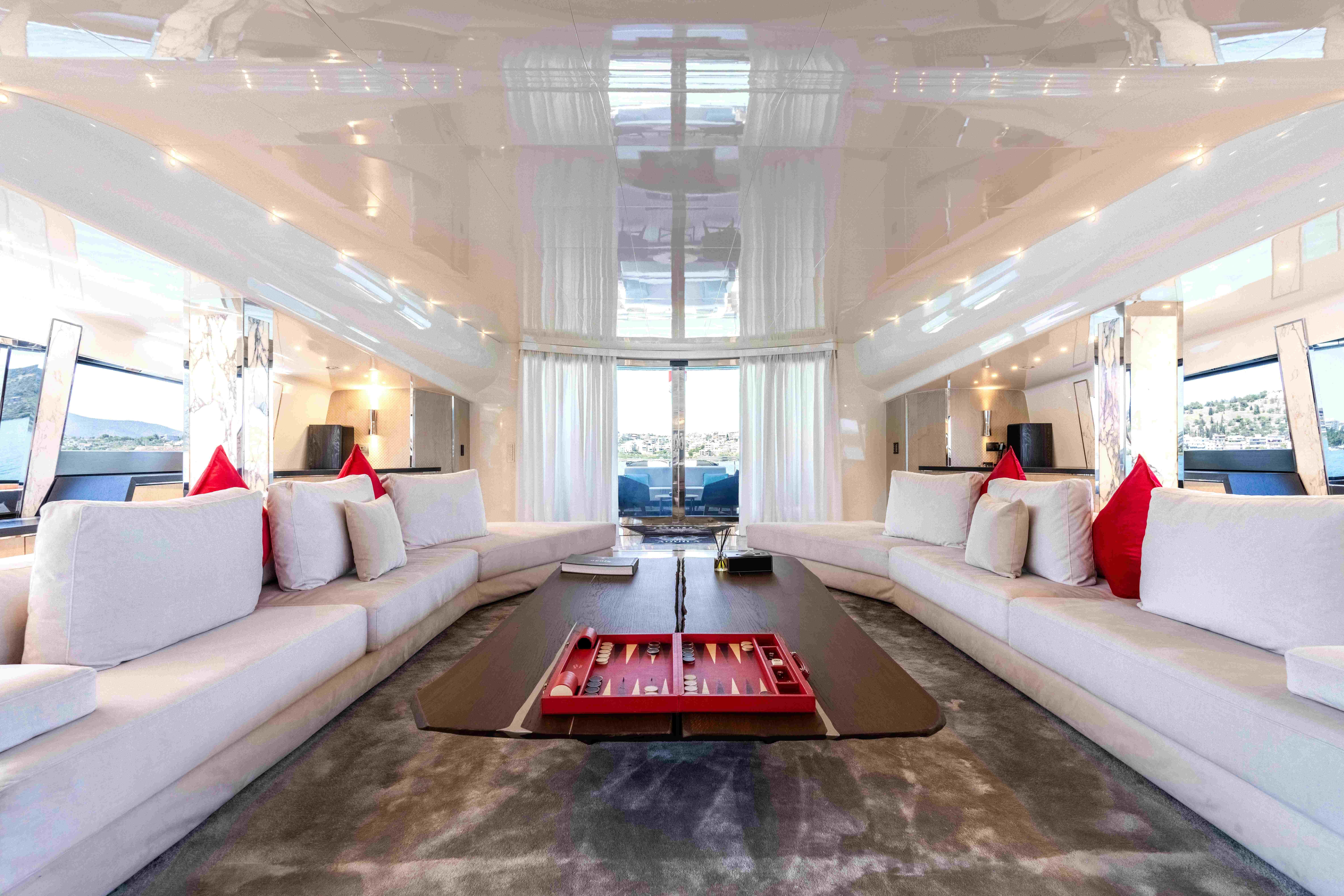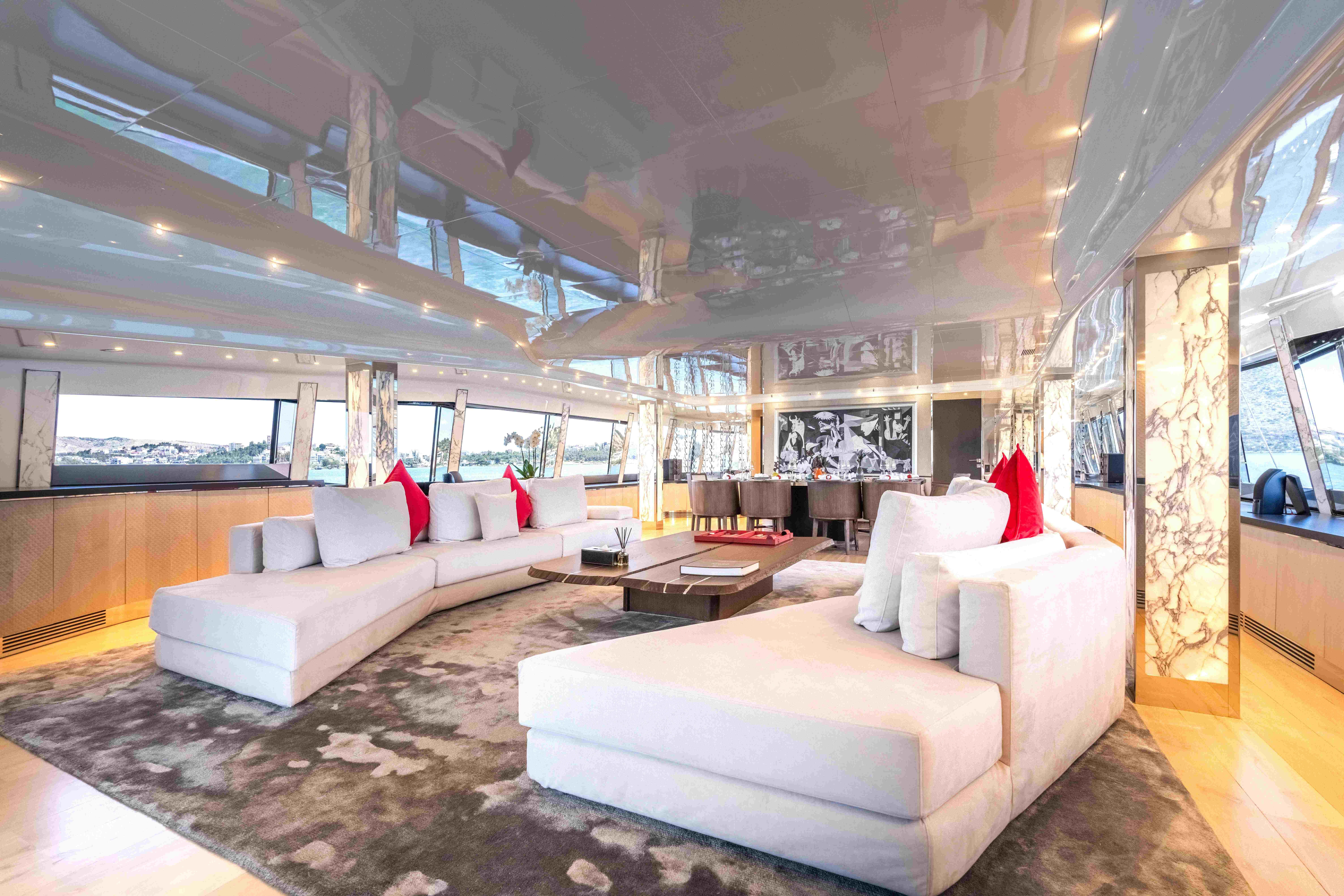 She features a full-beam main saloon with lounge and dining areas, as well as a large sunbathing space on the foredeck. The upper deck includes a dedicated cinema room, while the flybridge provides seating for up to twelve guests for open-air dining, along with a bar area.