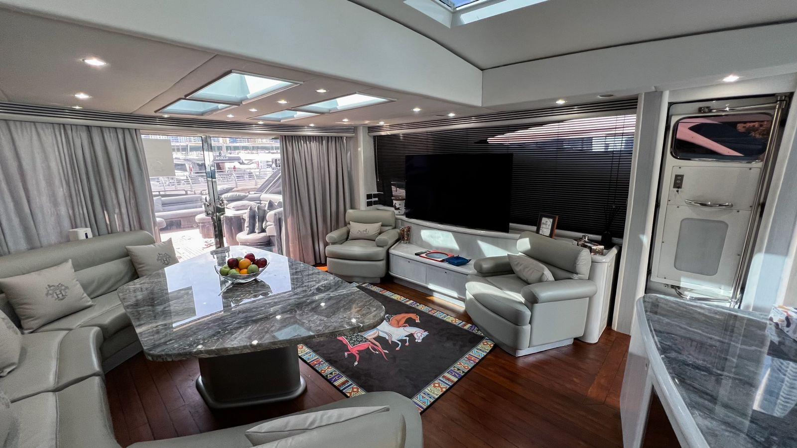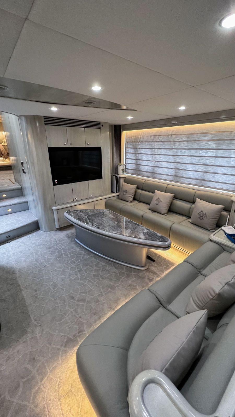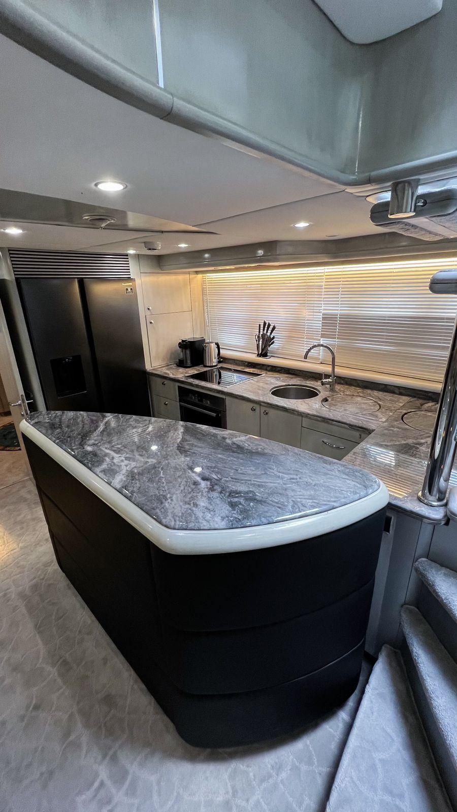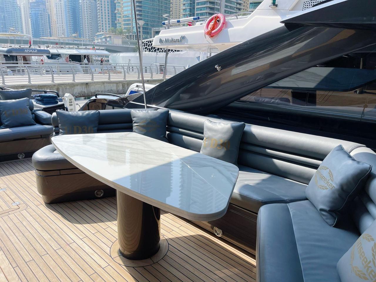 "Full respray 2021" offers a huge living area created by the seamless blending of the deck saloon into the extensive aft cockpit.Outdoors, the aft deck beach club, which can be accessed via sliding glass doors from the main level salon, includes a settee, a U-shaped lounge and table for al fresco dining, and oversized sunpads for catching some rays.The