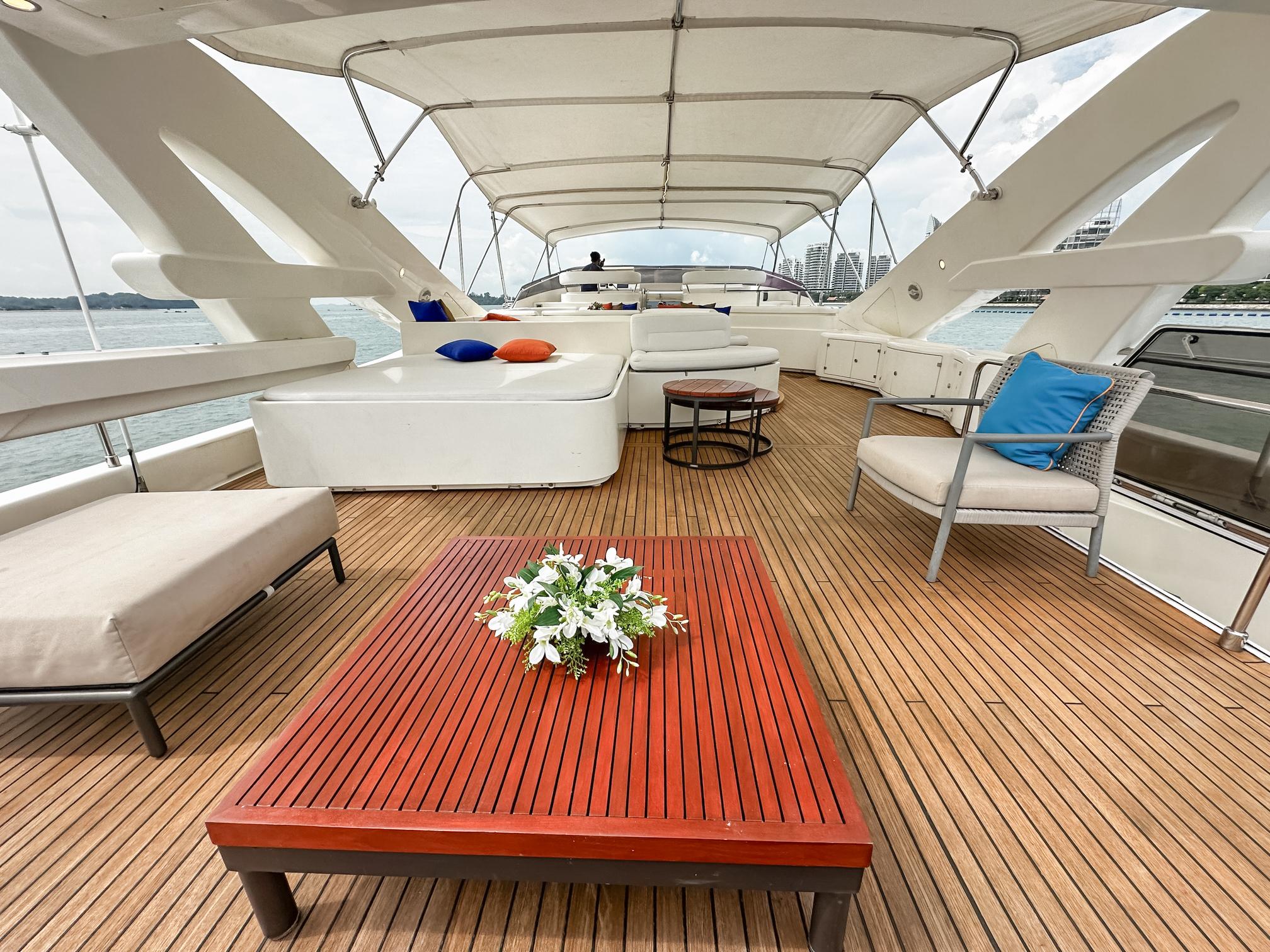 Externally, the yacht is equally impressive, boasting a spectacular flybridge with ample seating and lounging areas, a generously sized cockpit for alfresco dining, and expansive sunbathing space on the bow, ensuring plenty of options for outdoor enjoyment.