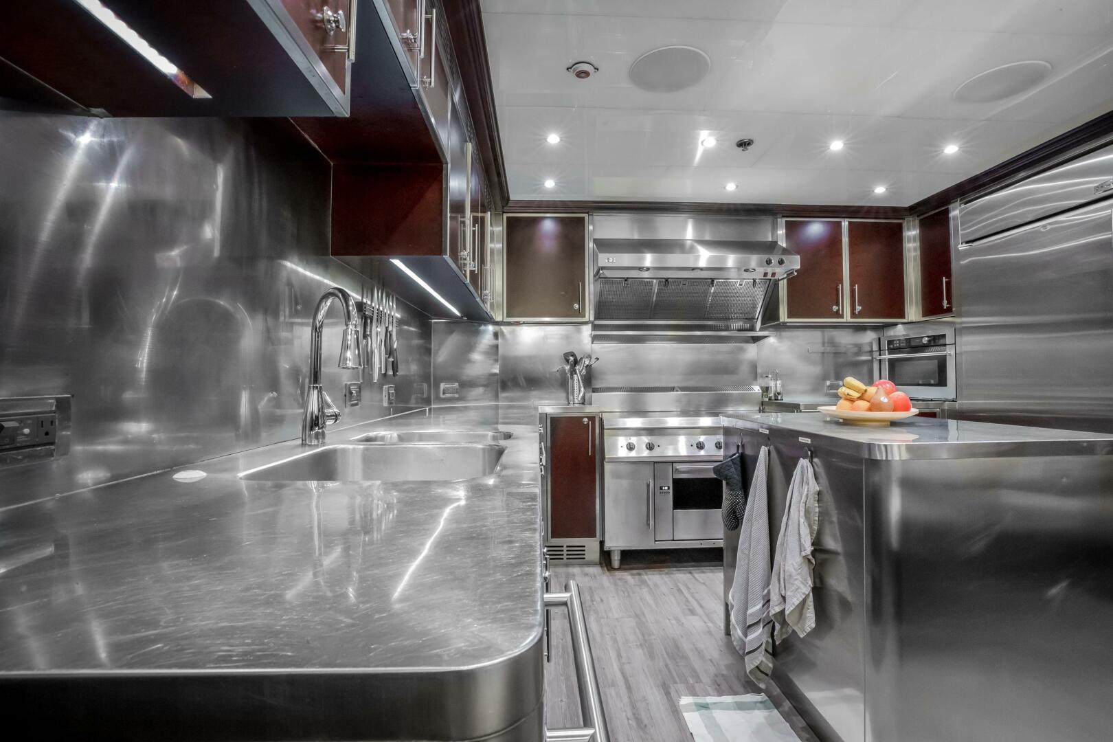 The crew quarters are found aft with access through a watertight door from the swim platform or from the port side main deck companionway. There are three cabins each for two crew, all with TV's and ensuite heads. The crew mess is well equipped and finished with all stainless appliances, granite countertops and laundry area with a stainless stacked washer and dryer. Access to the main engine room is easy and convenient just forward of the crew mess. The captain's ensuite cabin and office are located on the bridge deck aft of the bridge.