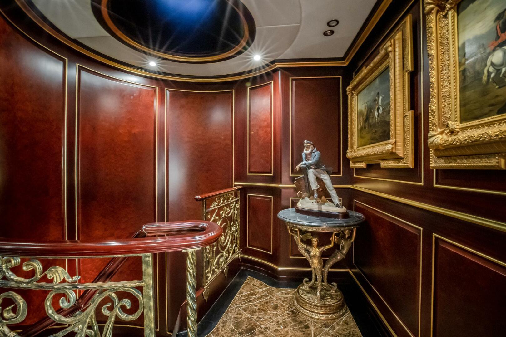 Access to the guest accommodations below is from the main foyer via the main spiral staircase which leads to the stunning marble guest foyer. Beautifully crafted wrought iron railings accent the black granite with plush carpet inlay stairs, artfully illuminated by recessed indirect lighting.
