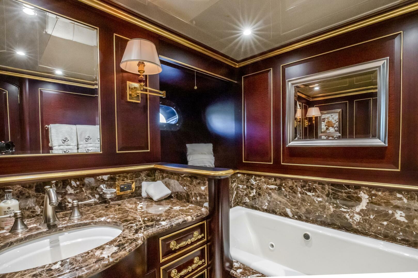 The VIP is forward and would comfortably serve as the master on many yachts of similar size. With its own marble finished foyer, king-size bed with hand crafted silk headboard, copious amounts of space, together with an ensuite marble finished head, shower and bathtub it is a truly luxurious space.