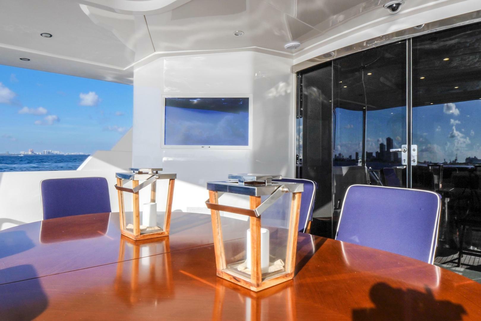 With relevant exterior styling, she features a sizeable skylounge with full bar, gaming table, day head and cozy sitting area and extremely spacious sundeck which serves as the perfect place to relax in the sun or entertain. The deck is expansive, complete with full bar, barbeque, flat screen TV, alfresco dining area, day head, sun pads, custom sauna, and oversized Jacuzzi.