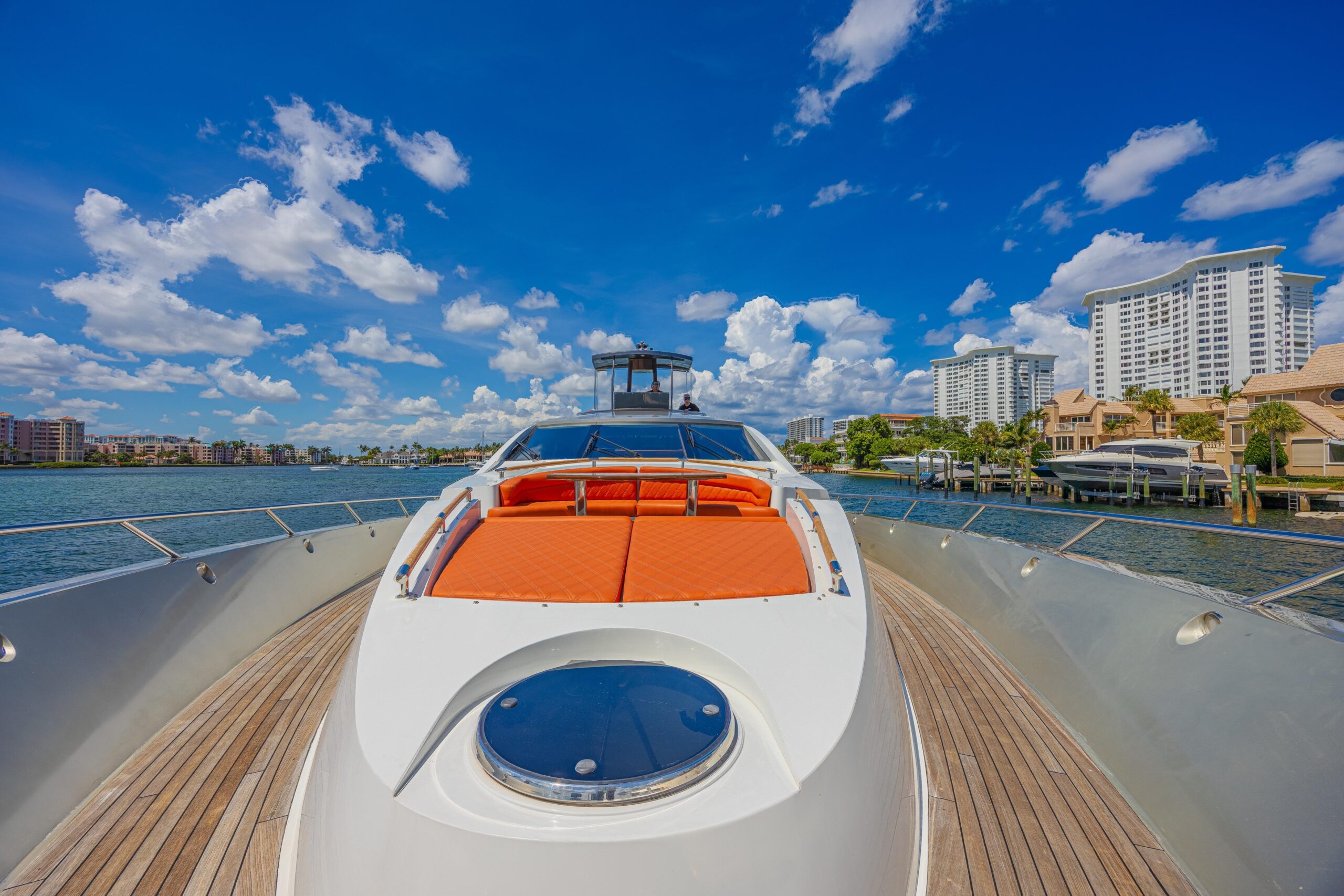 Presents a striking profile with her metallic silver hull, crisp white superstructure, and contrasting black boot stripe that together give her a distinctly sporty look. Teak-clad side decks flow forward to a versatile foredeck, well-suited for open-air meals or sunset cocktails. A spacious aft deck offers a built-in lounge area, while the hydraulic swim platform provides direct access to the water and connects seamlessly to the tender garage.