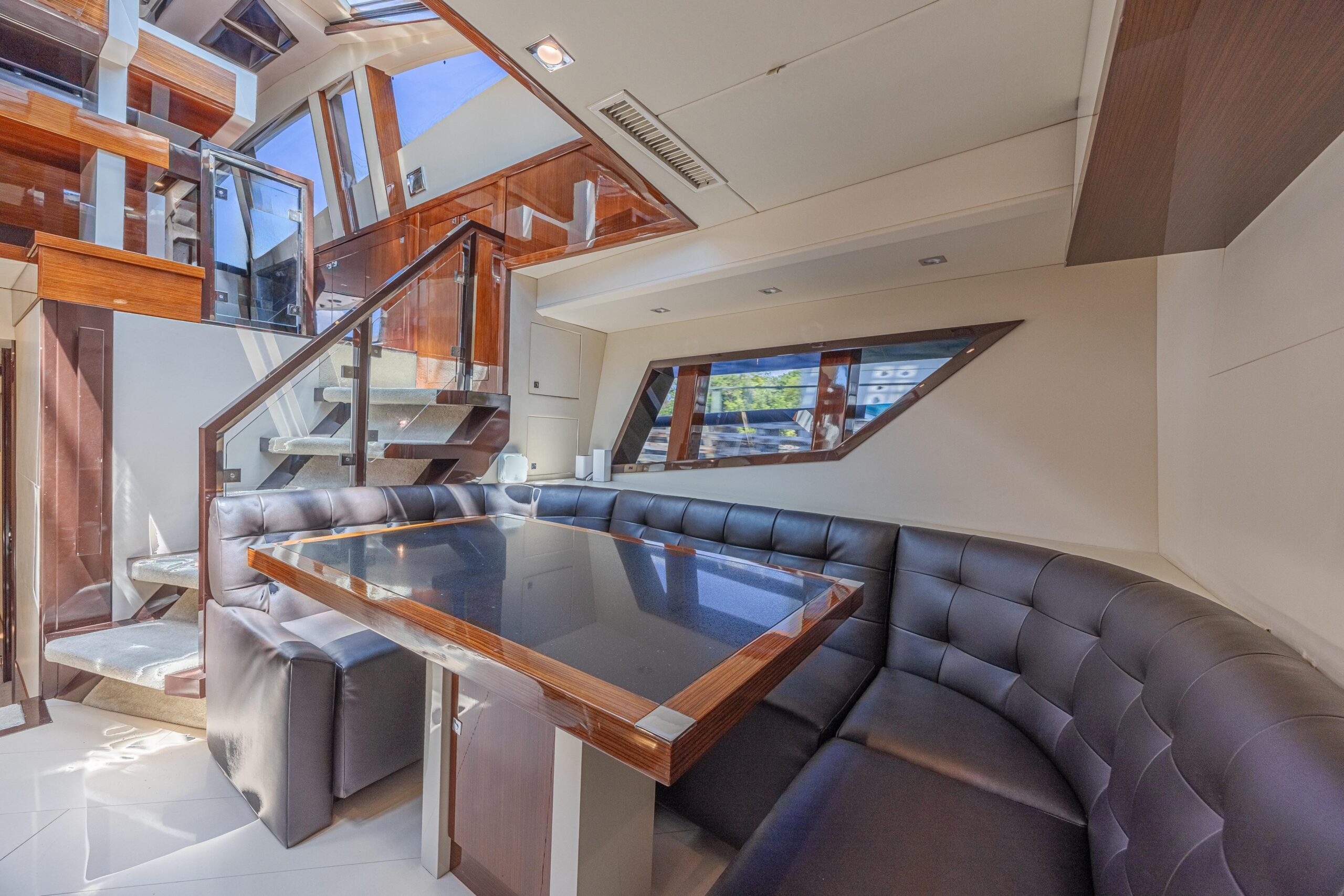 The main salon is finished in rich, high-gloss woodwork that creates a refined, contemporary atmosphere. A custom-crafted leather sectional anchors the space, offering both comfort and style for lounging or entertaining. Forward, the dining area seats up to eight and is enhanced by a retractable sunroof that floods the room with natural light and can transform the space into an airy, open environment.