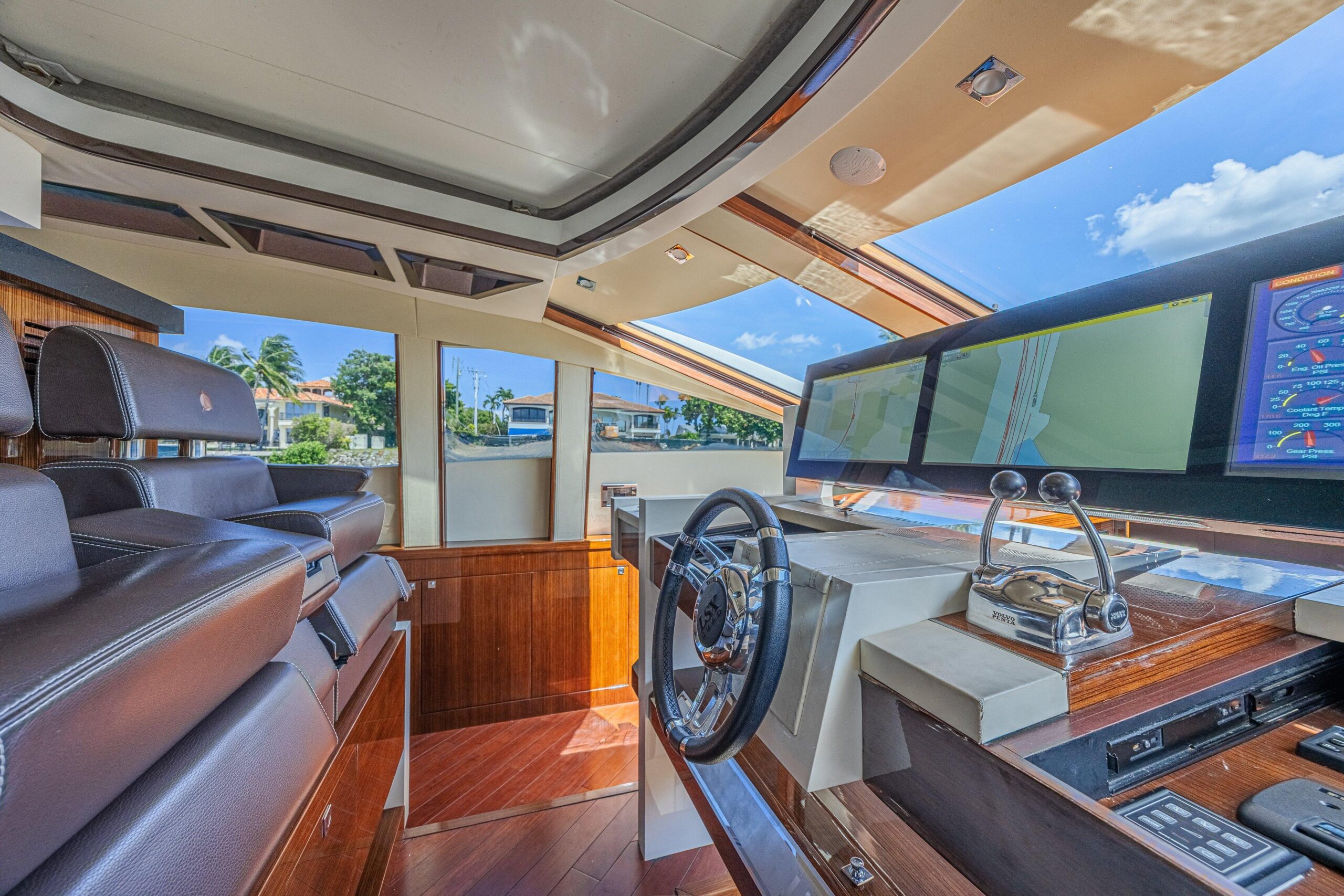 At the lower helm, thoughtful design ensures smooth operation. An adjustable glass-bridge command center with three multifunction displays provides full control, while the electrically operated captain's and companion chairs detailed with fine stitching deliver exceptional comfort. To starboard, an L-shaped settee offers additional seating, all set atop warm wood flooring that balances durability with sophistication.