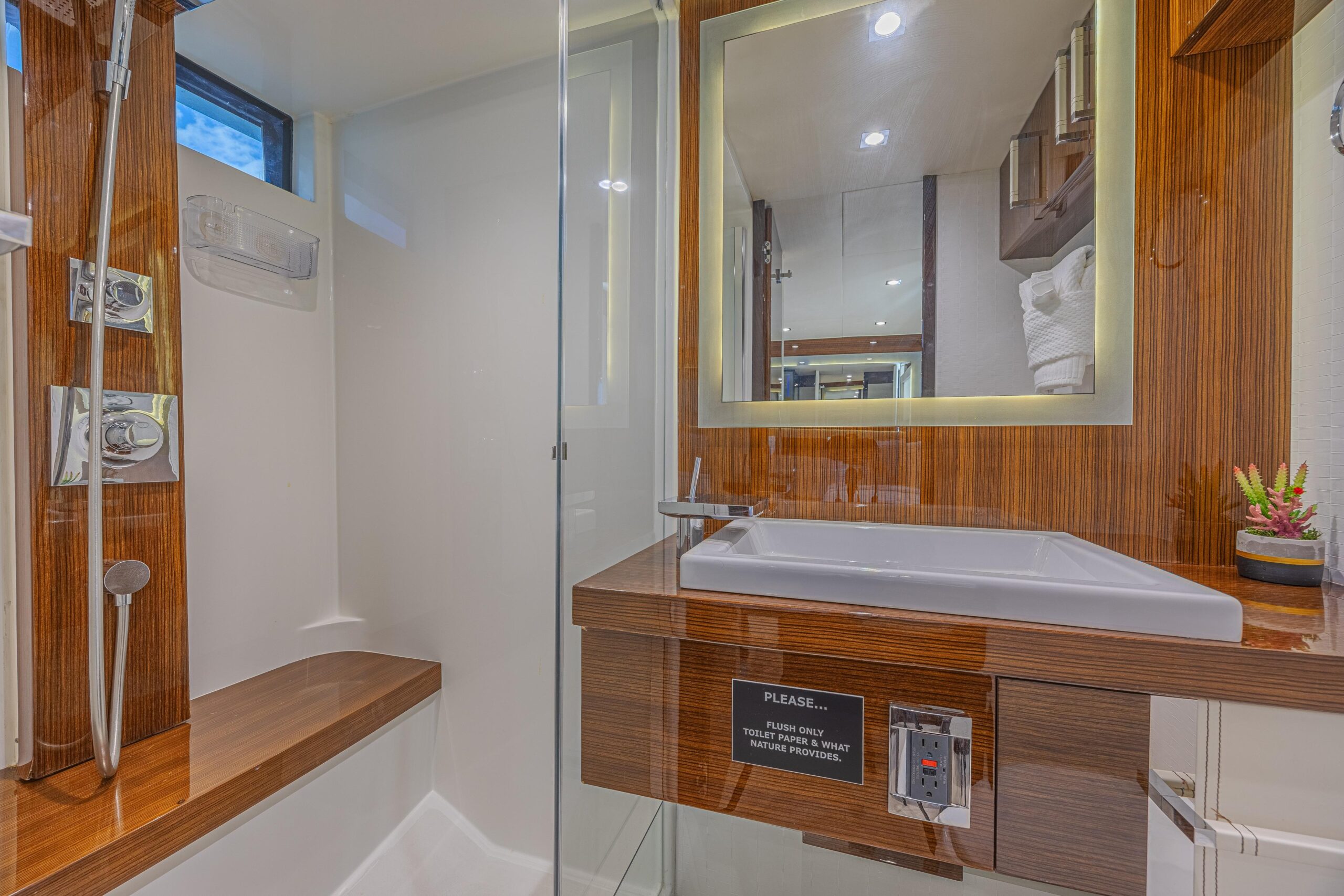 This yacht showcases a generous interior plan with four guest staterooms, each with its own en suite, plus separate accommodations for a crew. A rare day head in the main salon adds convenience, while the full-beam master suite impresses with a private Jacuzzi lounge that opens onto a fold-down balcony. Oversized windows bathe the salon in natural light, and the dramatic atrium-style galley serves as a true centerpiece for entertaining.