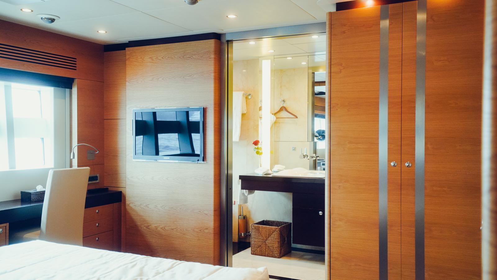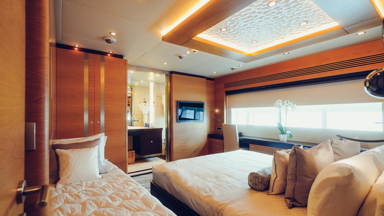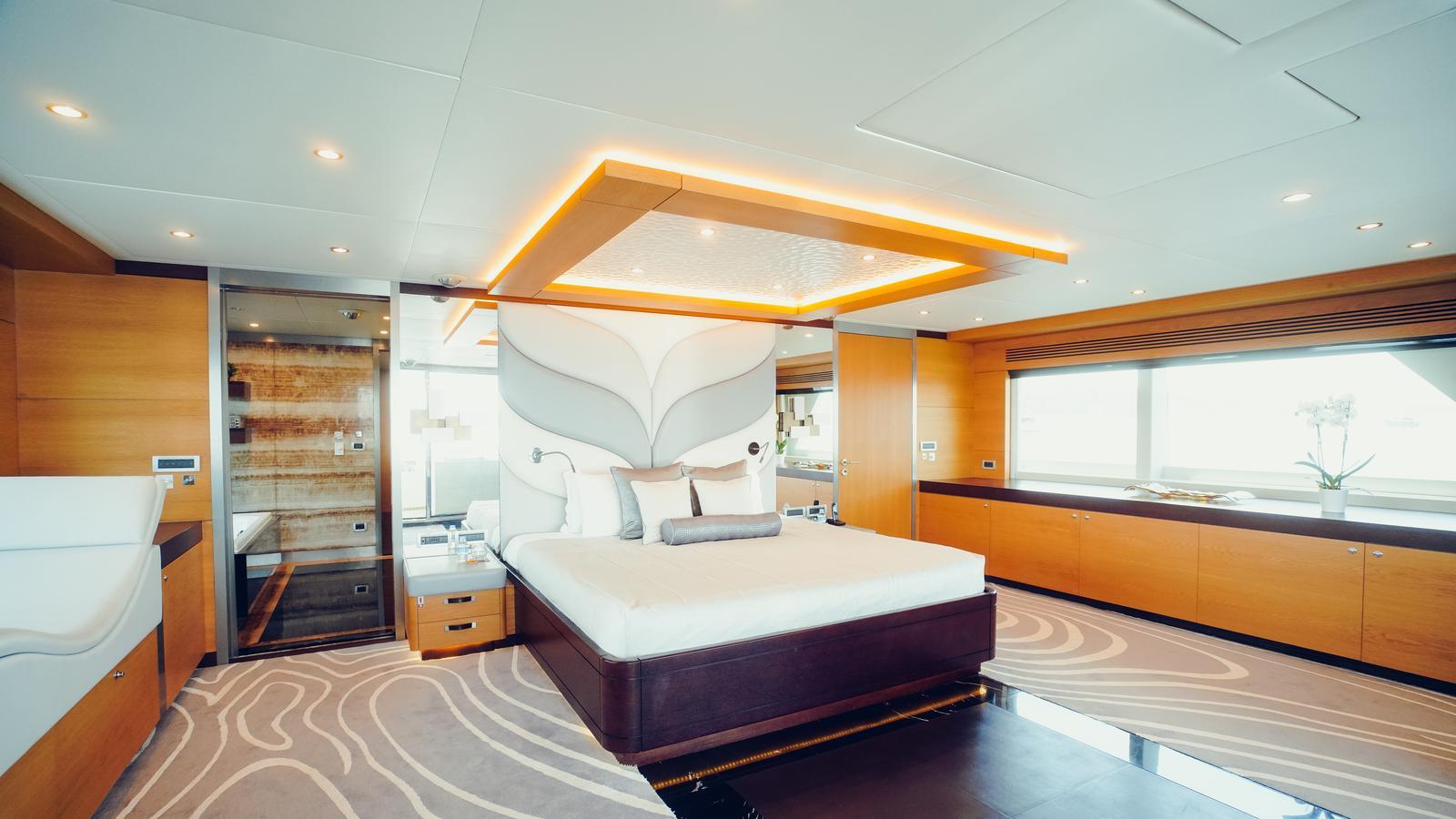 On the main deck, the VIP stateroom includes a generous size bathroom, separable from the bedroom by large automatic sliding glass doors. As with all rooms onboard, this cabin has spacious setup with lots of light and the yacht's signature pallet of beige, white and brown tints.