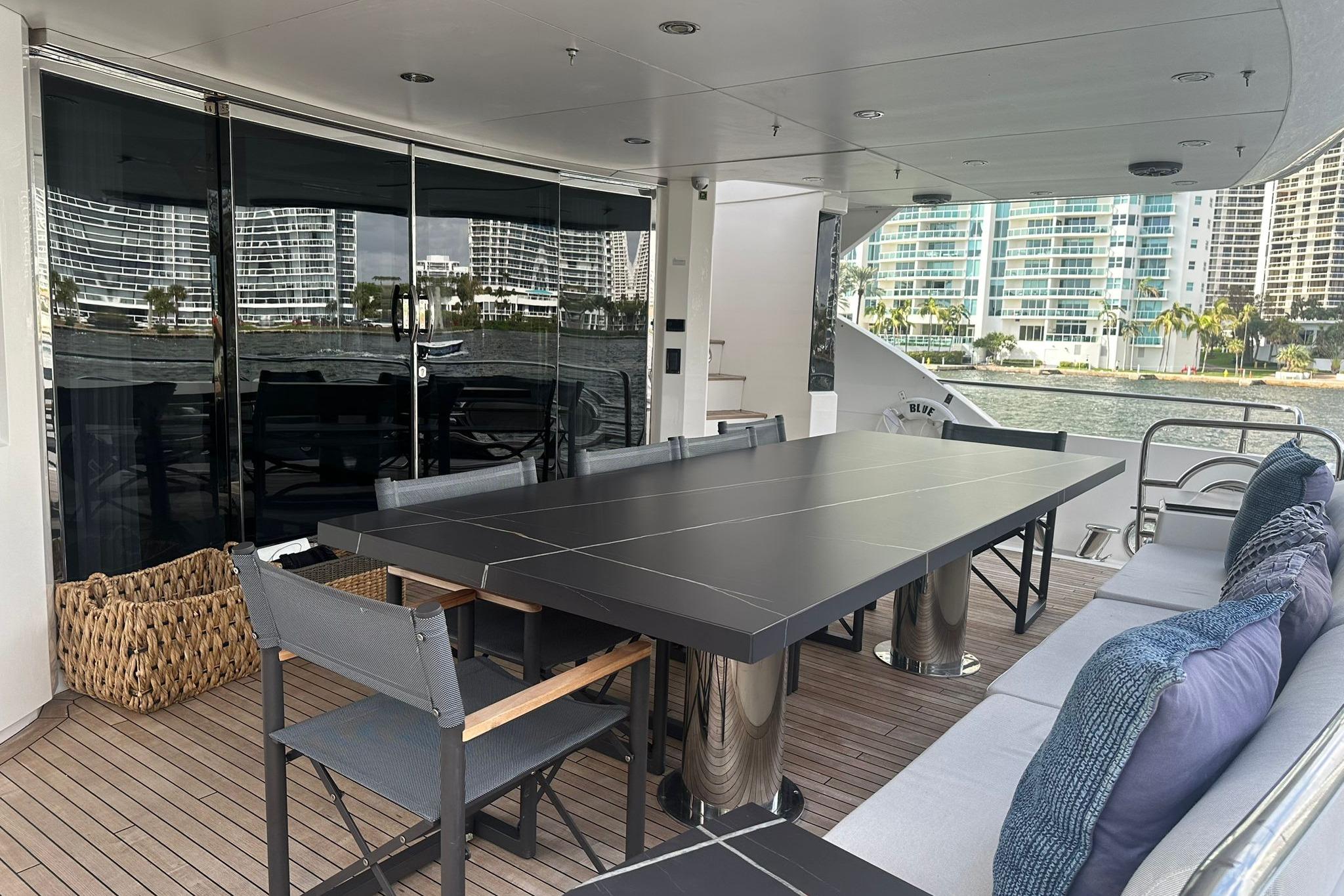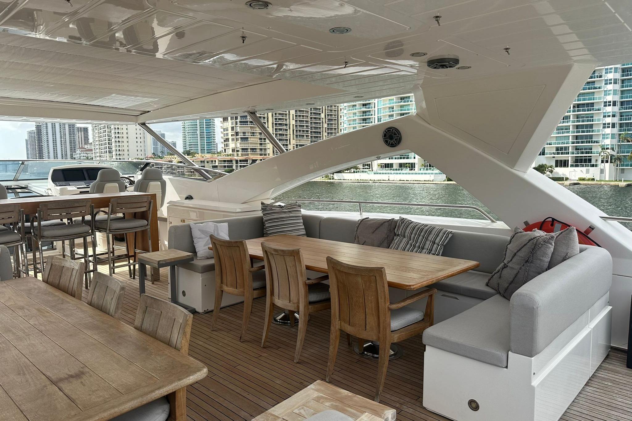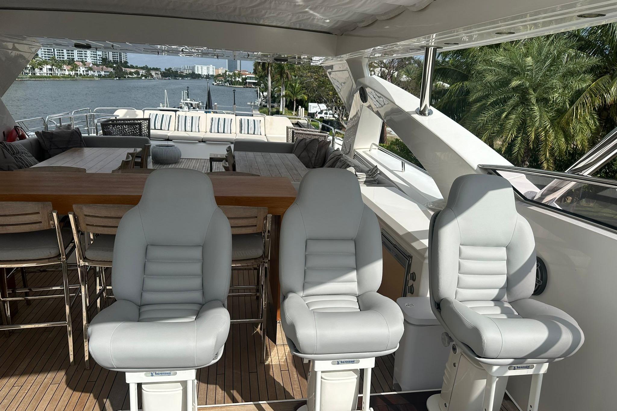 Upstairs in the living area is a great space for interaction with guests and family, with a big table to hold meals. The Master Suite is impressive and comfort, comfort that also extends to the other four cabins aboard. Powered by twin MTU engines and Kohler generators, this Sunseeker Yacht will provide you and your family plenty of great performance to either short or long distance navigation trips along our beautiful coast.