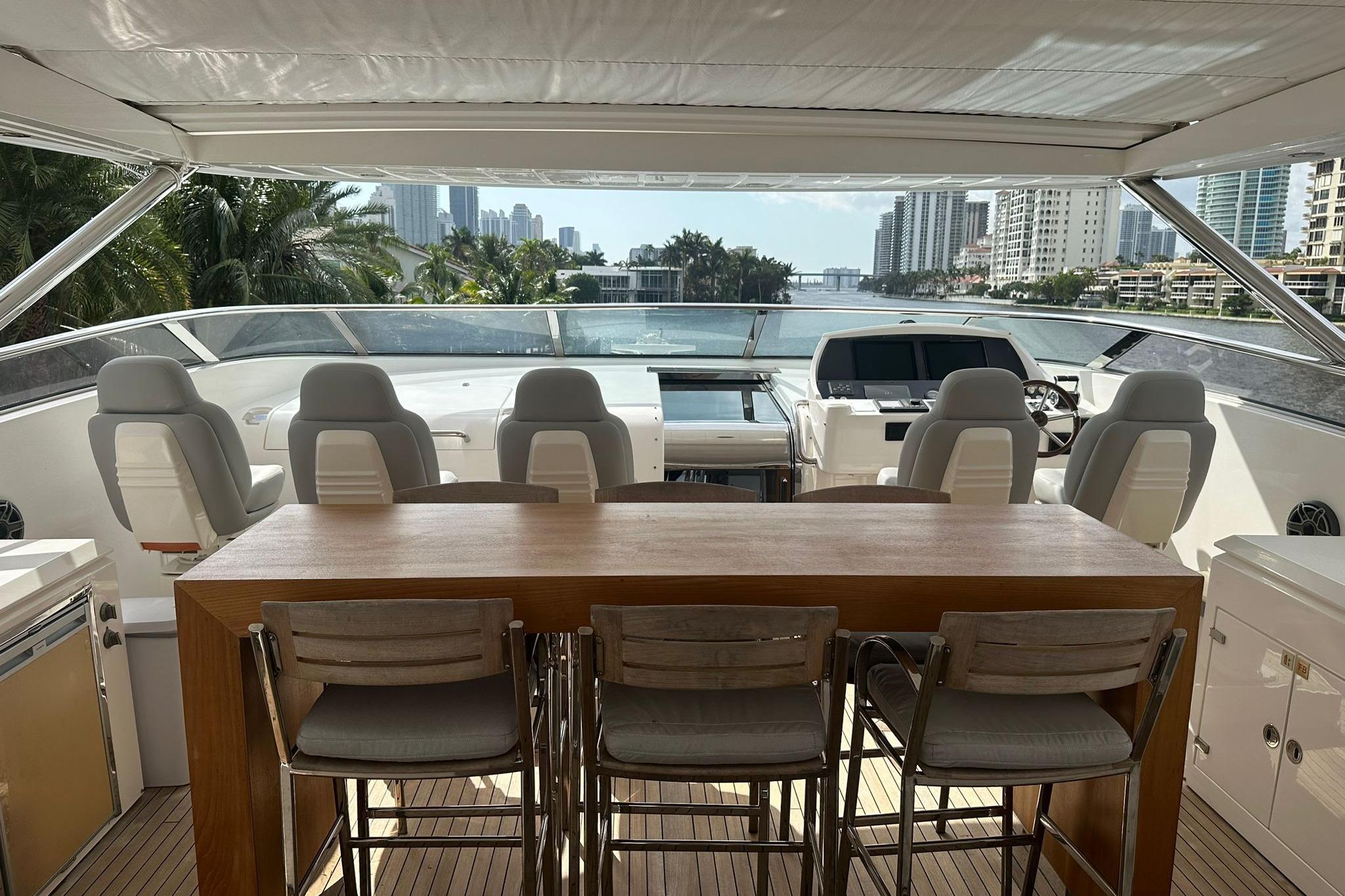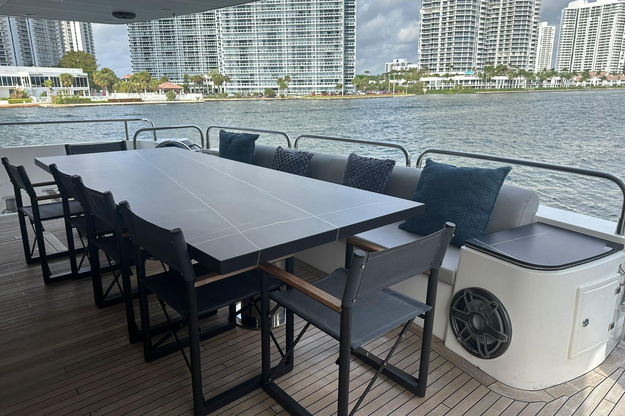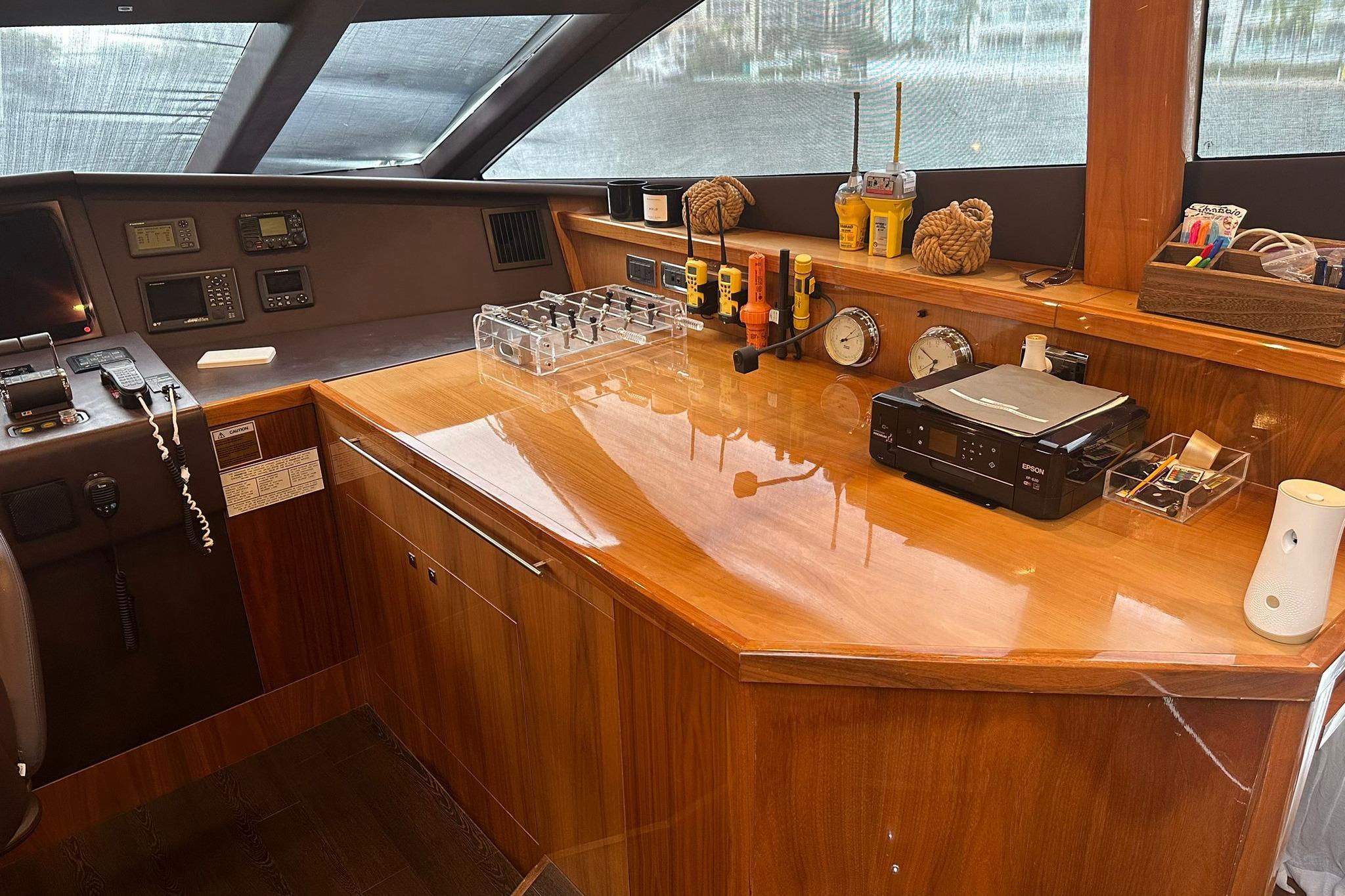 Upstairs in the living area is a great space for interaction with guests and family, with a big table to hold meals. The Master Suite is impressive and comfort, comfort that also extends to the other four cabins aboard. Powered by twin MTU engines and Kohler generators, this Sunseeker Yacht will provide you and your family plenty of great performance to either short or long distance navigation trips along our beautiful coast.