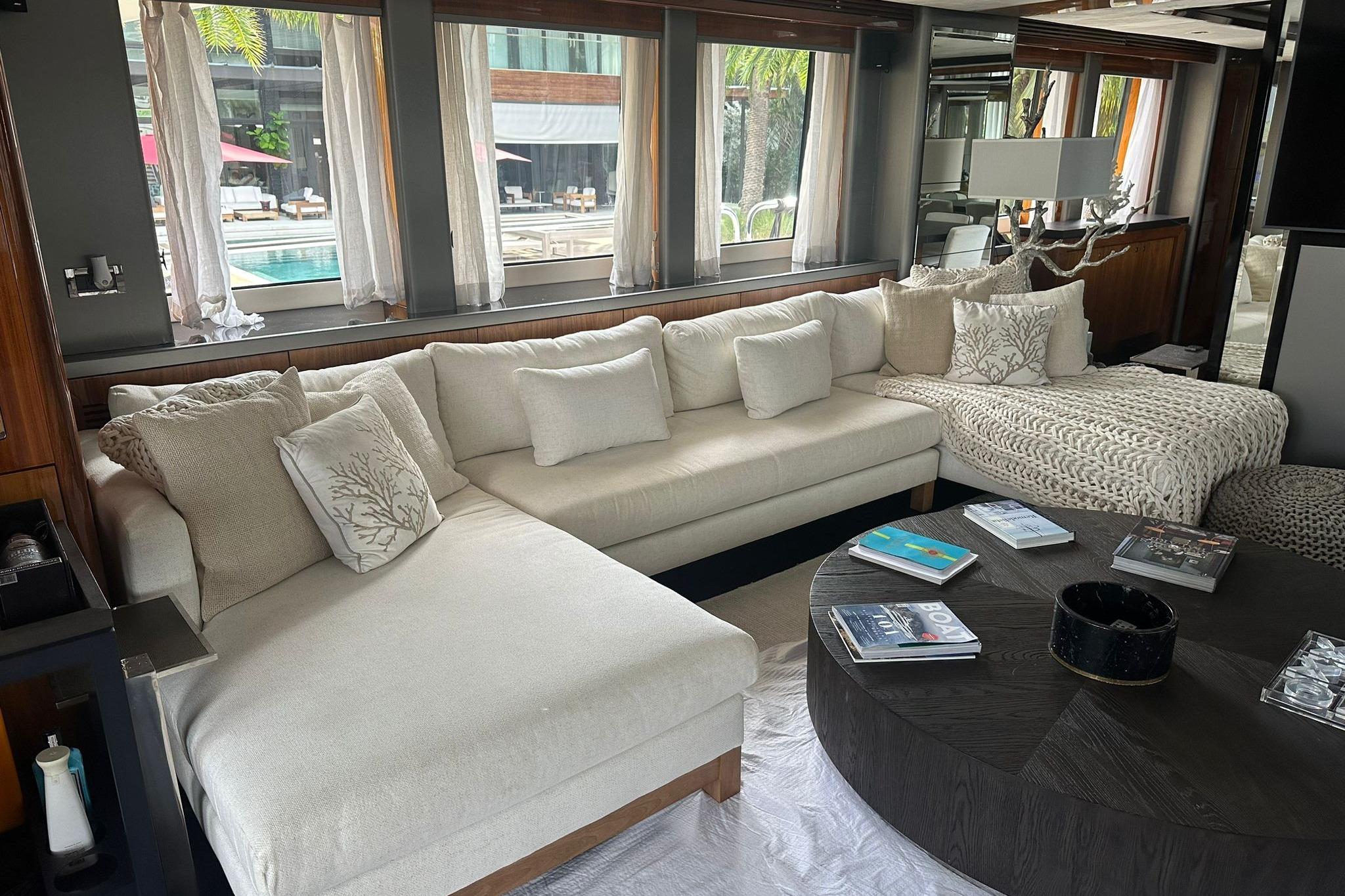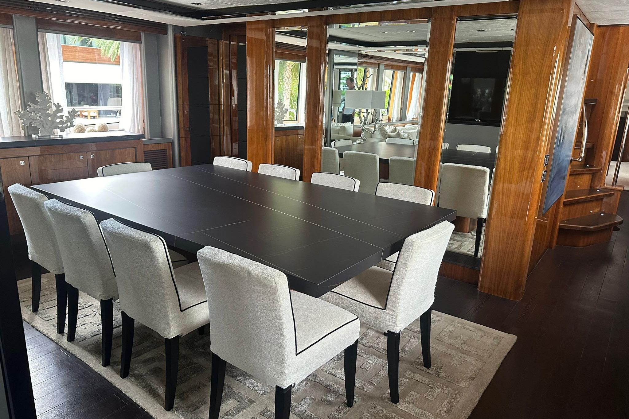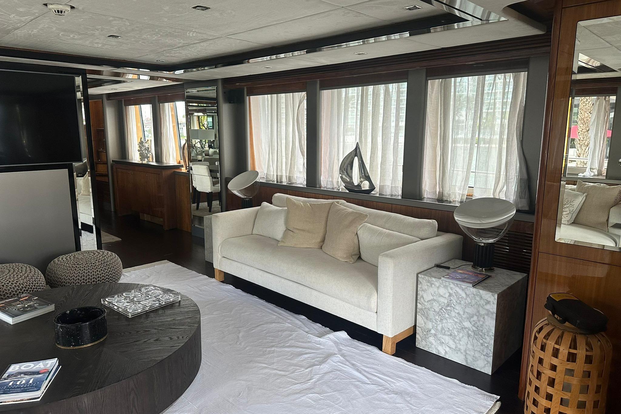 The streamlined profile, accented by stainless steel details, exhibits modern elegance. Its long windows provides much sun light to the interior as well. Sophistication is the main word when it comes to its interior, refined materials can be found all over the vessel.