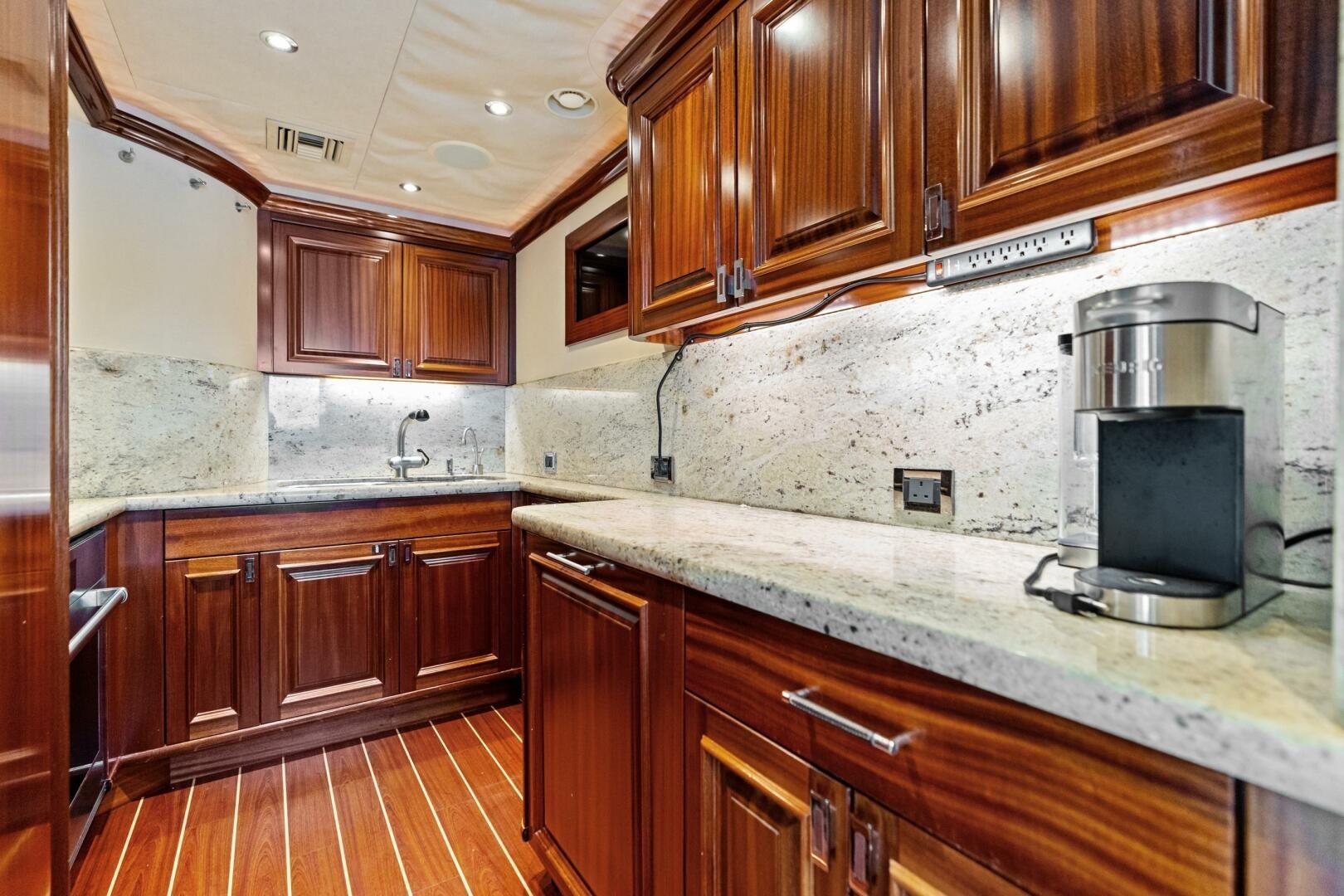 • Crew galley includes Perlick stainless steel built-in refrigerator, GE profile microwave, and sink