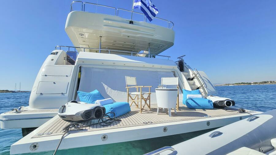 Has a variety of versatile living spaces, including a spacious main saloon with a formal dining area, a fully equipped galley, a large sundeck with a Jacuzzi, sun loungers, and a barbecue area.