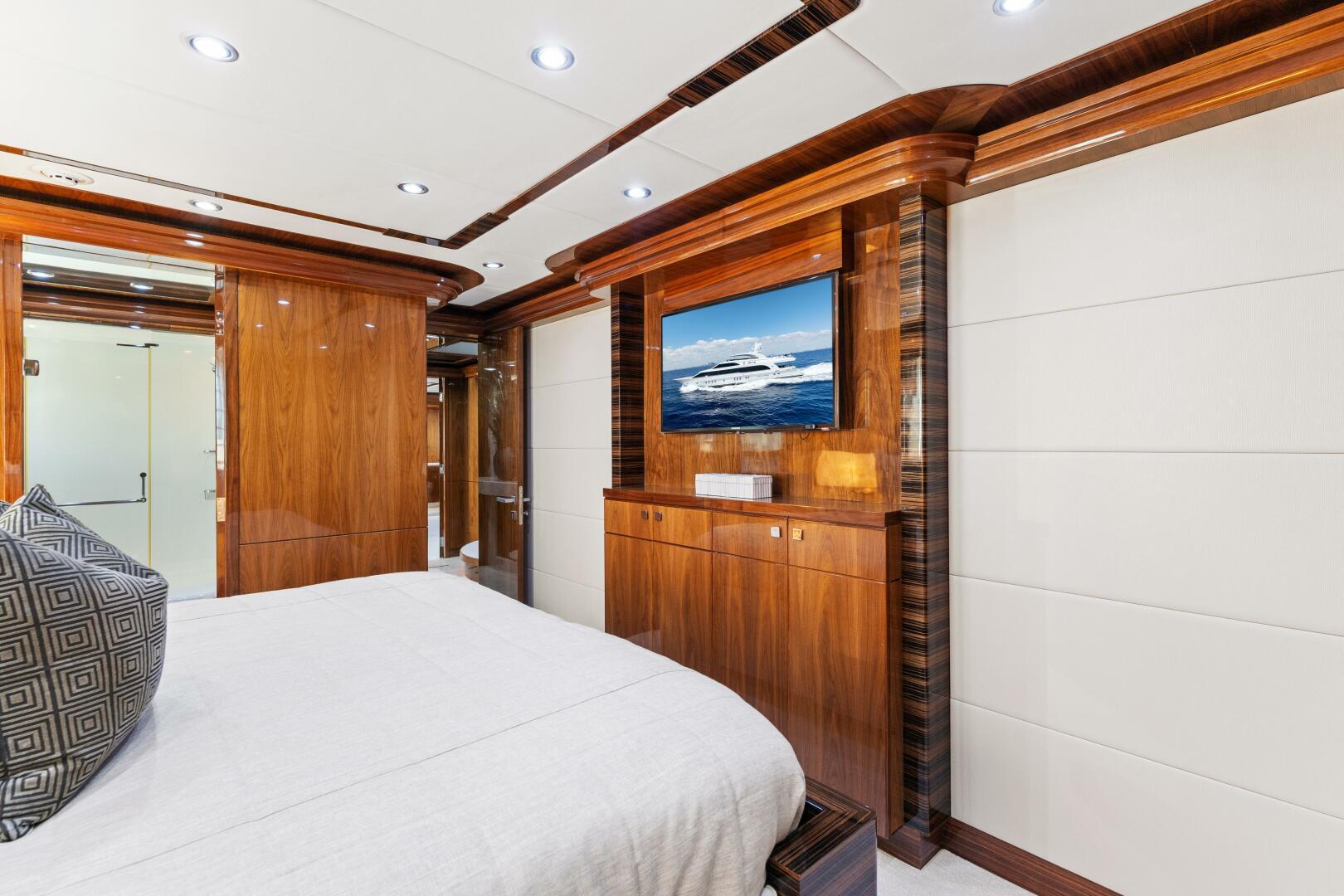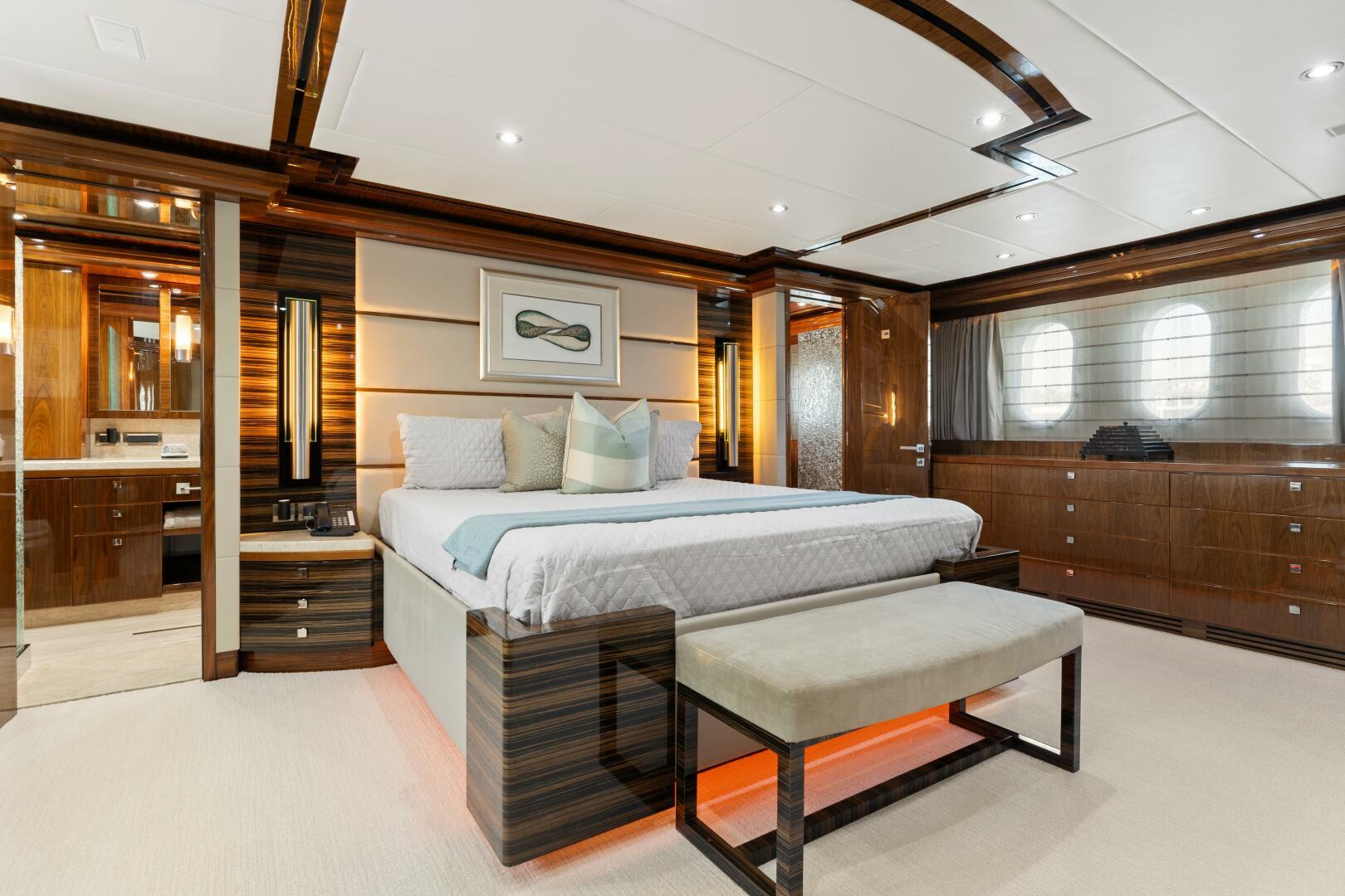 This 2013 Hargrave 125 Raised Pilothouse "Mesmerize" is built for those who love to entertain on a grand scale. With over 5,000 square feet of living space and four king-sized guest suites, it's perfect for both personal use and charter. Every room has a larger-than-expected feel, offering luxurious accommodations for up to eight guests.