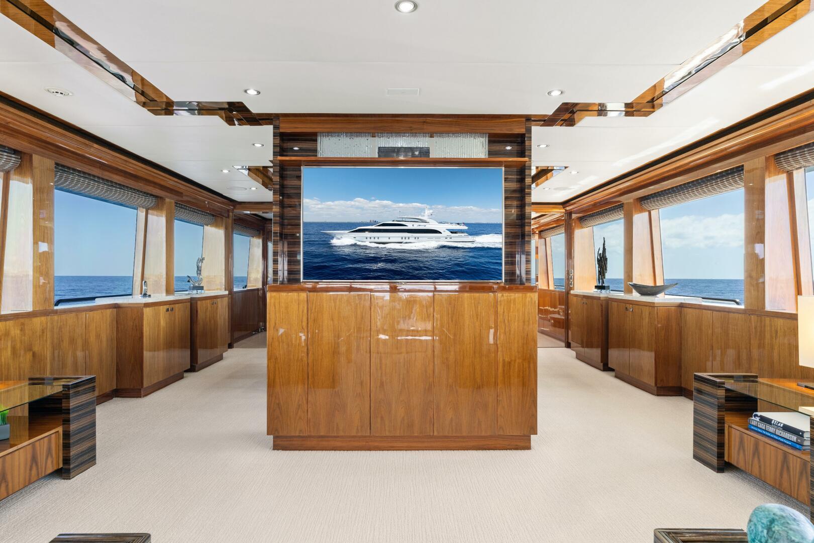 At the aft entrance the flooring is slabs of Cream Kaduna marble. On either side of the entrance foyer there are large squared corner cabinets that define and strengthen the space. The Starboard squared cabinet is the bar, complete with all the required storage, ice, sink etc and completely invisible when closed up. The Port cabinet disguises the crew companionway on the outside of the vessel. Both of these cabinets have gorgeous 44" mirrored recesses with marble shelves and sculptures from Hebi. Looking forward to the Dining Salon, there is a center cabinet with a TV and cabinet with a panel of Art Glass.
