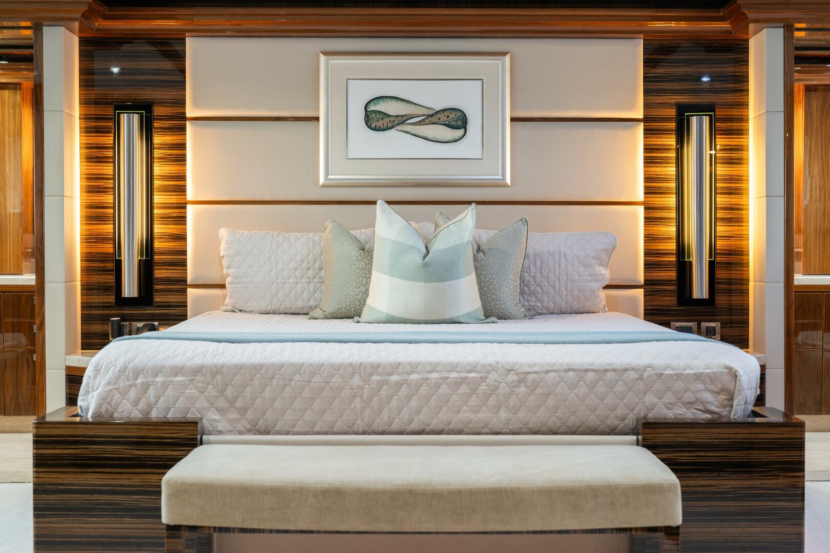 European styling and full wrap-around windows create breathtaking views from every angle. Sophisticated details like Cream Kaduna marble, gloss walnut cabinetry, and custom finishes elevate the onboard experience.