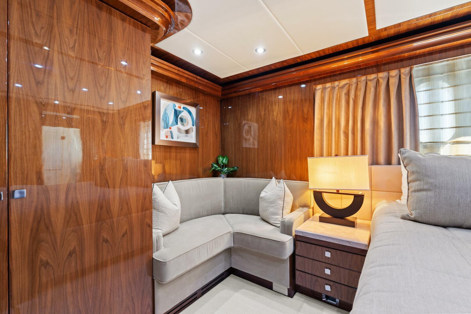 The objective for this project was to create a contemporary interior with great balance, clean, sophisticated cabinetry lines with an enduring appeal; for charter or private use. The combination of contrasting surfaces of Gloss Walnut wood, Espresso and Taupe Zebra veneer accents, Sculptured glass and Cream Kaduna Marble (Royal Oyster) creates an abstract and sculptural impression that is truly refreshing. All the guest and social areas are generously proportioned and are perfectly appointed.