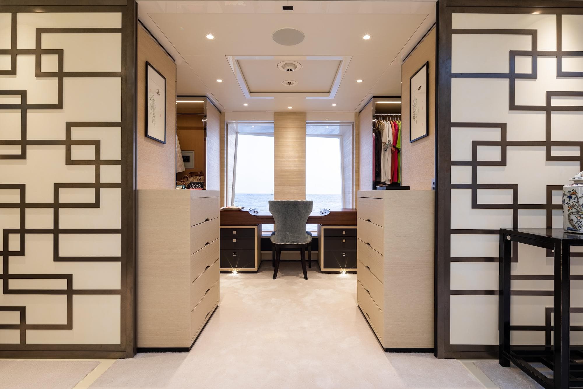 Moving forward on this deck, guest accommodations each feature a private en suite. The master suite is located all the way forward, and features a private lounging area, as well as an oversized dressing area.