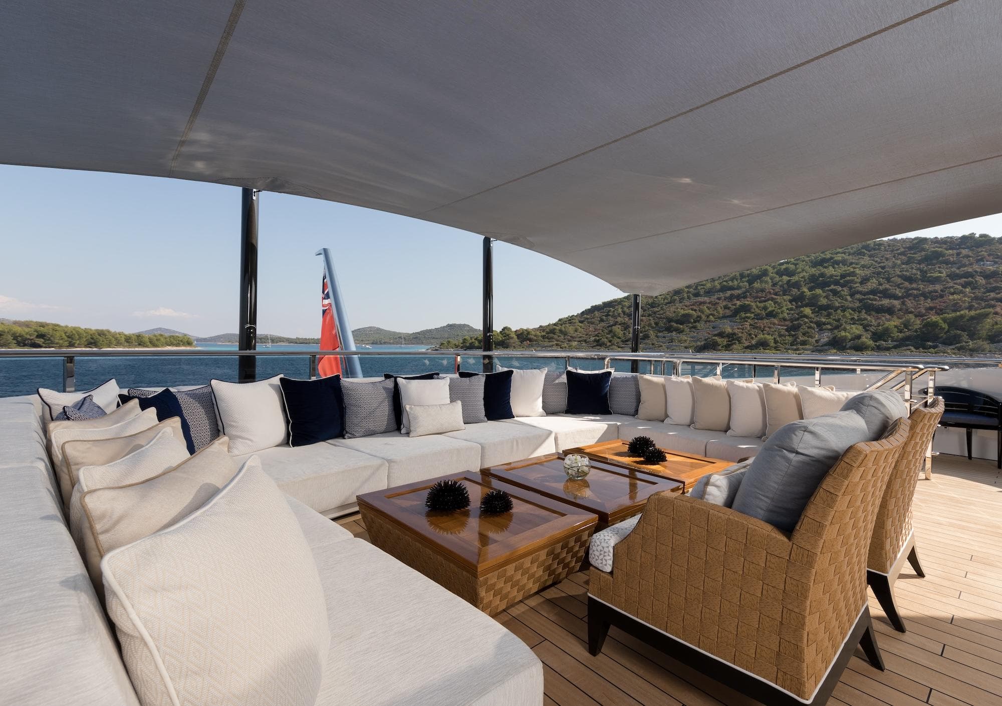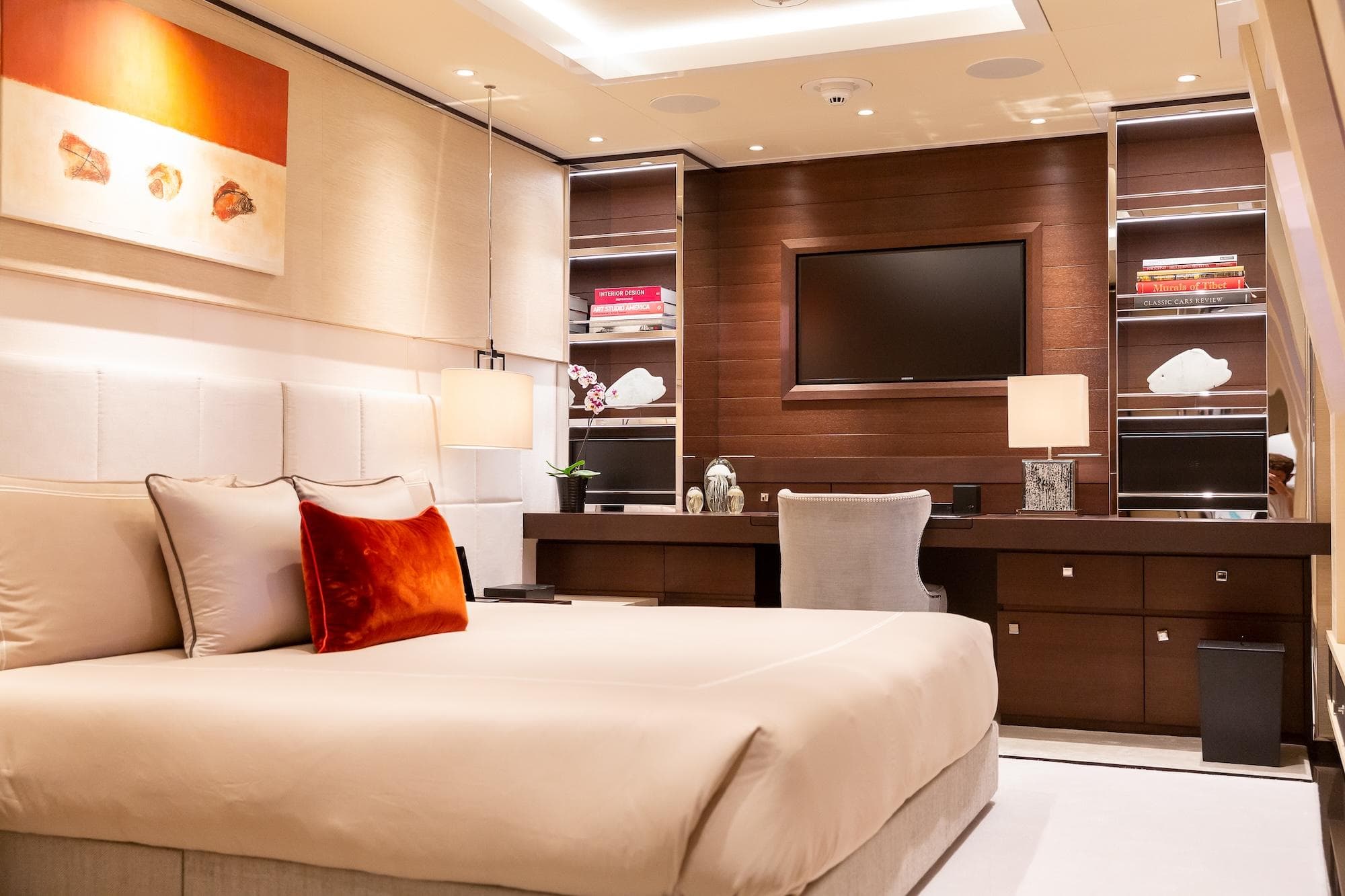 This spacious level of the yacht is reserved for outdoor dining on the aft deck, or indoor relaxation in the salon. An oversized outdoor table is ideal for meals prepared by the yacht chef or Sunday morning brunch served by the crew. Aft of the table is an outdoor living space edged with white sofa seating and centered by two large low tables. Moving indoors, the salon offers various conversation areas with sofas and loose armchairs, and is an excellent option for movie nightsor social gatherings. All the way forward, a Portuguese bridge leads to a quiet spot laden with sunpads and optional shading to take in the views.