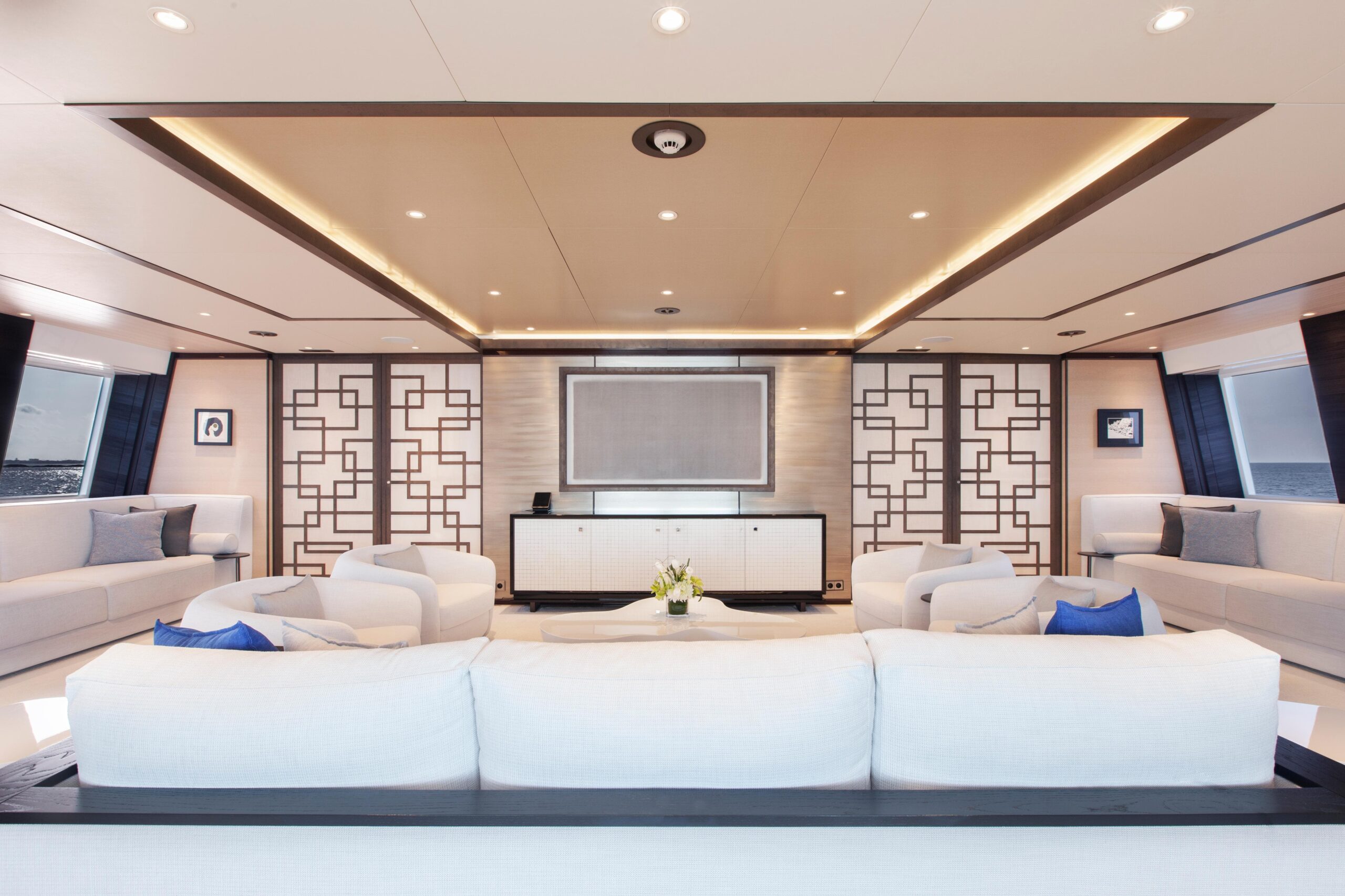 The main deck aft features an intimate seating area outdoors, ideal for a late-night cocktail. Once inside, a vast, full-beam main salon with Asian-inspired décor welcomes guests to a plush lounging space with plenty of seating and floor-to-ceiling windows that bring in the outdoors. Just forward, a formal dining space seats up to tenguests and boasts two recessed ceiling panels that are well lit and edged in black lacquer.