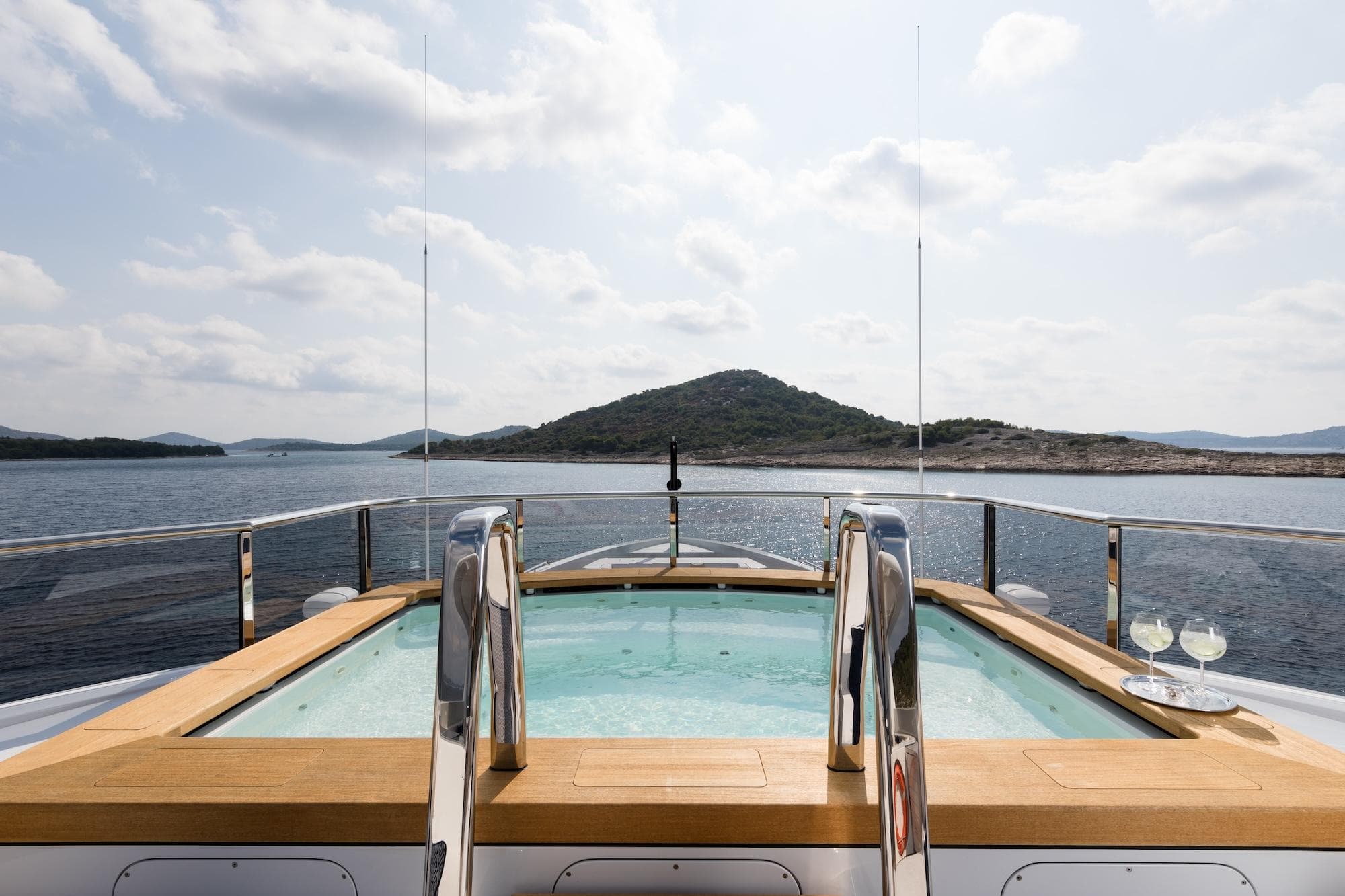 Beginning up top, Samurai's vast sun deck features an elevated Jacuzzi from which guests can take in the panoramic views and water-jet massage. Large sunpads here offer lots of space for sunbathing, while a protected lounging area nearby offers respite from the sun. Guests are shielded from the wind by glass paneling that surrounds the deck and offers unobstructed views of the water.
