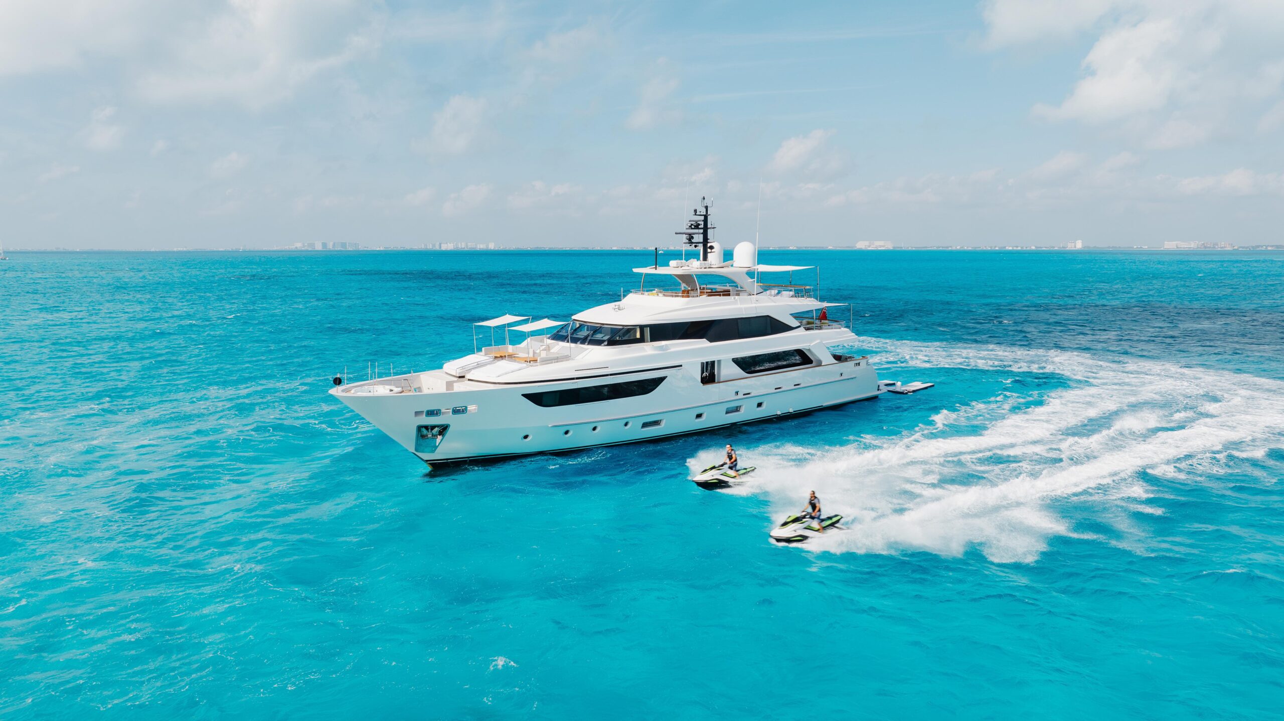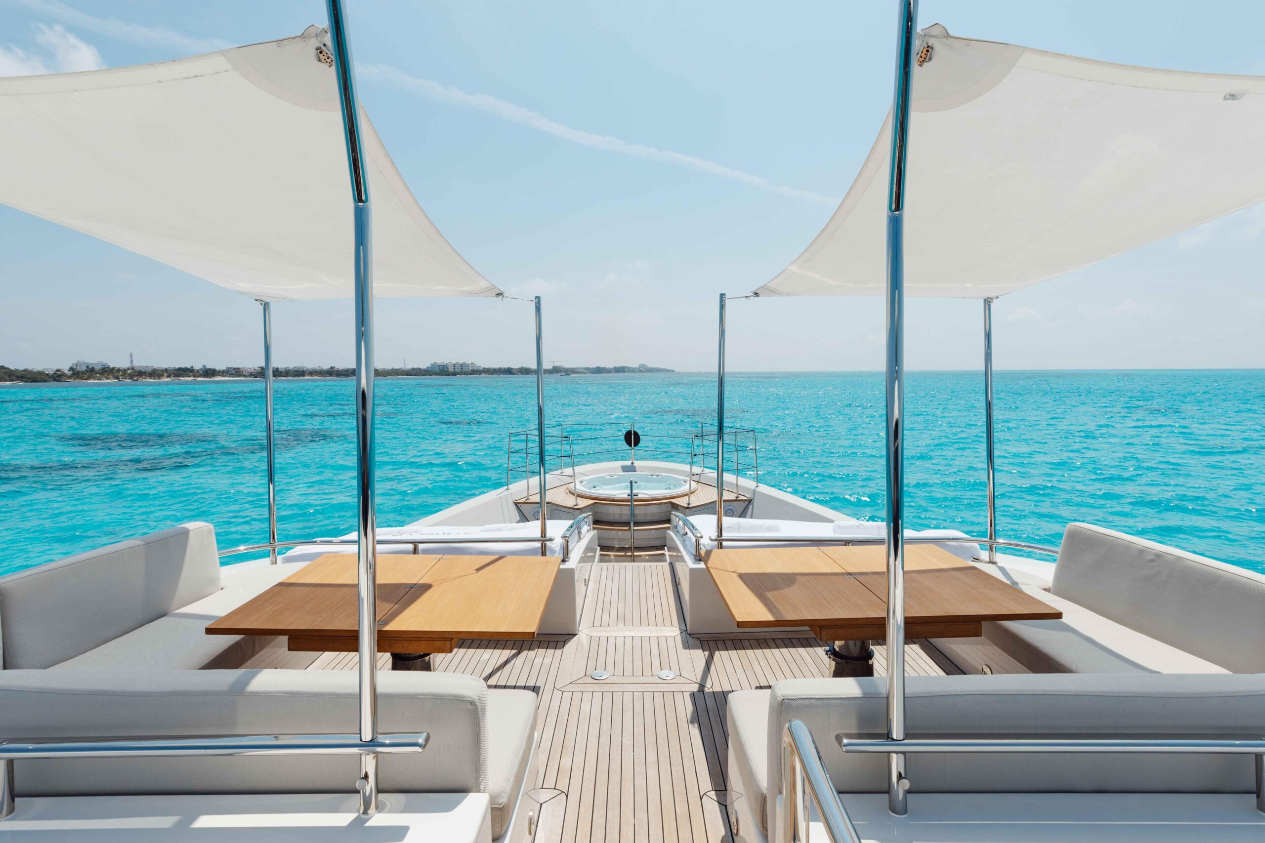 One (1) Flybridge freshwater connection/tap One (1) Aft freshwater connection/tap Spotlight Lateral gangway: Marquipt Sea Stair 9 steps Rub rail with stainless steel trim Prop speed on shafts, propeller, and hydraulic swim platform mechanism, intruder, shafts, brackets, bow and stern thruster, rudders and trim tabs Hard Top Bow area awning: Two piece sail cover system with four removable stanchions Jacuzzi pool in bow area Water heater for bow Jacuzzi (6kW) Indirect LED recessed lighting around the Jacuzzi, furniture and bow sunpad Teak planks surrounding the Jacuzzi Sundeck Boffi bar unit with sliding top and storage Flybridge bow lounge area with custom U shape seating design in teak and Paola Lenti furniture Aft flybridge awning: Three- piece sail cover system with three removable aft stanchions Water heater for flybridge Jacuzzi (6kW) Recessed LED lighting for flybridge Jacuzzi Flybridge Jacuzzi bar top overlay with three (3) bar stools Flybridge Jacuzzi glass side panel and box top cover Stainless steel column shower on the flybridge Teak flybridge deck Upper deck sun awning: One piece sail cover system with two removable stanchions Upper deck lounge area with custom U shaped seating design in teak on with Paola Lenti furniture Custom teak cabinet on the upper deck to house the Kenyon electric BBQ and provide additional storage Two (2) Paola Lenti "Smile" sofas on the aft deck Sixteen (16) Ocean LED underwater lights