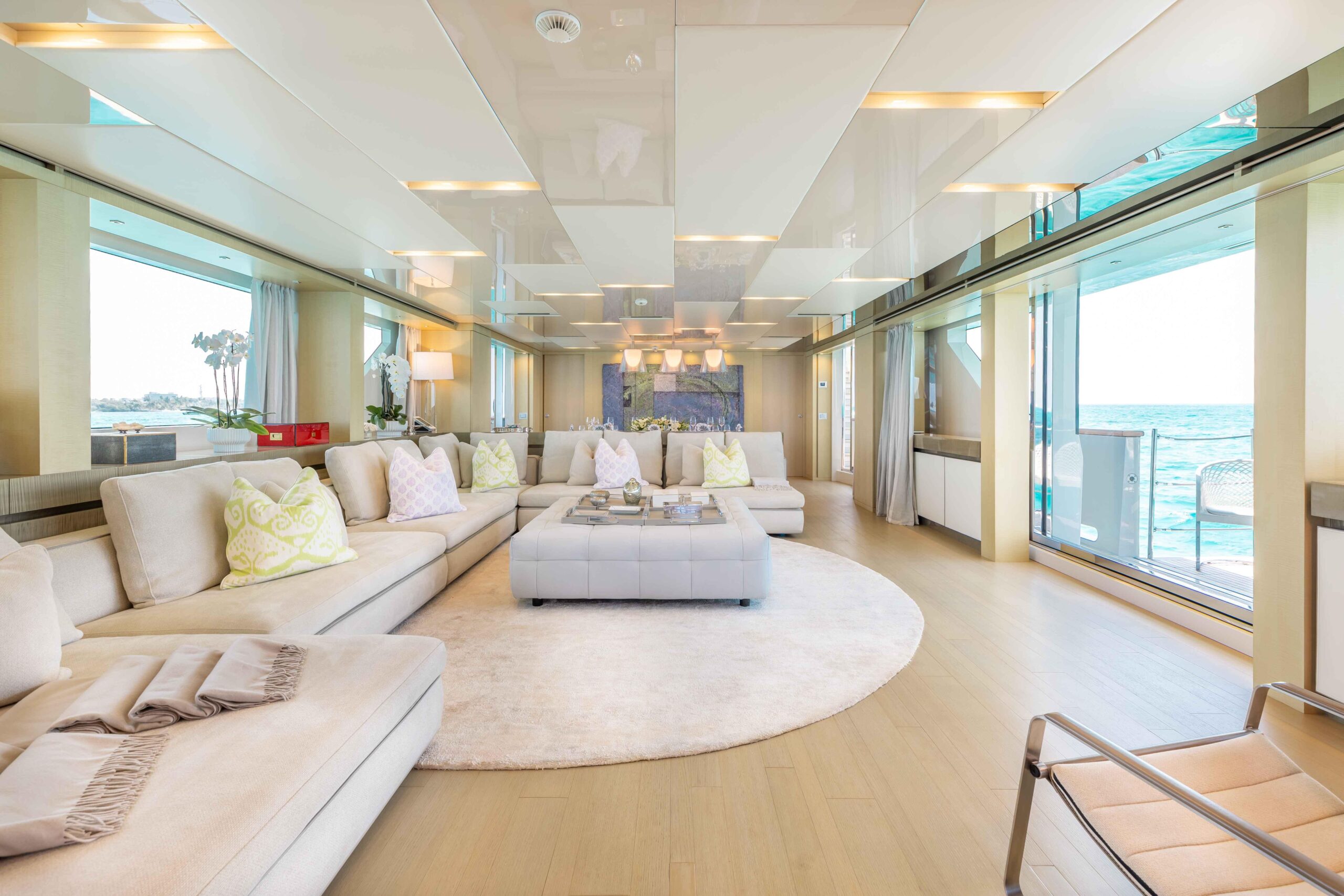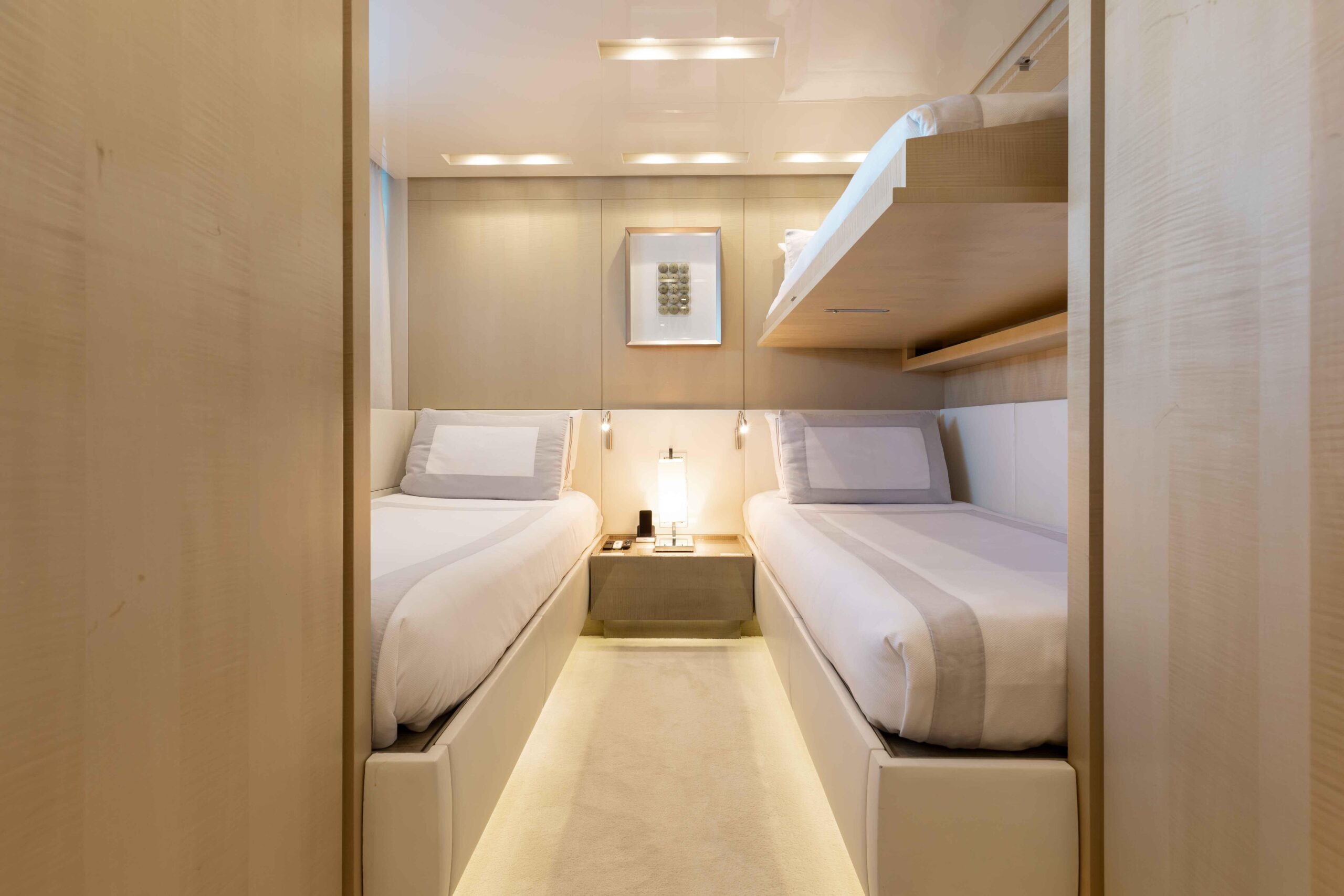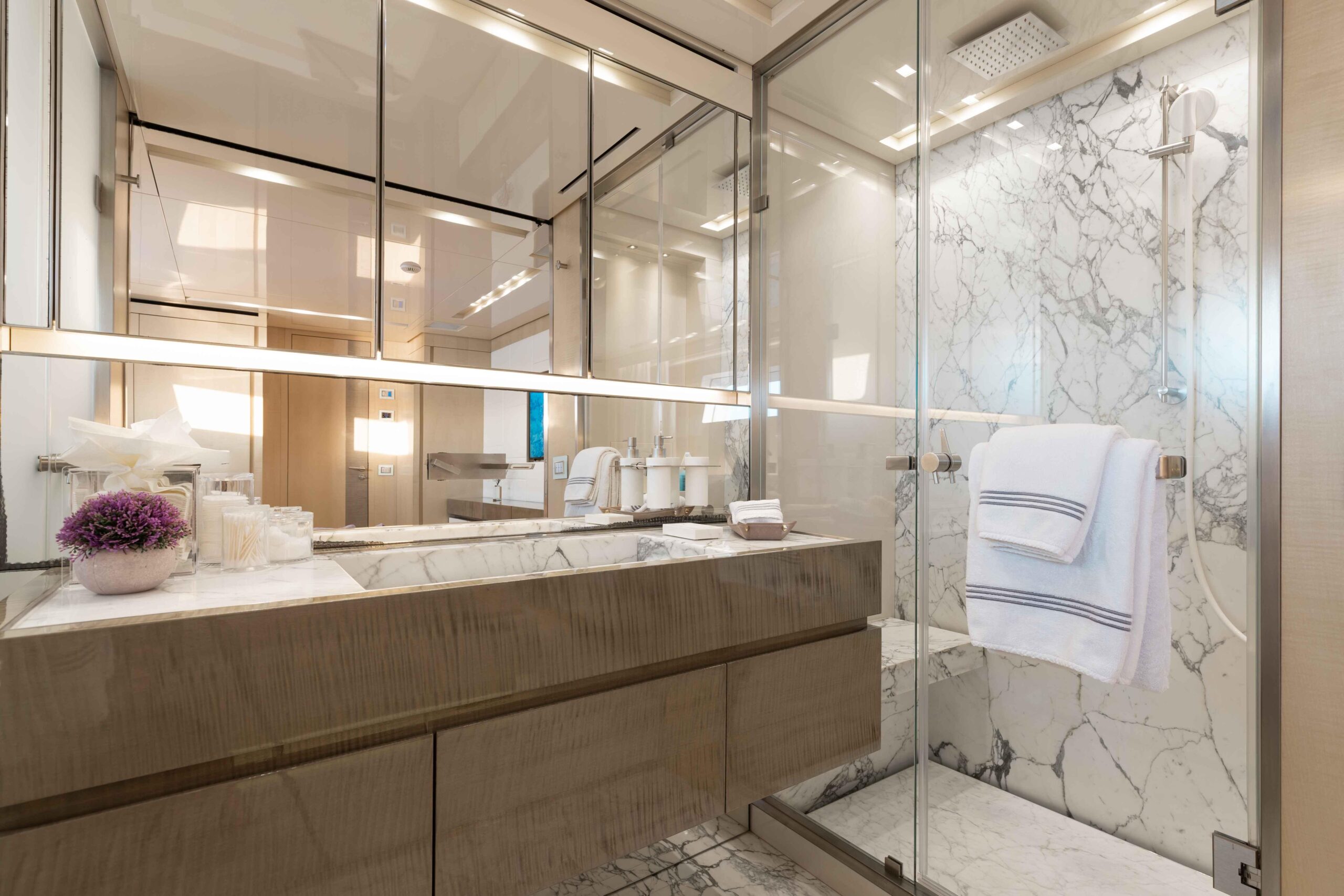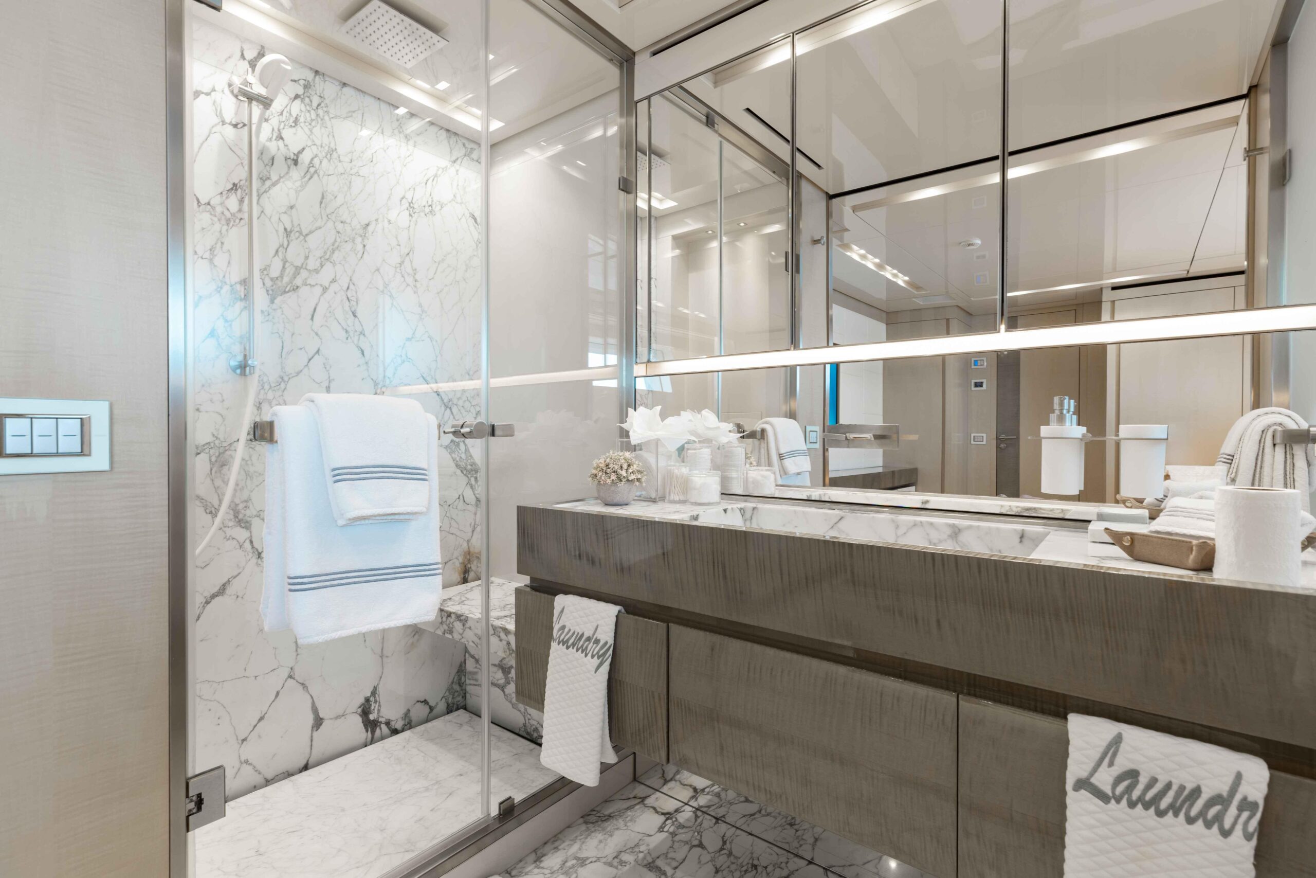 Salon terrace/balcony with lateral opening system Two (2) gull wing hull side doors in master stateroom Four (4) electric black out shades, in addition to standard drapery curtains: One for each lower deck stateroom (black out shades are standard in master stateroom) Three (3) berths hinging up with pistons (for additional storage): One for master berth and both VIP berths Three (3) Pullman berths: One in each guest stateroom and in captain's cabin Stateroom night stands include mobile device storage drawers incorporated with USB plugs Indirect LED lighting throughout Five (5) overhead rain showers: One for master shower and each VIP/guest shower Master spa shower experience for two: Steam showers and a Dornbracht horizontal/reclining shower system that combines six water bars above a reclining space. Three pre programmed choreography selections for balancing, energizing or de stressing effects. Three (3) additional safes: One in each VIP stateroom and in captain's cabin Two (2) sets of custom Italian embroidered bed and bath linens. Dishware and cutlery for twelve (12) on the main deck, and an additional twelve (12) for the upper deck. Bar glassware at the main and upper deck bars. Upgraded Interior Décor: Light matte stained Fiddleback Maple bulkheads interspersed with gloss lacquer panels. Gloss lacquer, leather and reflective ceiling combinations throughout. Random planked, grey stained wood flooring throughout. Leather panel trim on bulkheads staircase areas, various companionways and bulkheads in VIP staterooms. Stacked marble main staircase wall and additional marble appointments in the heads. Grey stained Fiddleback Maple and high gloss lacquer in staterooms with topstitched leather panels framed in matte stainless steel. CEA stainless steel taps and plumbing fixtures. Leather on all bed frames. Upgraded interior furnishings throughout. Luxe carpet on the main deck and upper deck salons. Decorative, hand‐loomed ombre toned area rugs for the main and upper deck salons. Exquisitely designed furniture from Minotti, Flexform, Molteni and FLOS used throughout the main deck and upper deck. Main salon features commissioned full‐panel artwork and colorful hand blocked IKATwaterways and commissioned art panels.decorative throw pillows. Crystal tables in the upper deck. Decorative forward door in the upperdeck salon. Skylounge features details from reclaimed mooring posts from the Venetian