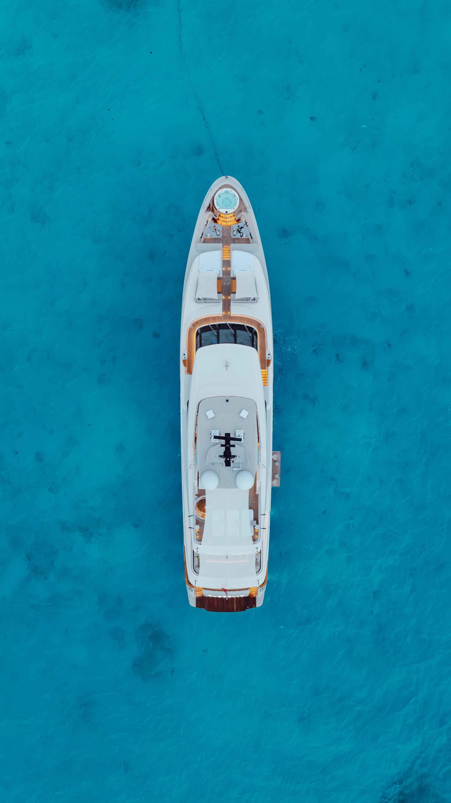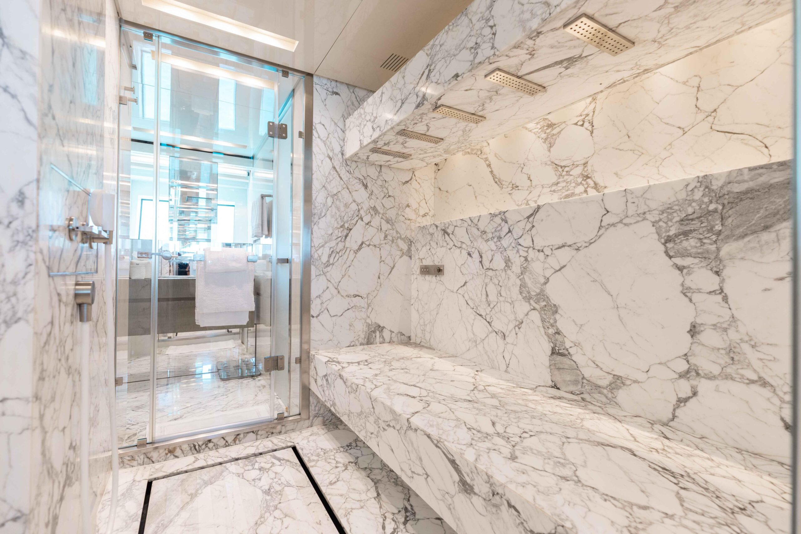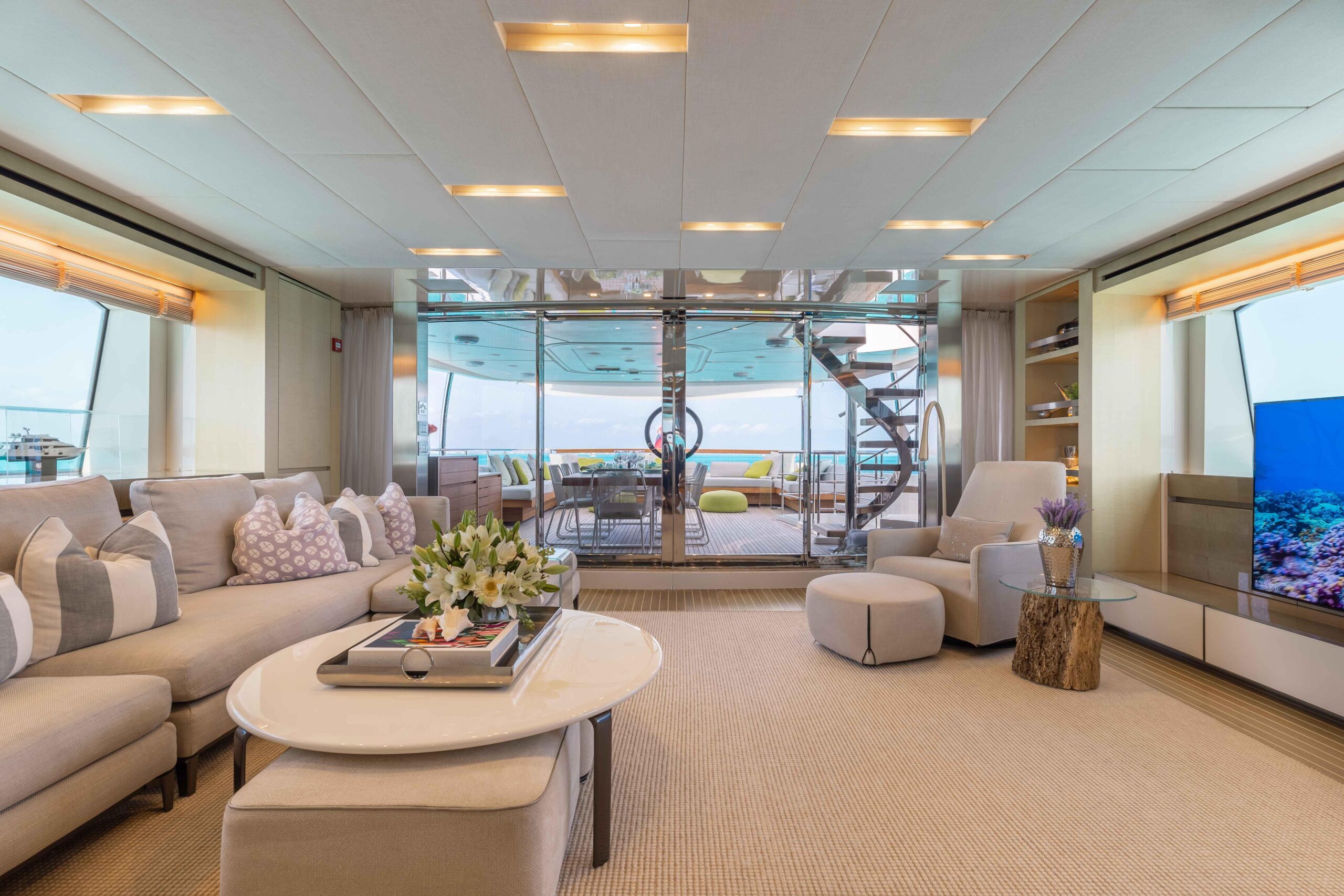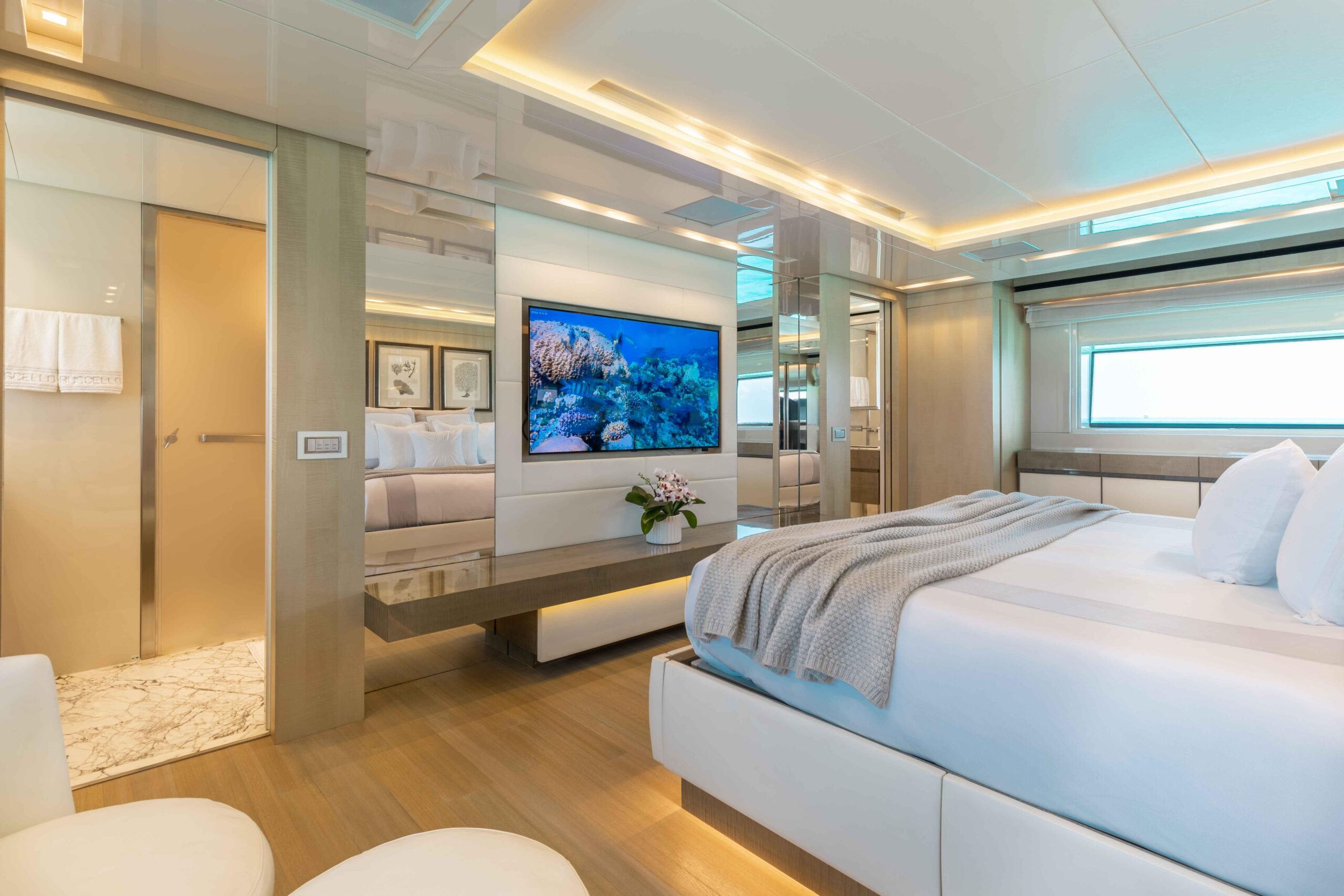 Salon terrace/balcony with lateral opening system Two (2) gull wing hull side doors in master stateroom Four (4) electric black out shades, in addition to standard drapery curtains: One for each lower deck stateroom (black out shades are standard in master stateroom) Three (3) berths hinging up with pistons (for additional storage): One for master berth and both VIP berths Three (3) Pullman berths: One in each guest stateroom and in captain's cabin Stateroom night stands include mobile device storage drawers incorporated with USB plugs Indirect LED lighting throughout Five (5) overhead rain showers: One for master shower and each VIP/guest shower Master spa shower experience for two: Steam showers and a Dornbracht horizontal/reclining shower system that combines six water bars above a reclining space. Three pre programmed choreography selections for balancing, energizing or de stressing effects. Three (3) additional safes: One in each VIP stateroom and in captain's cabin Two (2) sets of custom Italian embroidered bed and bath linens. Dishware and cutlery for twelve (12) on the main deck, and an additional twelve (12) for the upper deck. Bar glassware at the main and upper deck bars. Upgraded Interior Décor: Light matte stained Fiddleback Maple bulkheads interspersed with gloss lacquer panels. Gloss lacquer, leather and reflective ceiling combinations throughout. Random planked, grey stained wood flooring throughout. Leather panel trim on bulkheads staircase areas, various companionways and bulkheads in VIP staterooms. Stacked marble main staircase wall and additional marble appointments in the heads. Grey stained Fiddleback Maple and high gloss lacquer in staterooms with topstitched leather panels framed in matte stainless steel. CEA stainless steel taps and plumbing fixtures. Leather on all bed frames. Upgraded interior furnishings throughout. Luxe carpet on the main deck and upper deck salons. Decorative, hand‐loomed ombre toned area rugs for the main and upper deck salons. Exquisitely designed furniture from Minotti, Flexform, Molteni and FLOS used throughout the main deck and upper deck. Main salon features commissioned full‐panel artwork and colorful hand blocked IKATwaterways and commissioned art panels.decorative throw pillows. Crystal tables in the upper deck. Decorative forward door in the upperdeck salon. Skylounge features details from reclaimed mooring posts from the Venetian