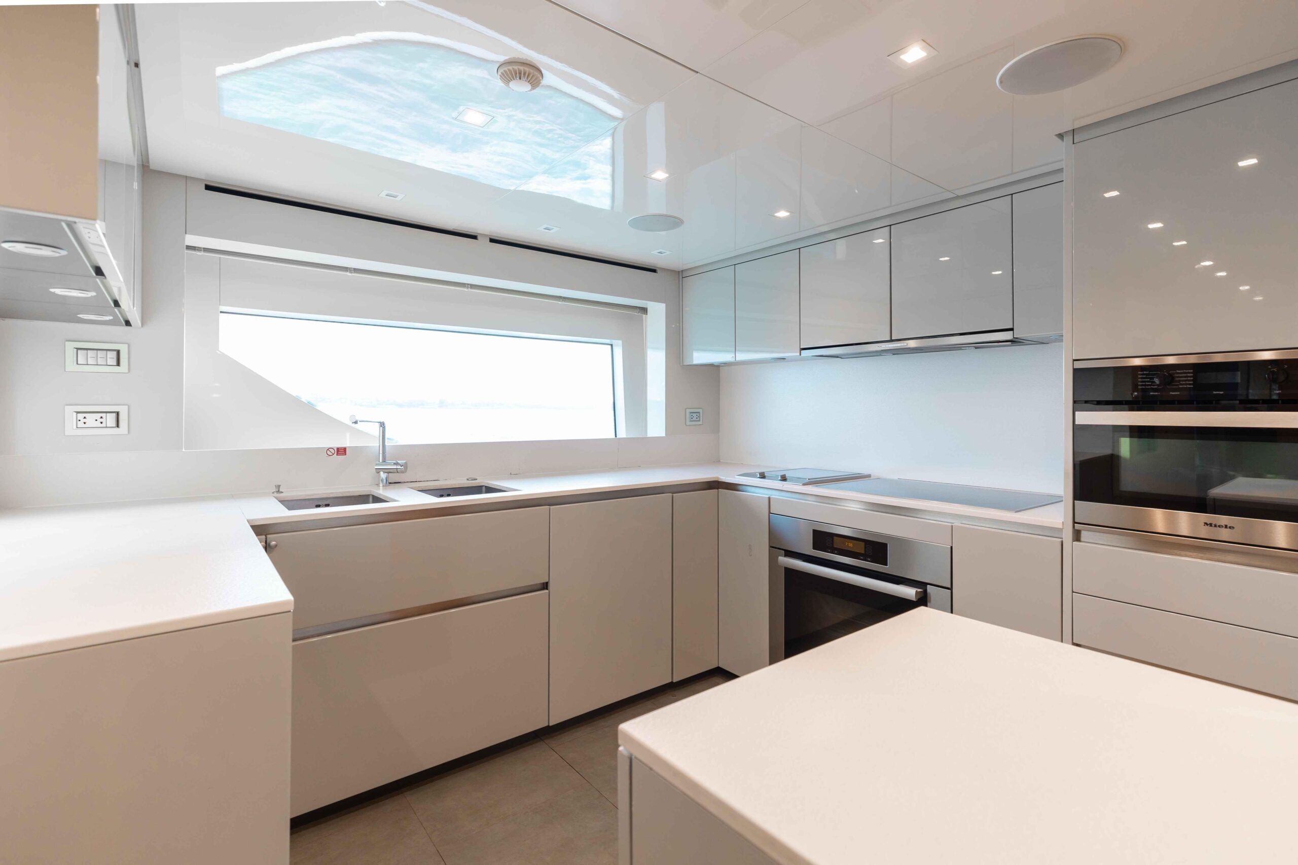 Washing machine: Miele Dryer: Miele Cooktop: Miele Microwave: Sharp (upgraded below to Miele speed oven) Oven: Miele Dishwasher: Miele Upright refrigerator/freezer: Two (2) Sub‐Zero series with drawers and overlay panels (one with ice maker) Wine cooler: 100 bottle wine cooler Ventilation fan: Miele Sink/food waste disposal in upper deck pantry Salon bar refrigerator: Sub‐Zero 24" Salon bar ice maker: Subzero Upper deck bar refrigerator: Sub‐Zero 24" Upper deck bar ice maker: Scotsman Flybridge refrigerator: Frigonautica Flybridge ice maker: U‐Line Teppan Yaki: Miele Ironing Miele - in storage Broan Elite trash compactor KENYON Texan electric BBQ grill for upper deck, in lieu of standard Miele Additional Miele undercounter fridge in crew mess Liebherr freezer in crew mess