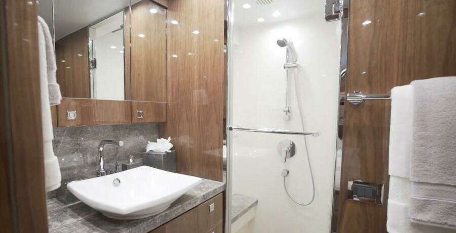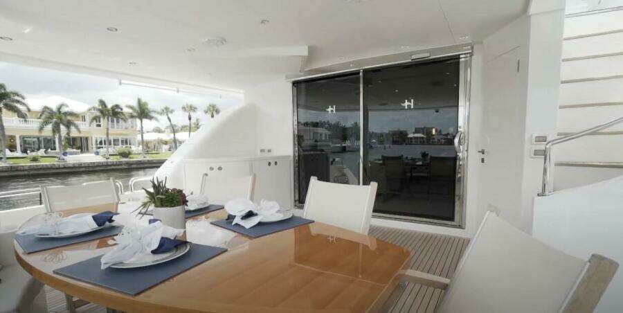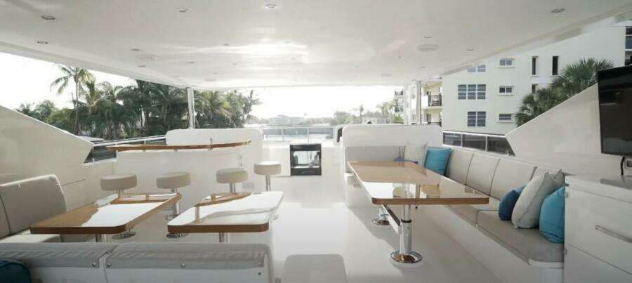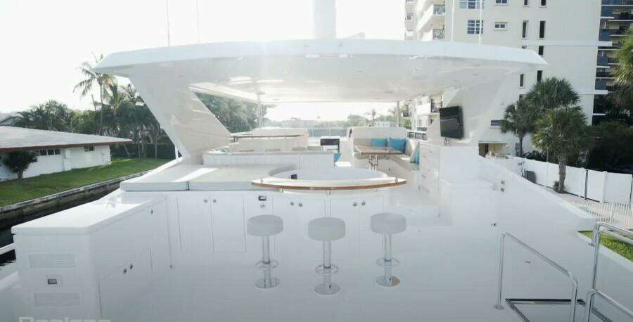 Her rich, high gloss walnut joinery and maple cabinetry compliment her custom interior by Shelley DiCondina featuring color palette of light taupe, silver and white. Exterior dining areas are provided on the aft deck with a large dining table with five teak chairs and aft bench seat. Up on the expansive sun deck there is ample seating for up to (24) people, dining areas, bar, shaded sunpads, gas grill and a bult-in hot tub. On the boat deck is a 15' AB tender and Marquipt 2000 lb davit.