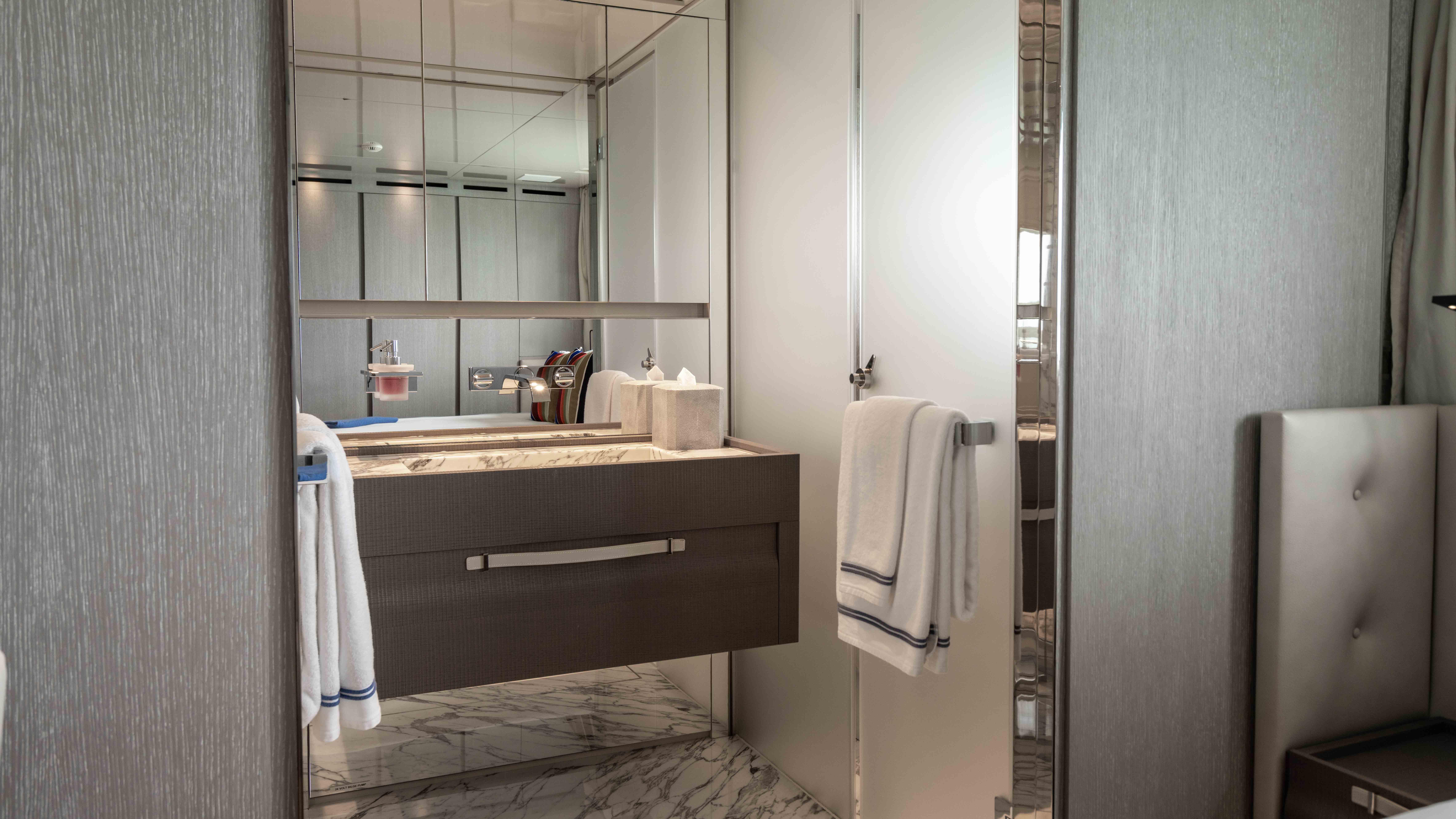 A bright and airy interior with neutral-colored accommodations, HONEY POT has 5 cabins for 10 guests, including an on-deck master stateroom, two VIP suites, two doubles, one of which is a convertible arrangement to convert from two twins to a single queen, all with entertainment centers; television screens and ensuite bathroom facilities. In addition, there are quarters for up to 5 crew in three cabins.