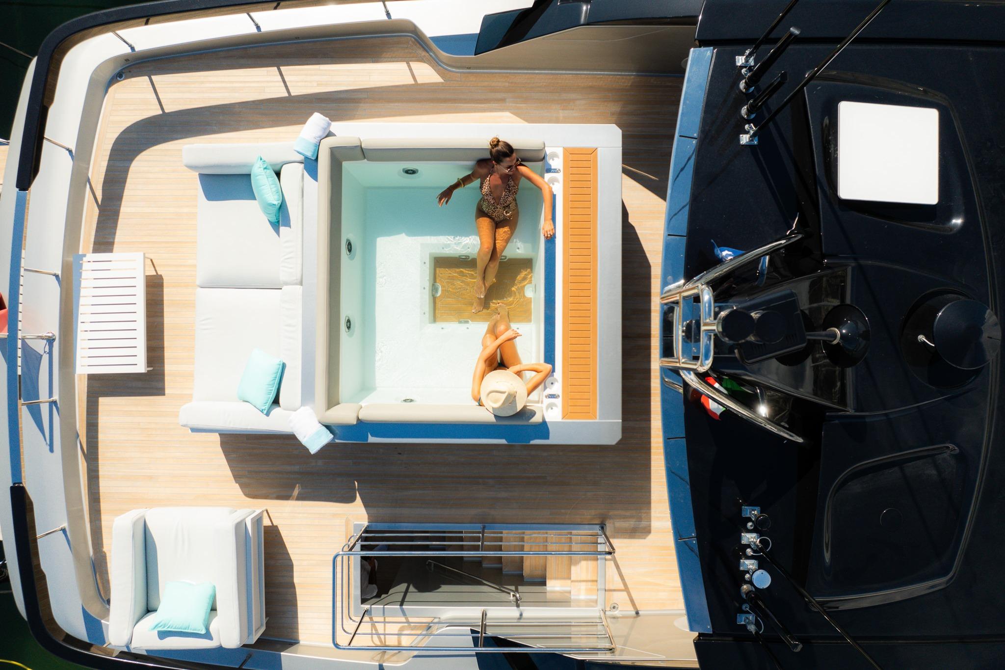 Flybridge: with wet bar, dining, lounge seating, and bespoke Splash-Tec spa.