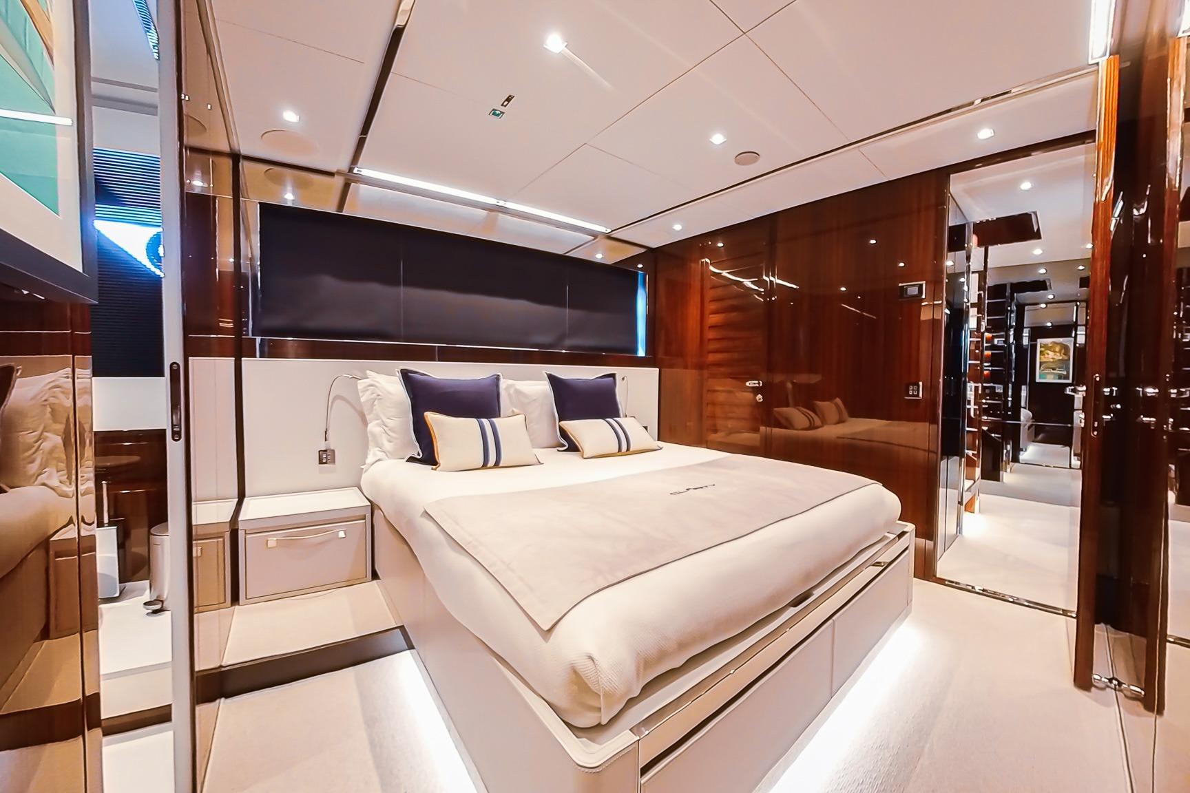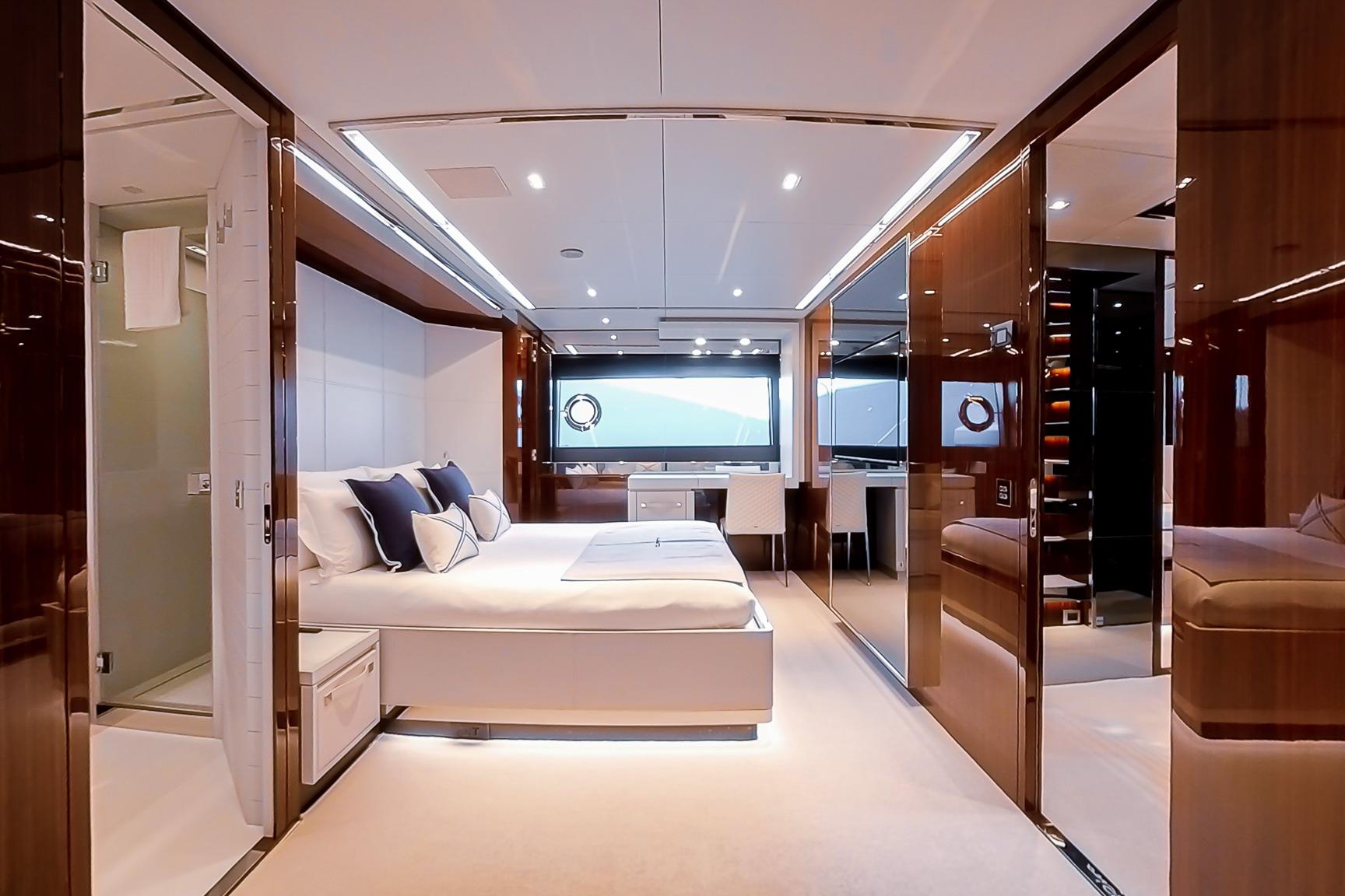 Wide body concept with full-beam master suite on the main deck. - Infinity deck concept linking flybridge and bow area.