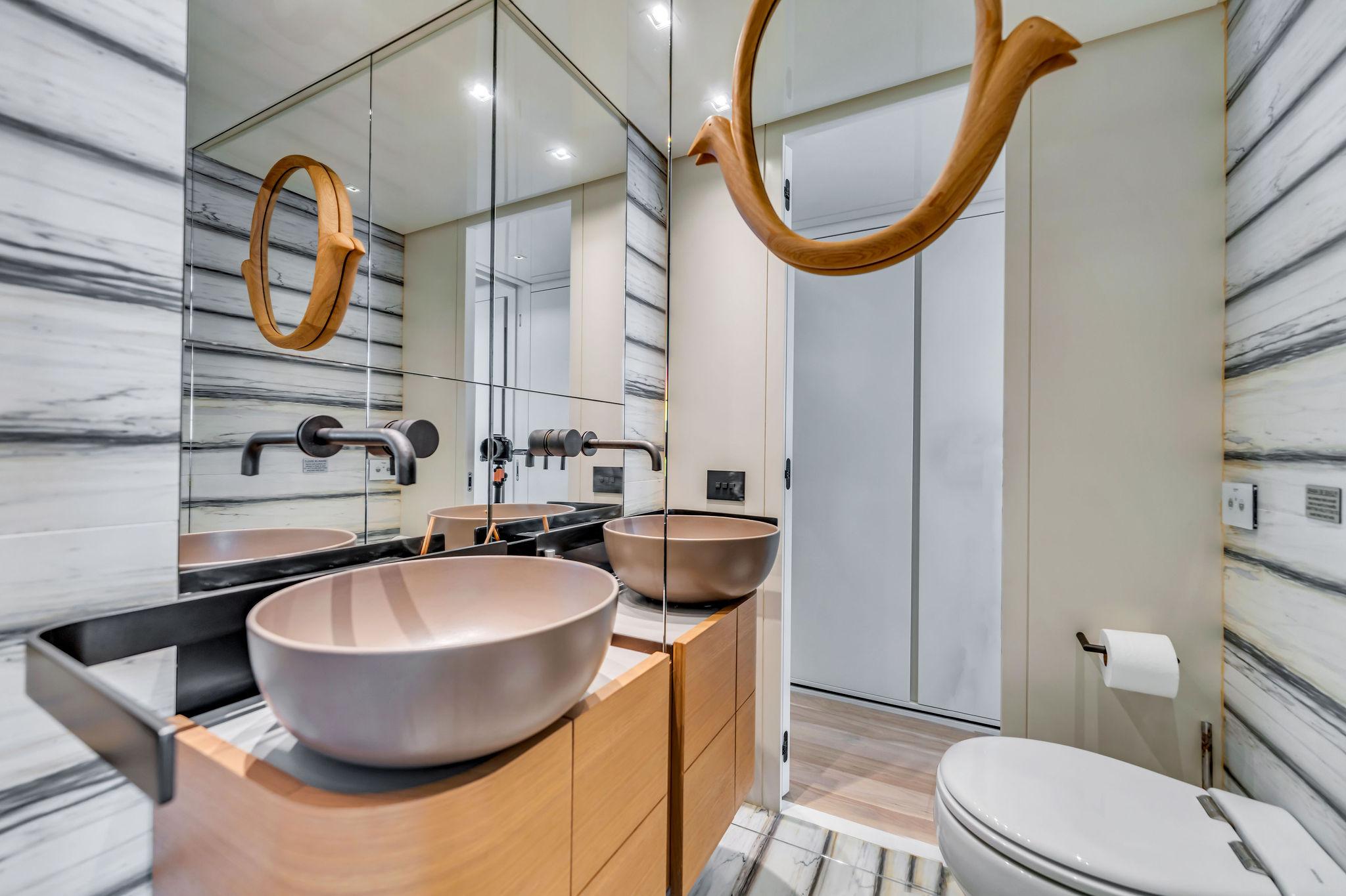 Designed by Zuccon International Project with a Marty Lowe interior, NOTYNOG offers a sophisticated and modern aesthetic. The asymmetric main deck layout maximizes space, featuring a spacious main salon with expansive windows, high-end furniture from Poltrona Frau, Minotti, and Bonaldo, and a large dining area for up to 8 guests. Guest accommodations include 4 luxurious cabins, including a full-beam master suite with an electric skylight, VIP suite, and 2 guest cabins, all with ensuite bathrooms finished in fine marble. Additionally, NOTYNOG provides comfortable crew accommodations for up to 4, including a dedicated crew mess, ensuring a premium service experience.