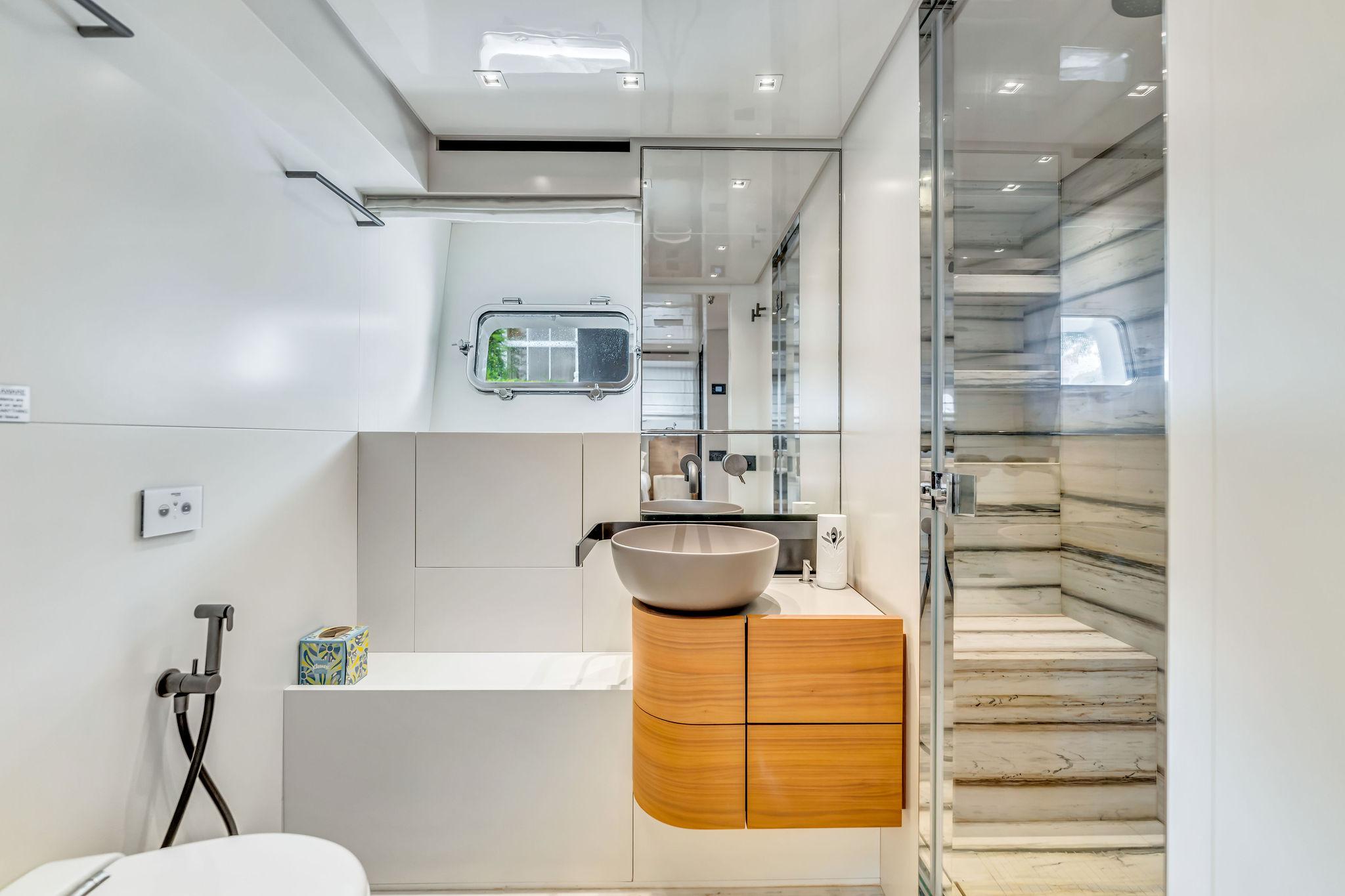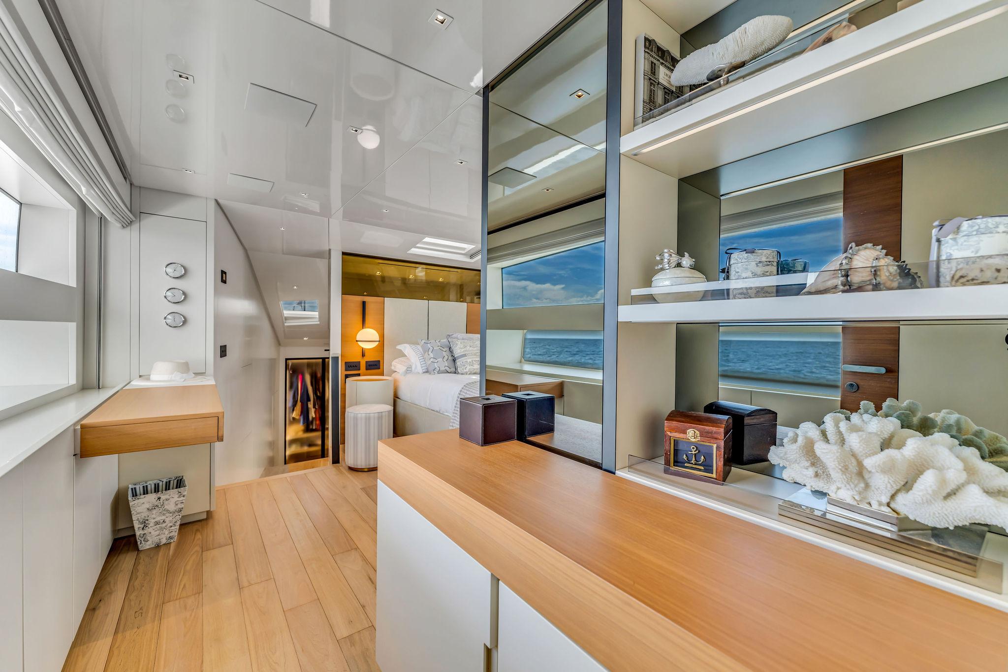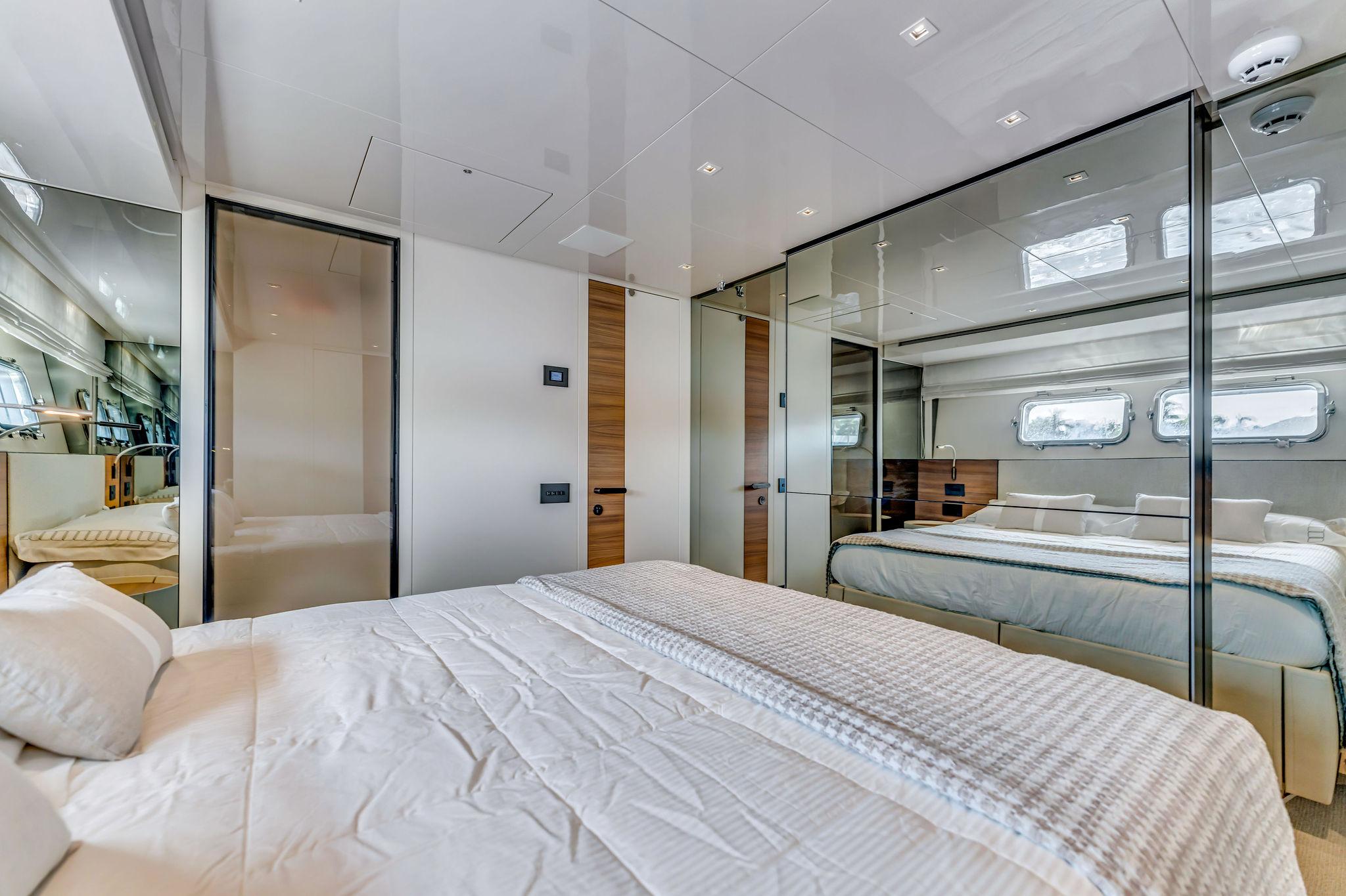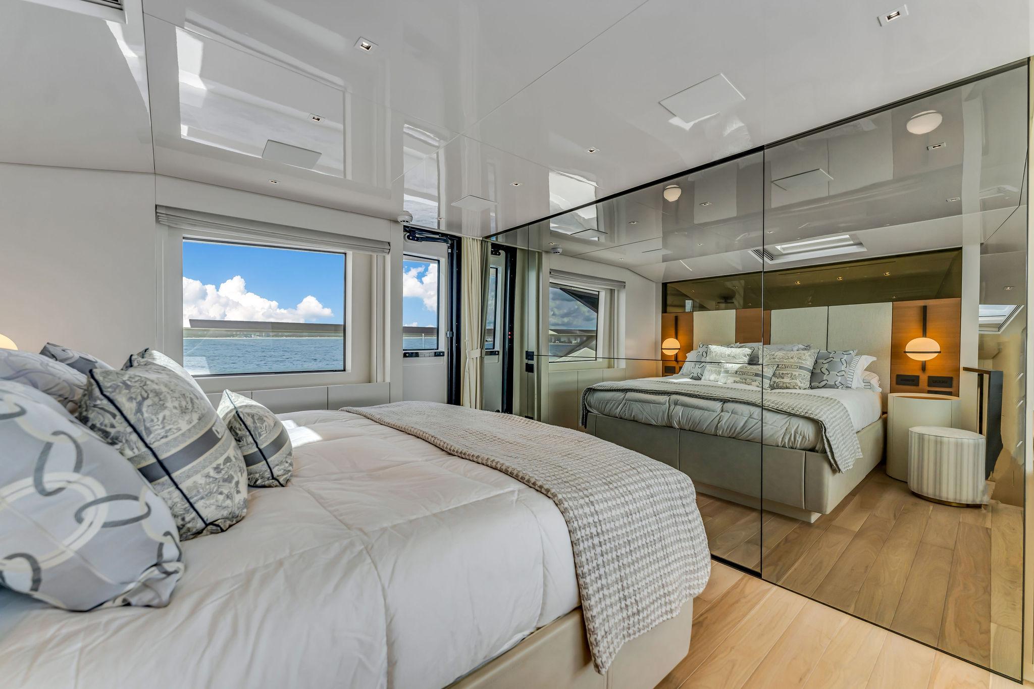 Moving forward on the port side, you pass a striking open-glass staircase leading to the lower cabins. A pocket privacy door separates the main salon from the dayhead and master suite. The full-beam master retreat is designed for ultimate comfort, featuring a king-size bed to starboard, a built-in desk to port, and a hidden television elegantly concealed behind a mirrored panel. Expansive windows on both sides offer breathtaking views, while an electric door provides direct access to the starboard-side main deck. The luxurious en-suite, accessed down a single step to port, boasts dual sinks, a glass-enclosed shower with marble finishes, and a skylight that bathes the space in natural light. Beyond the en-suite, two additional steps lead to an expansive walk-in closet with ample hanging storage.