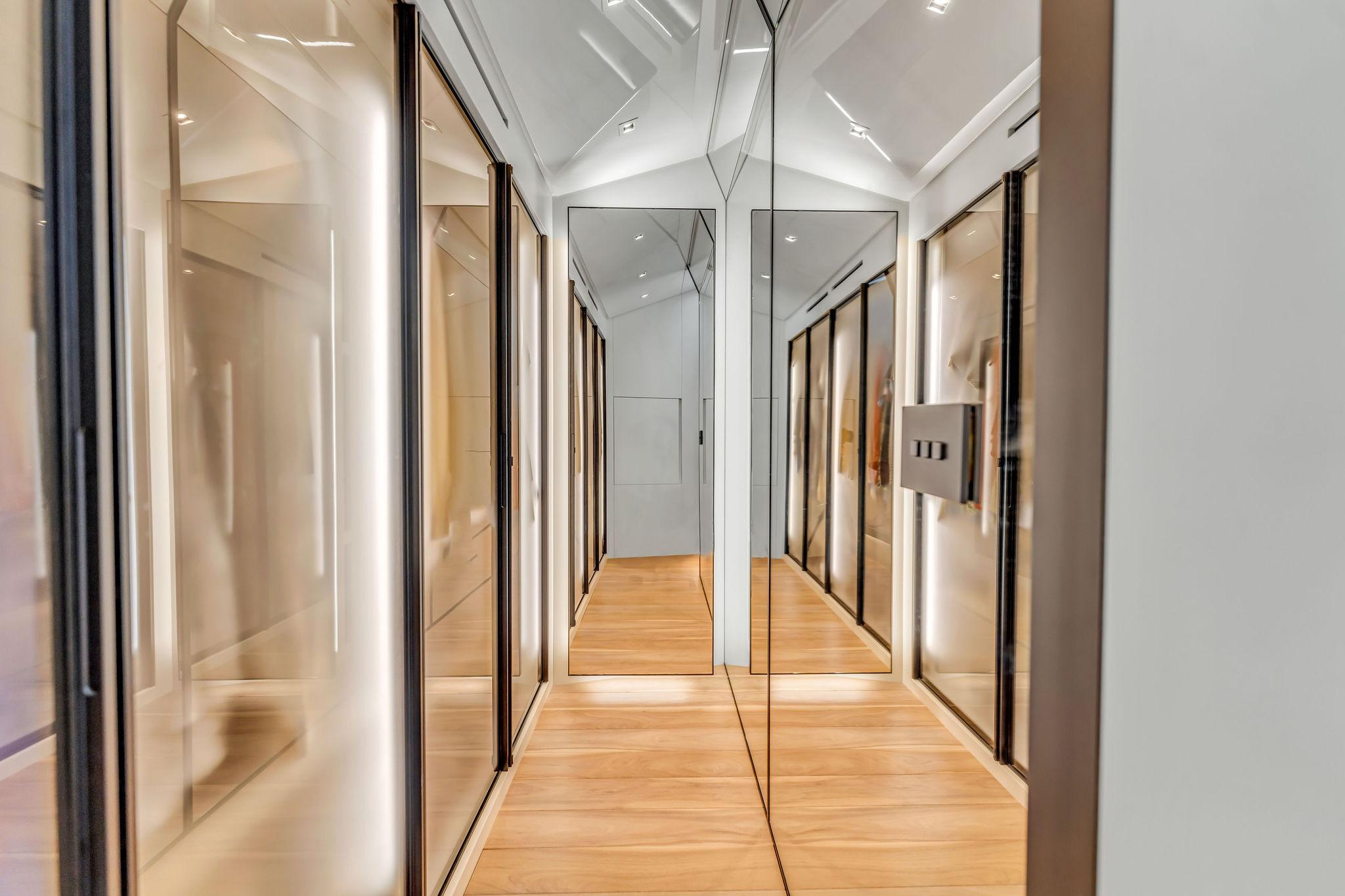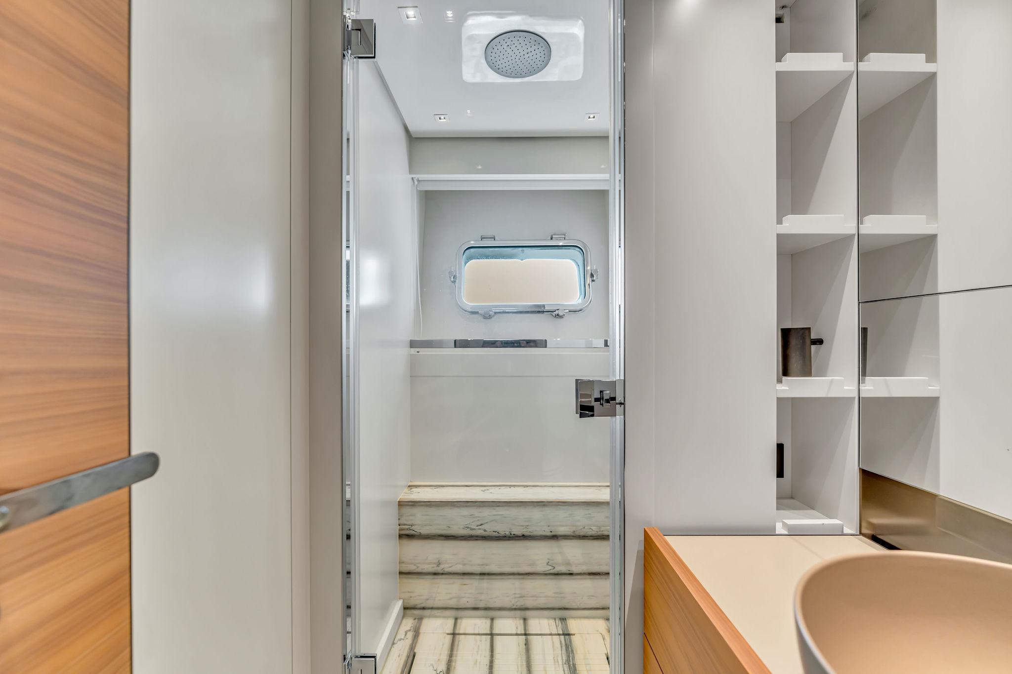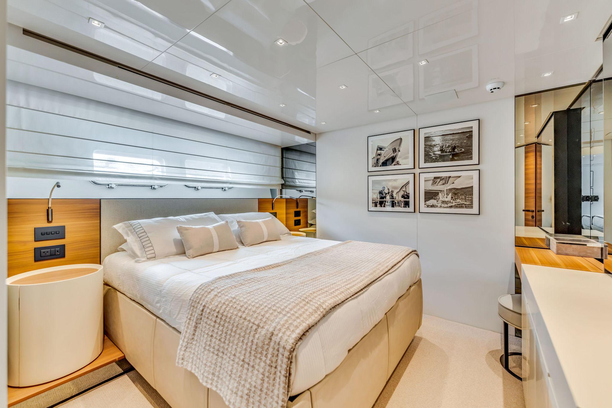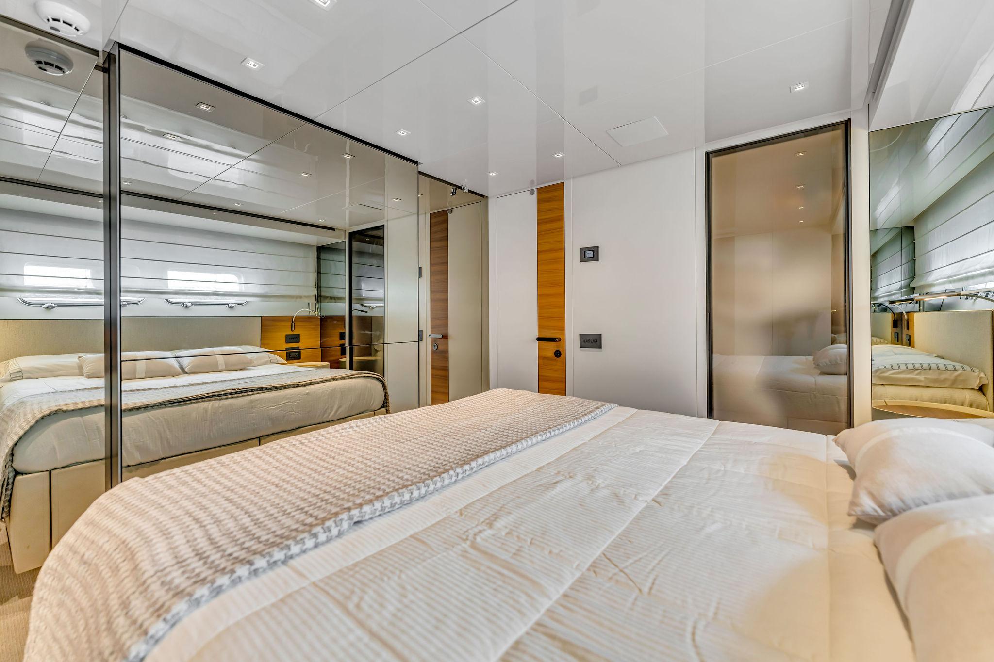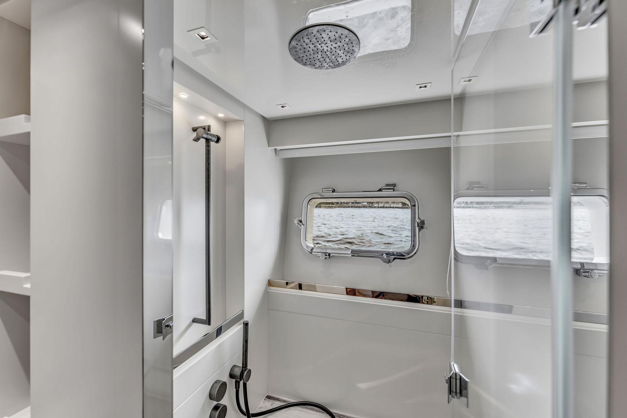 Moving forward on the port side, you pass a striking open-glass staircase leading to the lower cabins. A pocket privacy door separates the main salon from the dayhead and master suite. The full-beam master retreat is designed for ultimate comfort, featuring a king-size bed to starboard, a built-in desk to port, and a hidden television elegantly concealed behind a mirrored panel. Expansive windows on both sides offer breathtaking views, while an electric door provides direct access to the starboard-side main deck. The luxurious en-suite, accessed down a single step to port, boasts dual sinks, a glass-enclosed shower with marble finishes, and a skylight that bathes the space in natural light. Beyond the en-suite, two additional steps lead to an expansive walk-in closet with ample hanging storage.