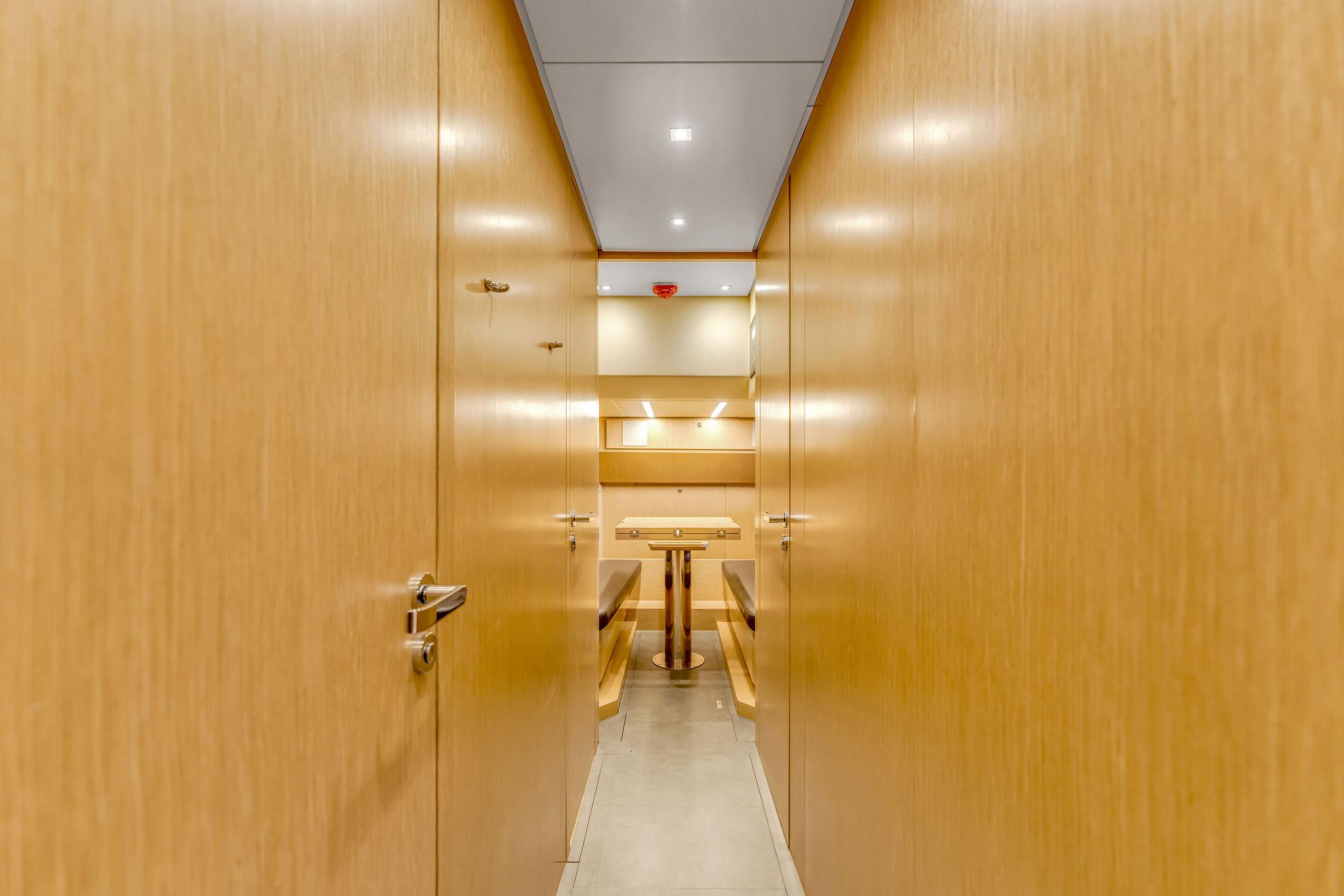 Descending a staircase forward of the galley, the crew quarters are designed for functionality and comfort. Two crew cabins--one to starboard, one to port--are fitted with over/under single berths and portholes, each featuring dedicated en-suite bathrooms with access located just outside the cabins. A stacked washer and dryer are conveniently positioned outside the port crew cabin. Further forward, the crew mess includes built-in seating around a table for four, providing a comfortable space for dining and downtime.
