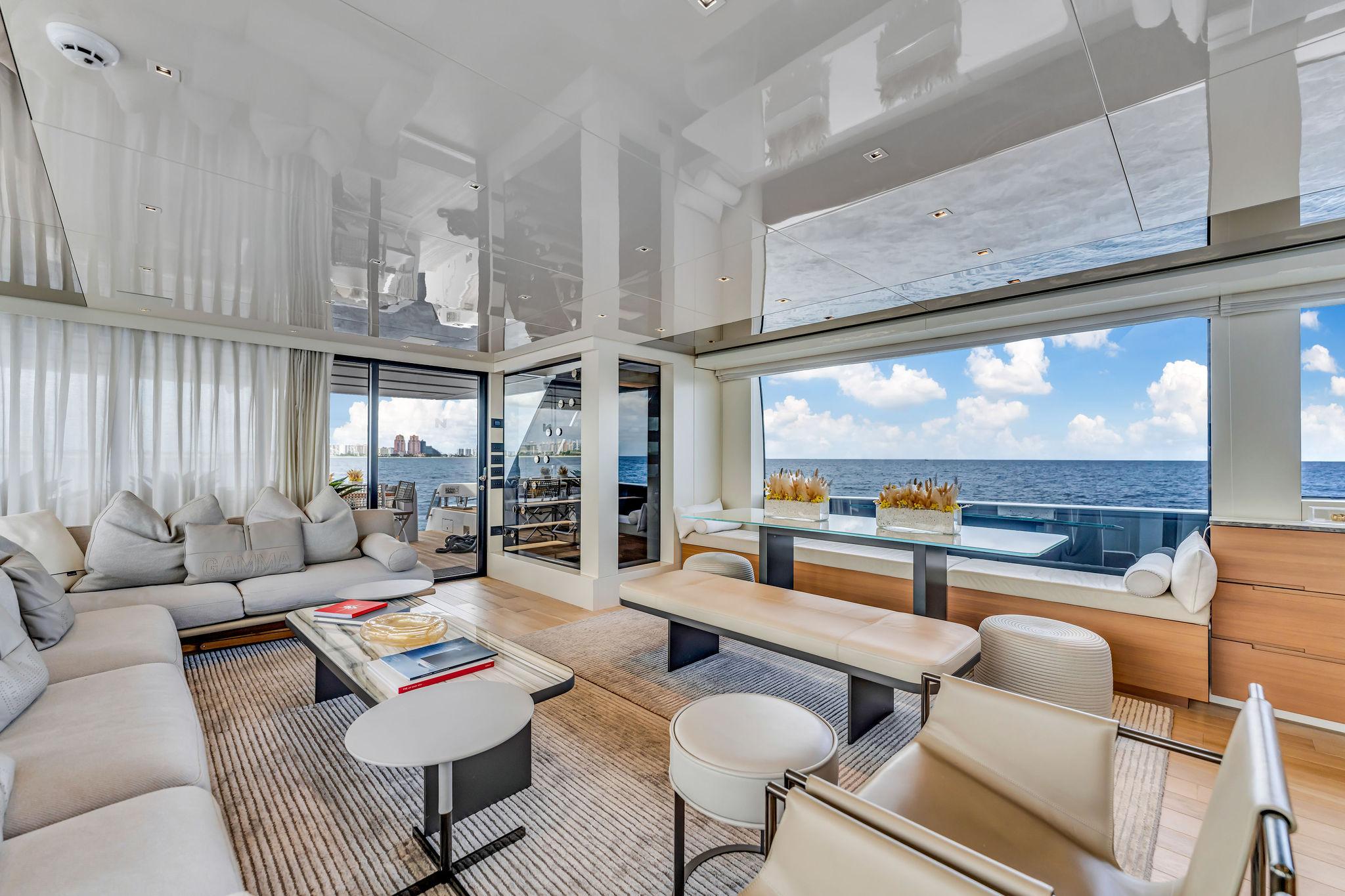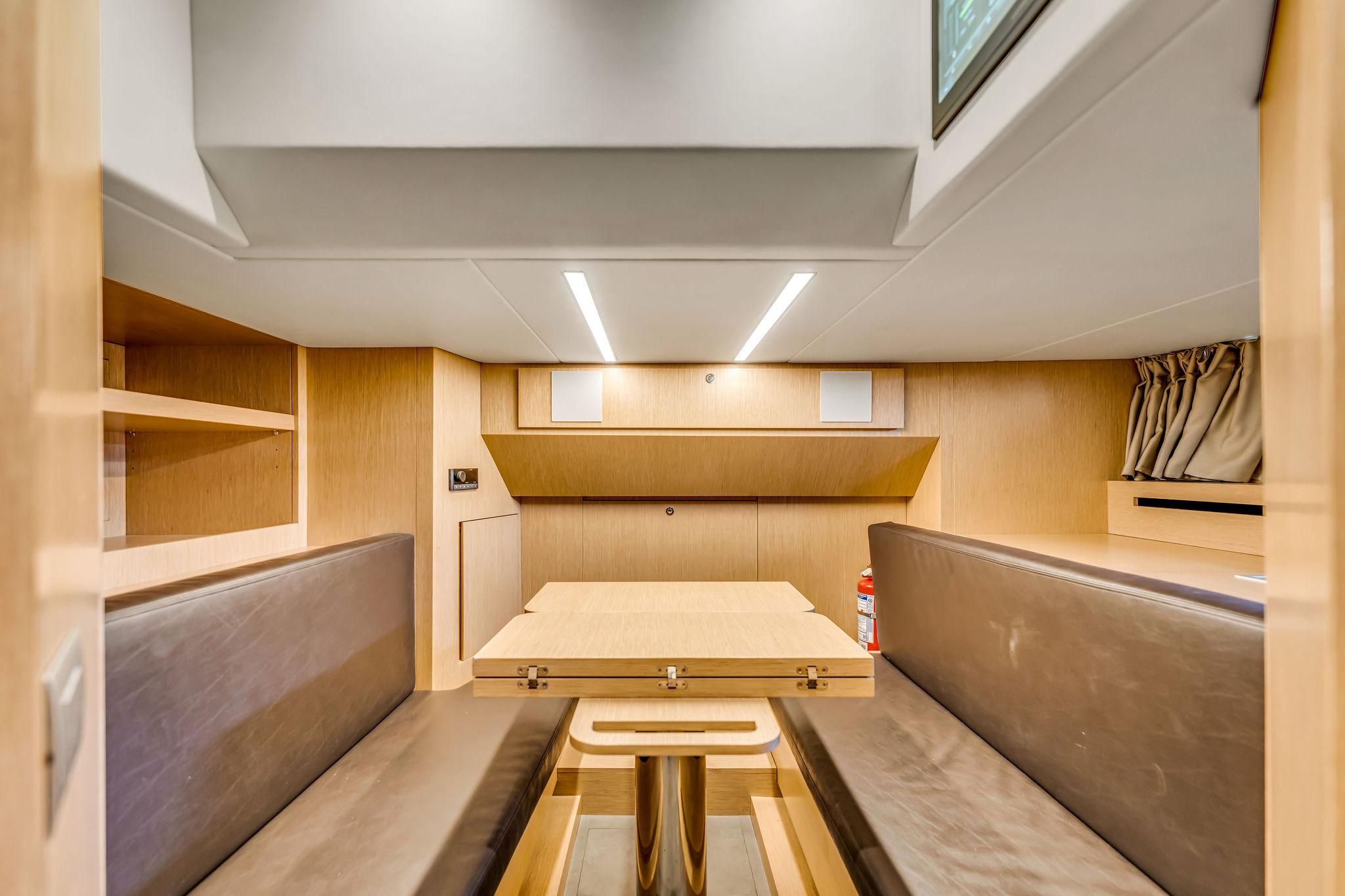 Entering the main salon through the port-side sliding door, you step into a spacious, beautifully appointed interior. A large L-shaped sofa to starboard creates a comfortable lounge area, accompanied by two modern loose chairs and a coffee table. To port, the dining area is positioned to maximize space and natural light. A wall-mounted television is seamlessly integrated behind a mirrored glass panel, while built-in storage along the port side discreetly houses guest amenities. Expansive windows to port, starboard, and aft, flood the space with natural light, enhancing the inviting ambiance.