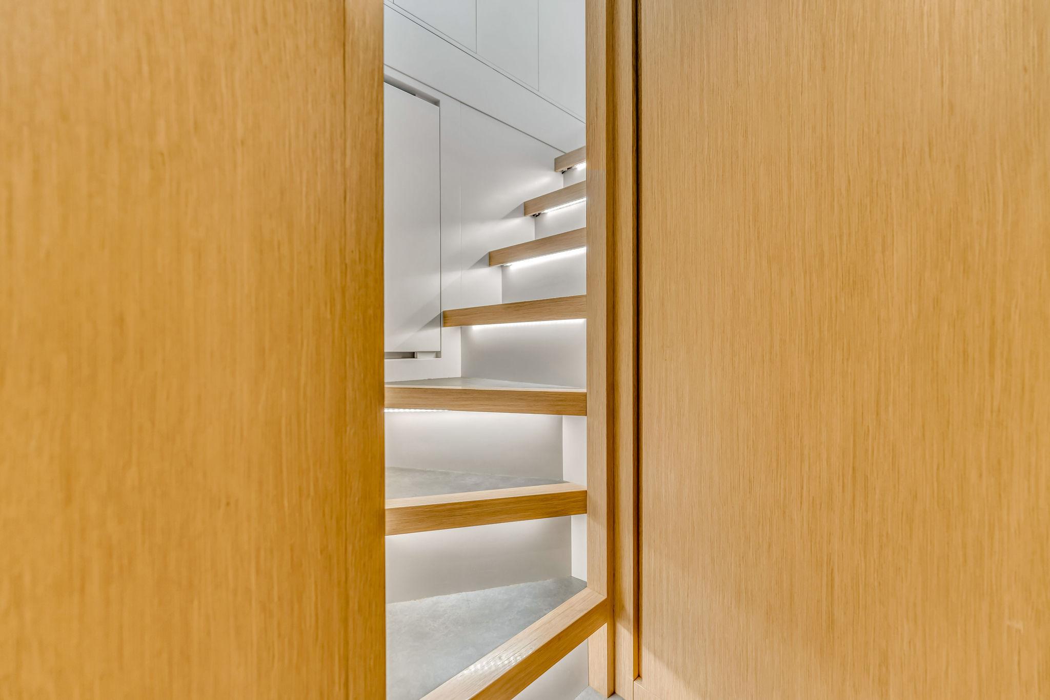 Returning to the port corridor outside the master suite, additional wall storage is available. Descending the staircase leads to the lower guest accommodations. Aft, two mirrored queen cabins offer refined comfort, each featuring hidden televisions, nightstands, natural light from portholes, and en-suite bathrooms with marble and glass showers. Forward, the VIP queen cabin offers the same luxurious amenities as well as a built-in desk. A sliding pocket door to starboard opens to a spacious en-suite bathroom with a marble shower, custom seat, and porthole.