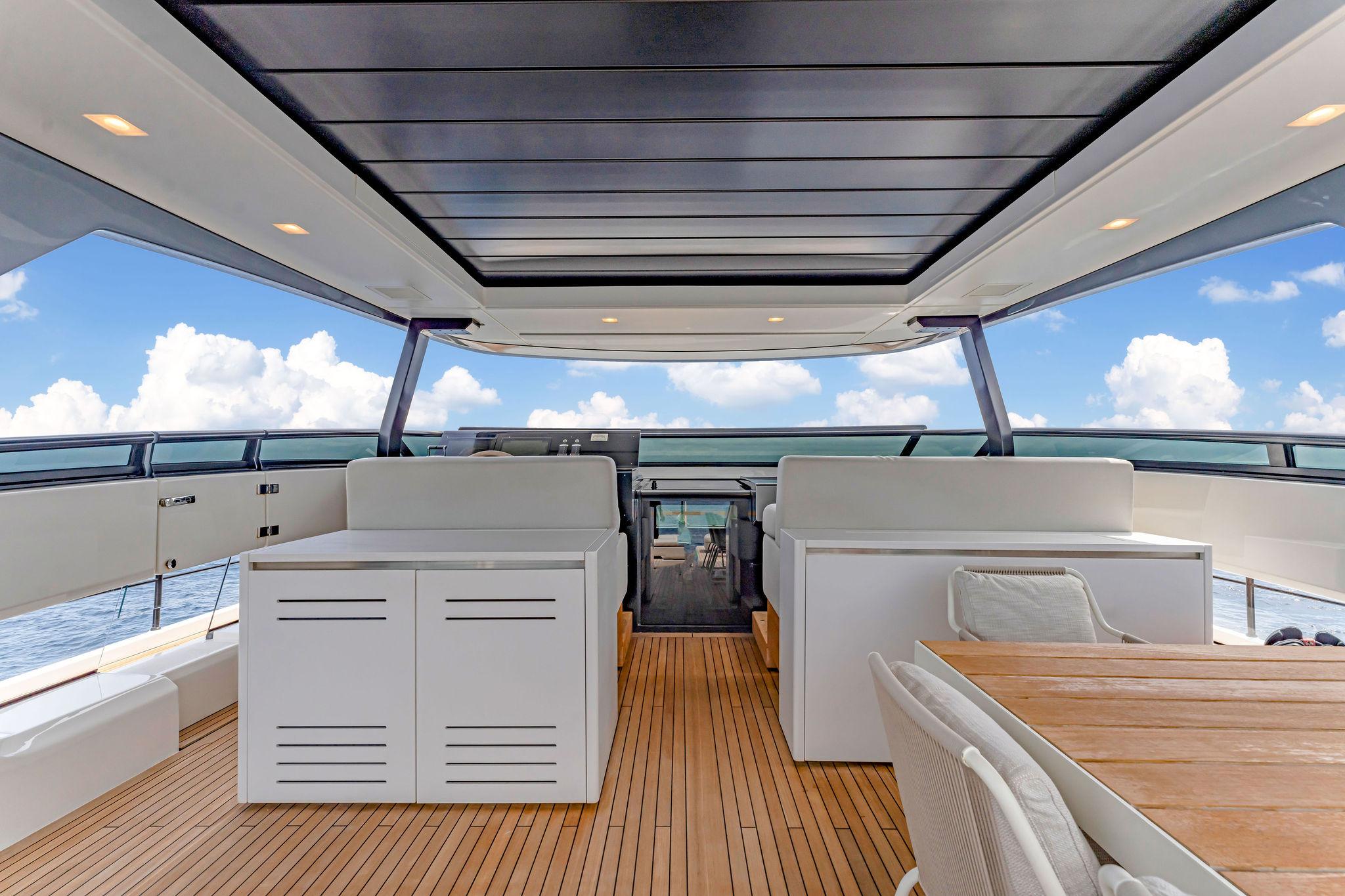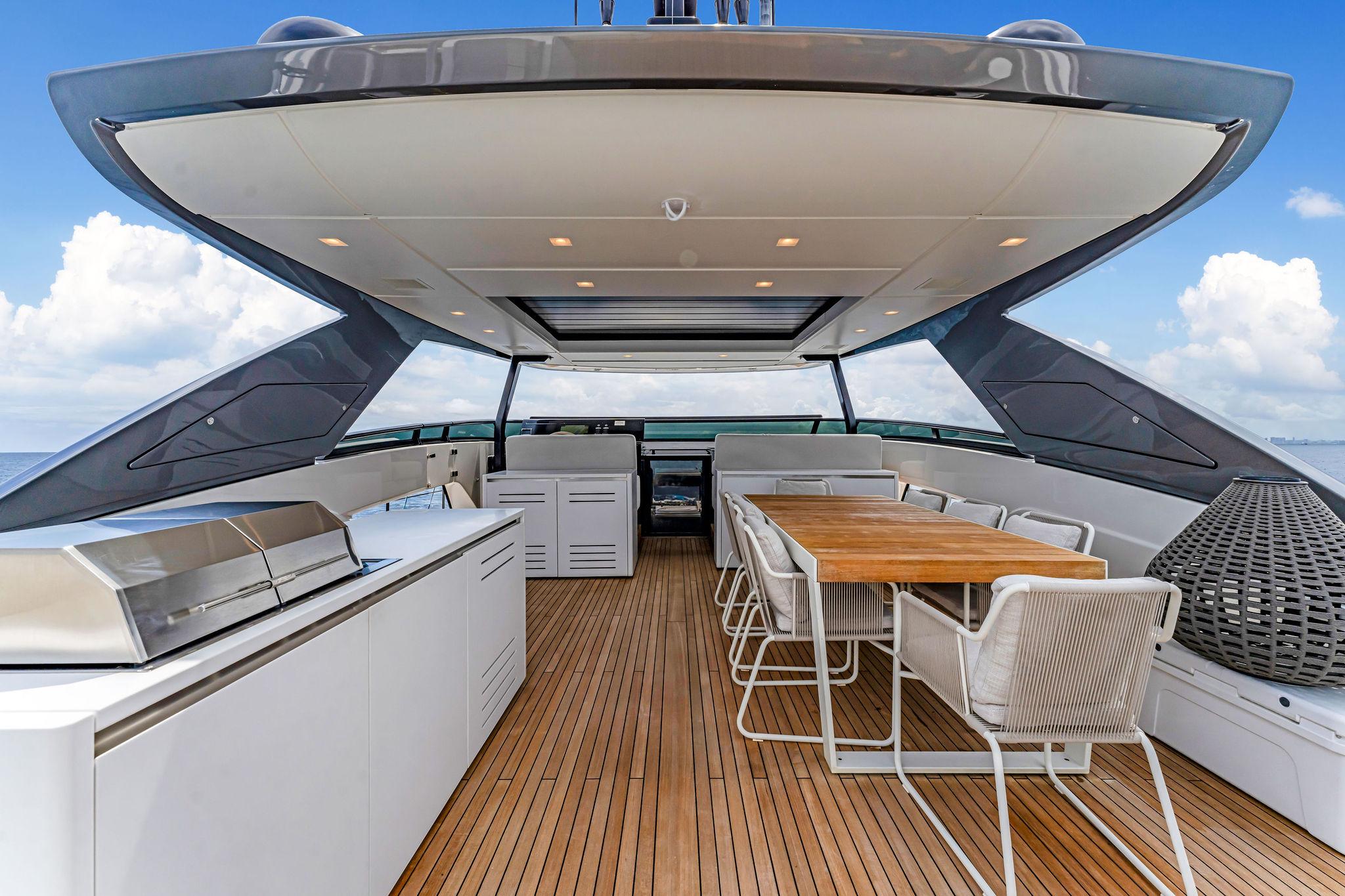 Stepping aboard NOTYNOG through the starboard-side boarding gate, you are welcomed onto the covered main aft deck--an elegantly designed space perfect for relaxation and entertainment. A built-in seating area invites guests to unwind, complemented by two electric up/down tables and five loose chairs for flexible dining arrangements, whether for intimate gatherings or larger social events. Additional boarding access is available via a port-side gate, while a portside pasarelle extends for easy boarding when docked stern-to.