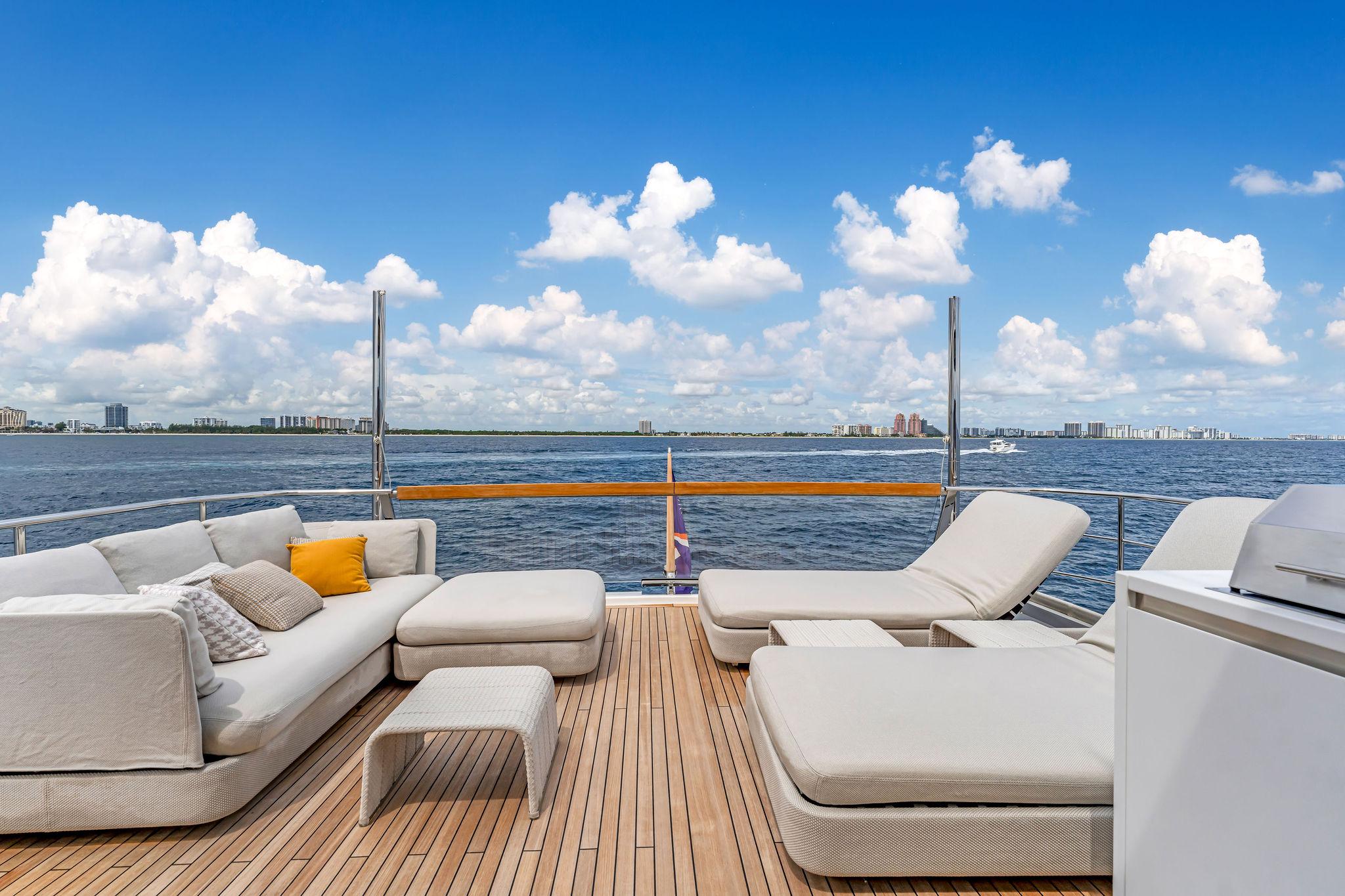 The flybridge is a highlight aboard NOTYNOG, offering multiple access points and an array of amenities, including a custom bar, sunbeds, a dining area for up to 8, and a louvered hardtop. The main deck aft features an integrated sofa, electric adjustable tables, and additional seating for relaxation or alfresco dining. Her bow area offers another sunbathing space with a built-in sofa and large sunpad. Teak decks throughout the vessel provide a seamless blend of luxury and practicality.